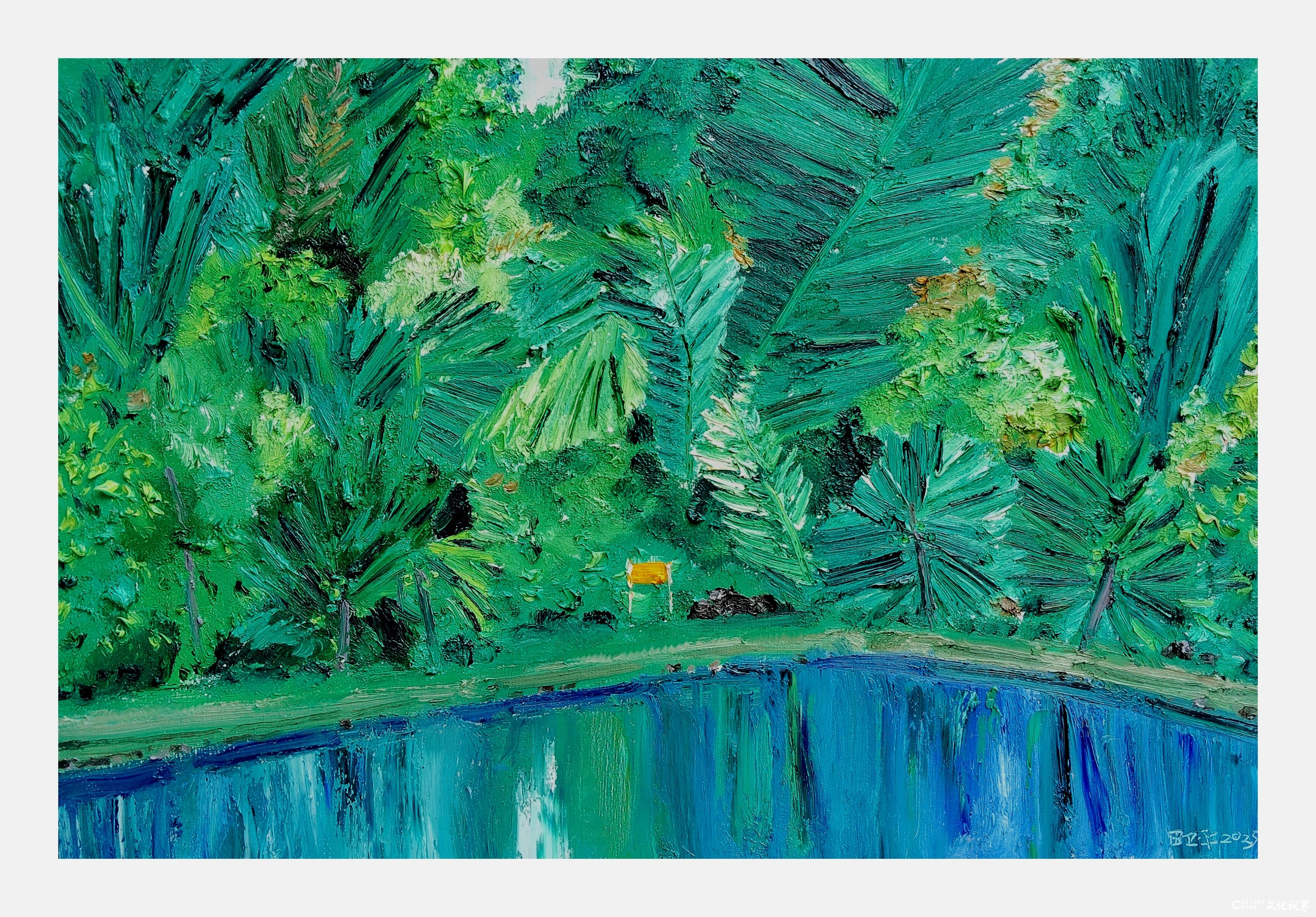 笔触肌理方面,艺术家发展出兼具书写性与建构性的独特技法。远景处理多采用薄涂晕染,呈现朦胧的诗意氛围;中景则以跳跃的短笔触堆叠色彩,形成类似书法飞白的节奏感;近景部分常见厚涂形成的浮雕式肌理,颜料本身的物质性在此获得独立审美价值。这种多层次的笔触组织方式,使平面画布产生时间性的阅读体验,观者的视线会随着笔触的走向在画面中游走,仿佛经历一场视觉的山水之旅。