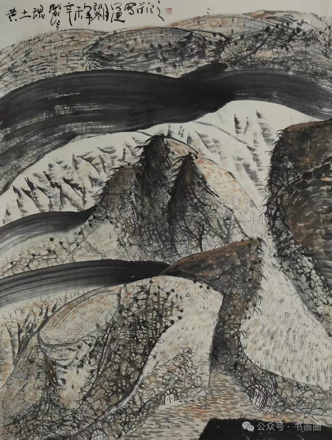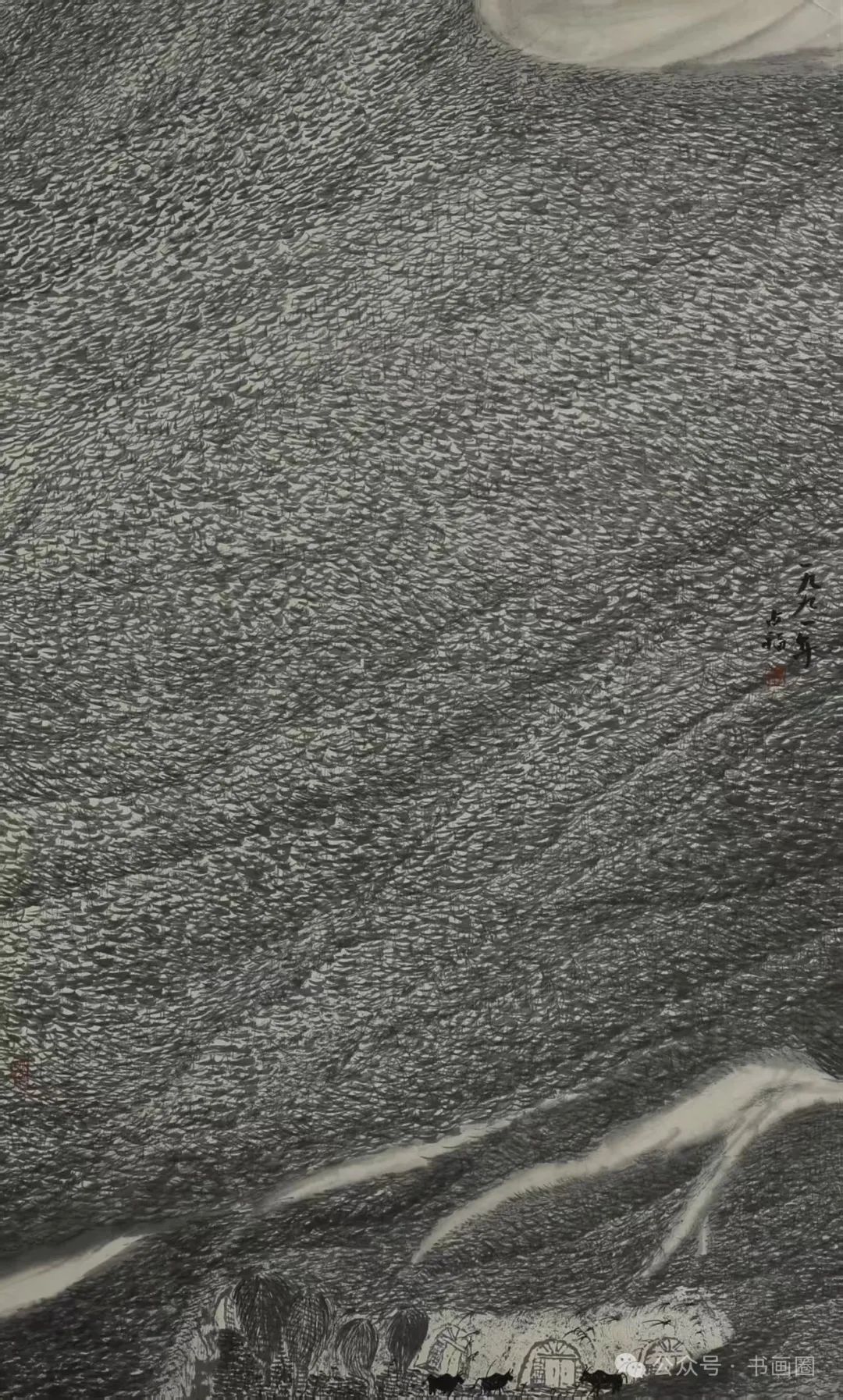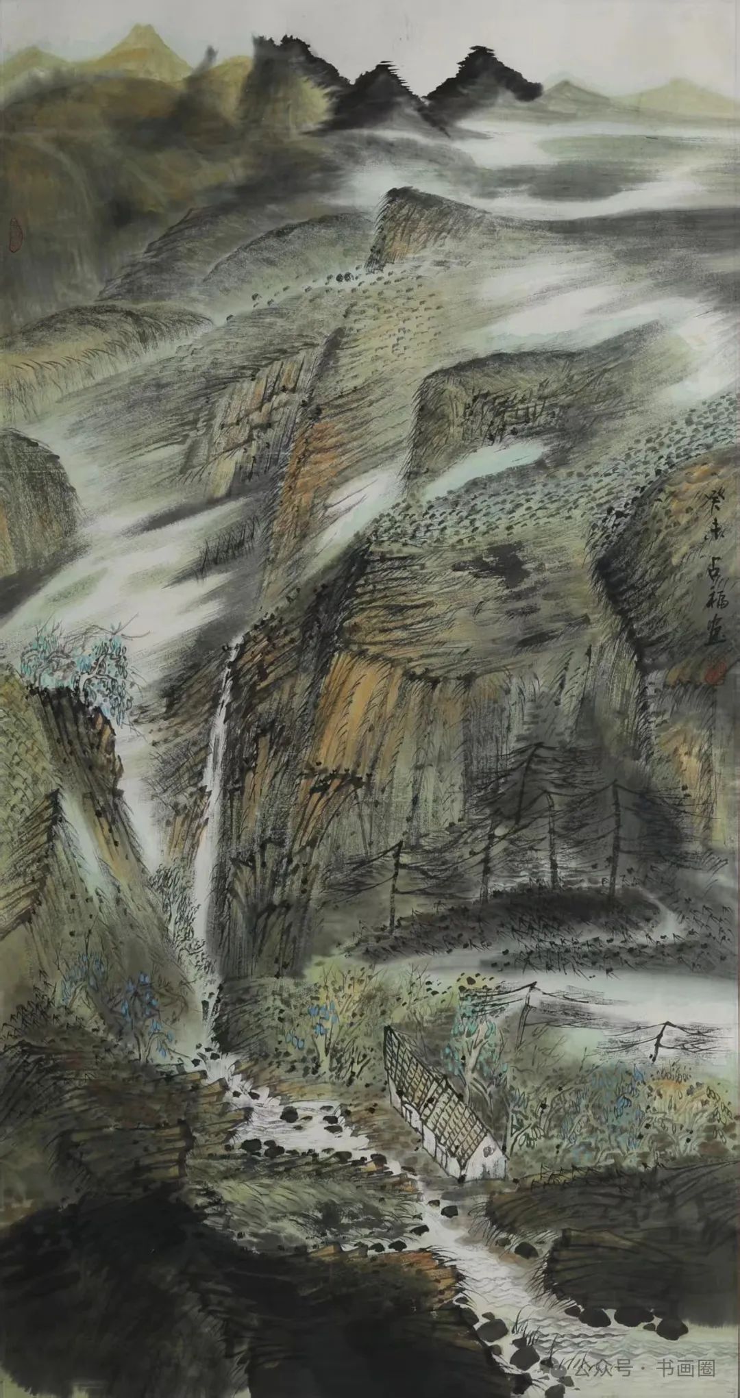 何占福的山水创作风格多元,各有绝妙韵味。他时而以淡墨轻染,晕染出青绿山水,山峦在云雾里若隐若现,江水如镜,灵秀之气从画面满溢而出;时而换粗粝笔触,聚焦黄土高原,沟壑纵横的地貌被精心勾勒,像是把岁月的沧桑都藏进皴擦的纹理中;又会用密集墨点层层积染,绘出黑白云烟缭绕之景,山脚下小小窑洞与牲畜错落点缀,笔墨厚重似能压沉纸面。