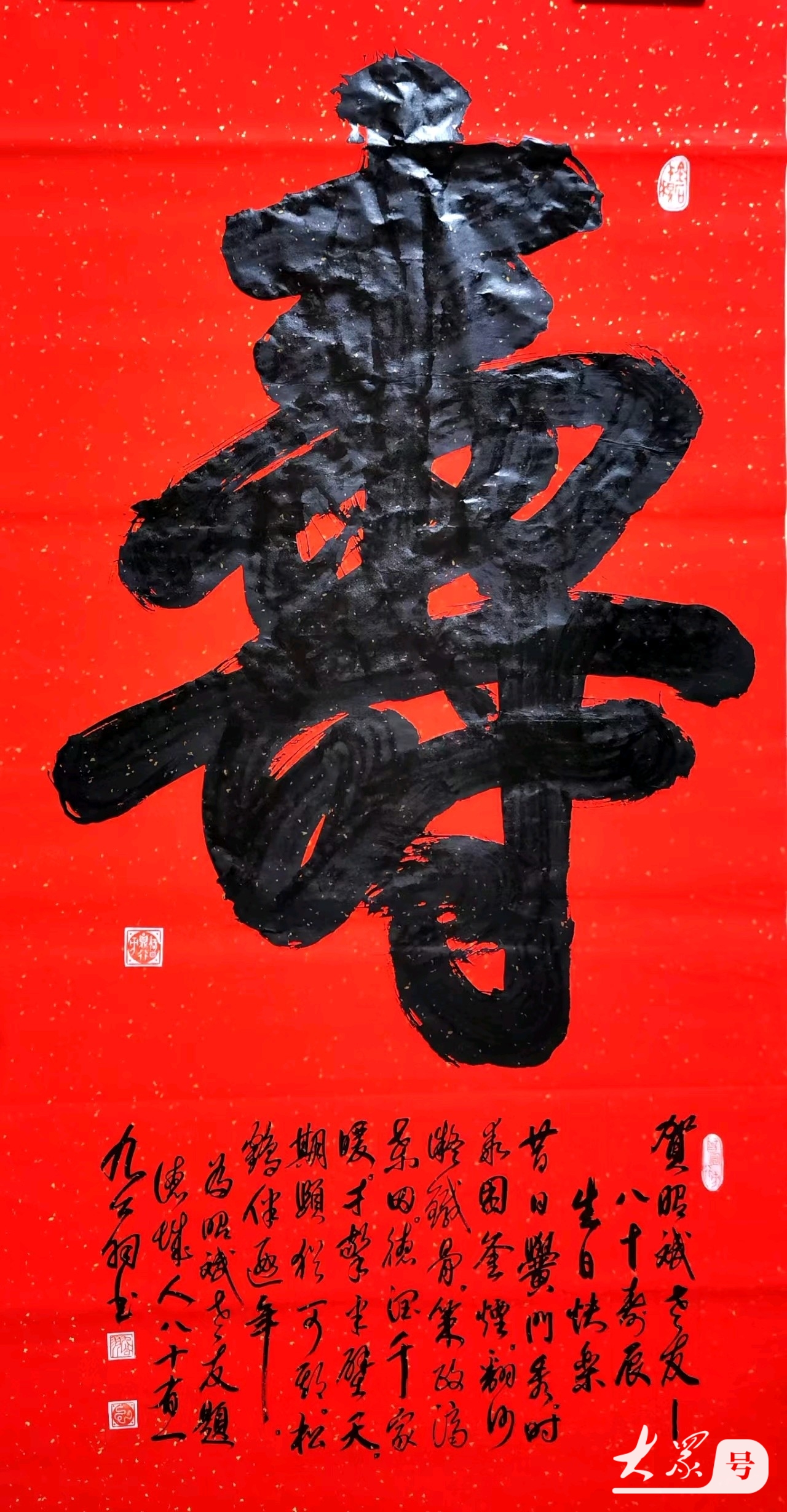 红底如焰,热烈而庄重,似岁月沉淀下的赤诚之心。墨色苍劲的“寿”字,如虬枝盘曲的老松,笔画间藏着风霜雨雪的印记,却又透出蓬勃的生命力。起笔处似有千钧之力,运笔时如行云流水,收笔时沉稳内敛,每一笔都凝聚着书法家毕生的功力与感悟。