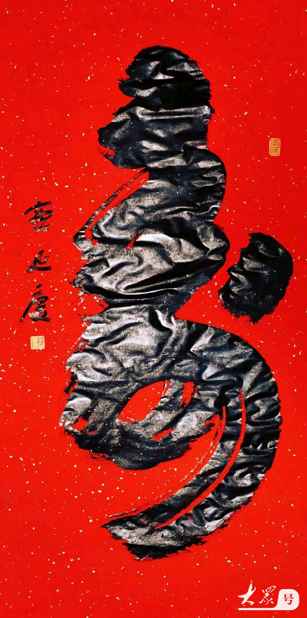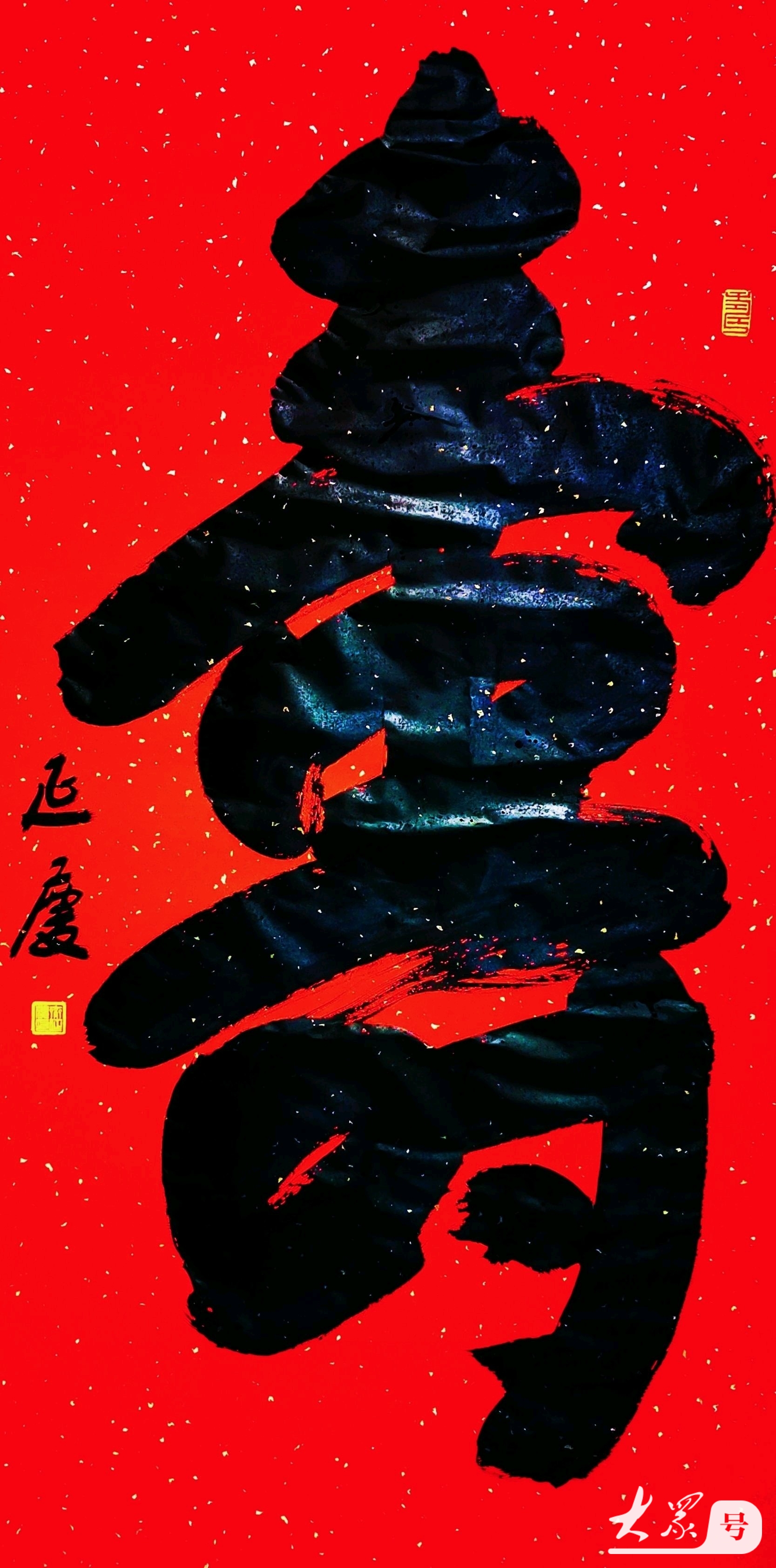 第二幅作品是榜书中的行书寿字,“融颜而入舒”章法十分到位,下笔流畅自然,笔锋凌厉,墨色厚重,点画沉实,笔墨酣畅雄浑大气,给观赏者一种圆润儒雅、内敛含蓄、韵味深厚又不失端庄秀美的精神享受。齐先生行书寿字三横平稳厚重有序,笔画全无雷同,如人生的健康、知足、乐观,缺一不可,格调高古,线条粗犷,气象宏大。寸字寓意是寸有所长,书法精髓在于不断创新传承中沉淀积累。与草书寿字的笔墨酣畅雄浑大气比较,行书寿字更给人一种清雅刚正俊朗俊秀之美。