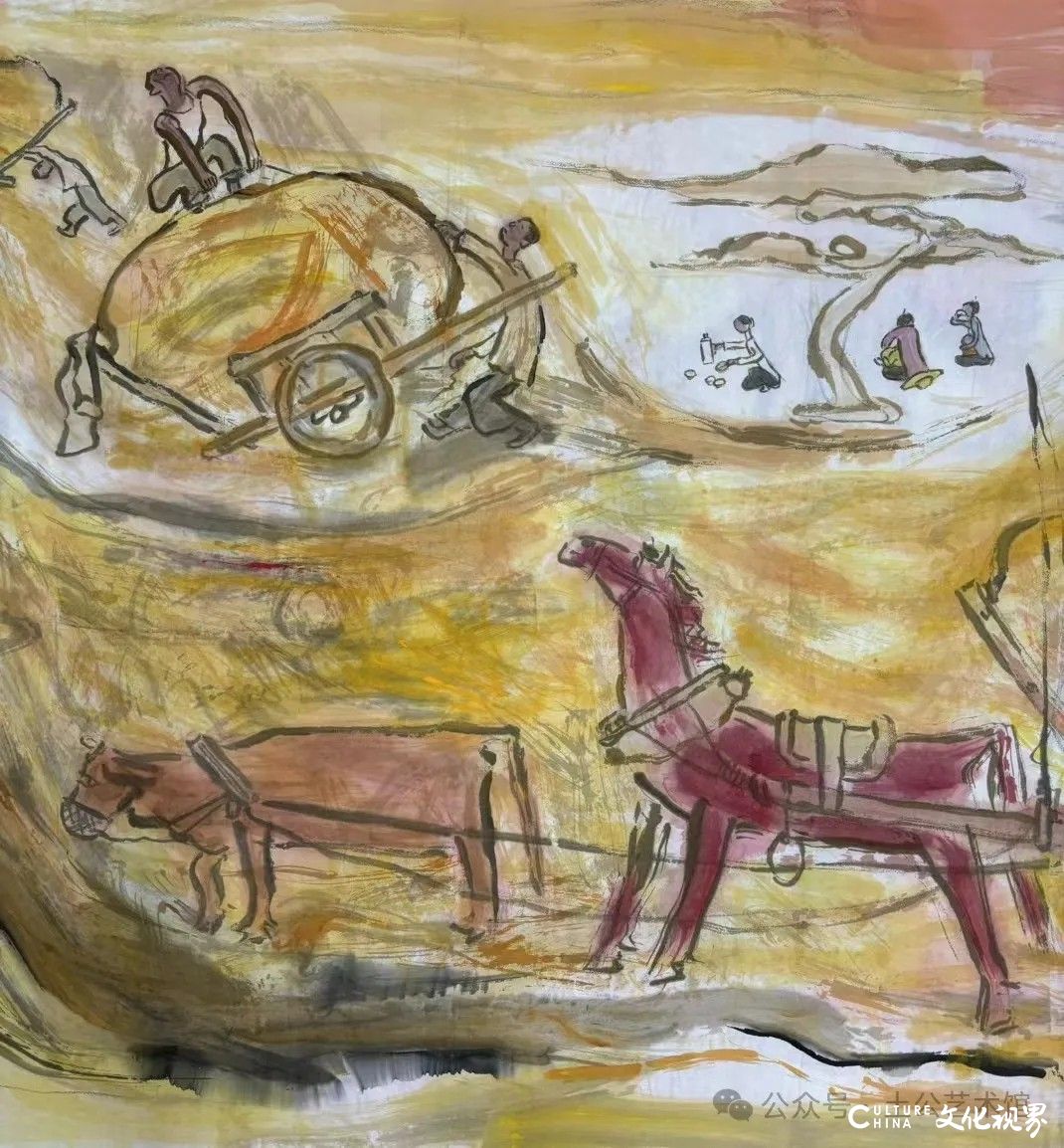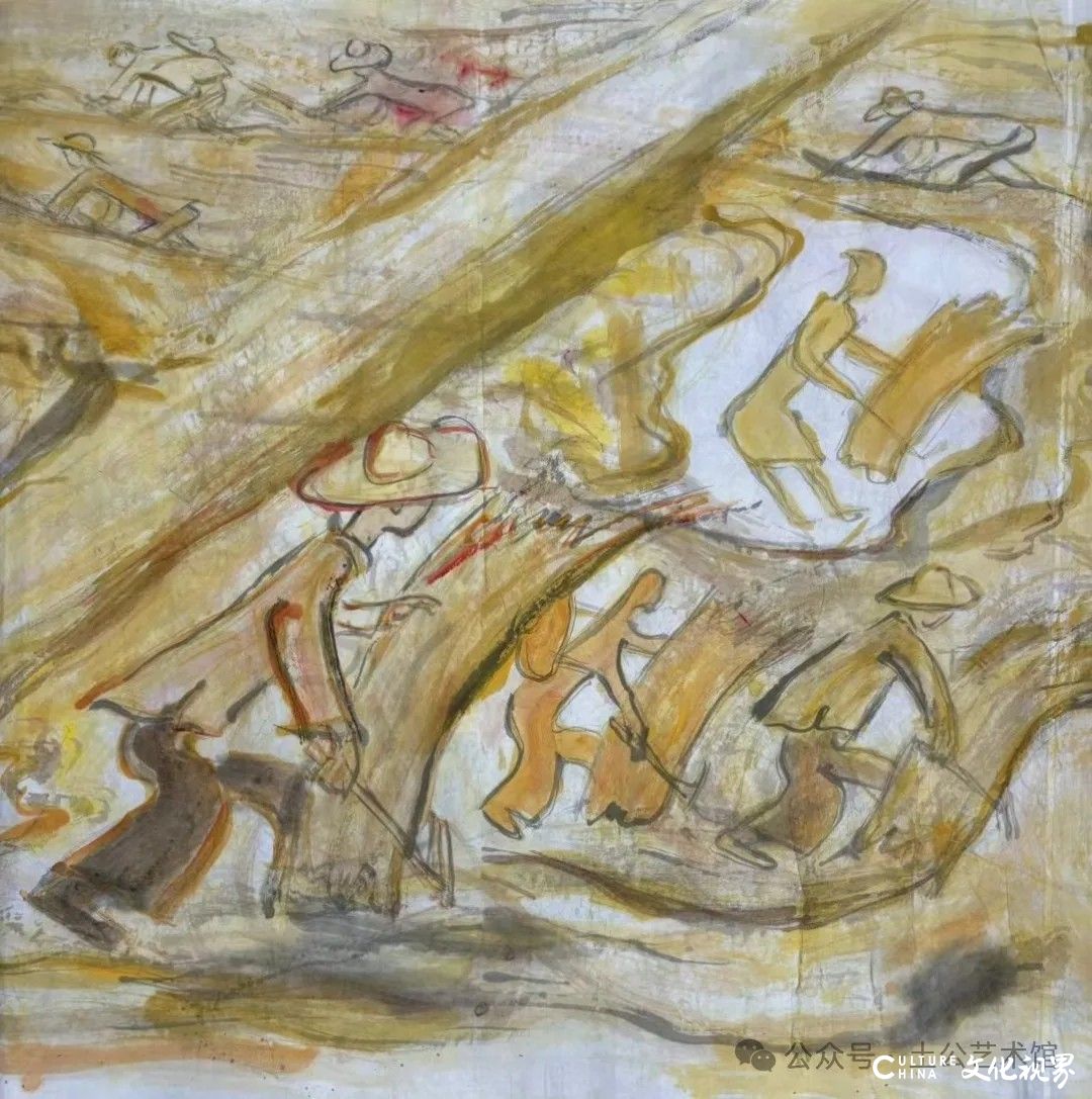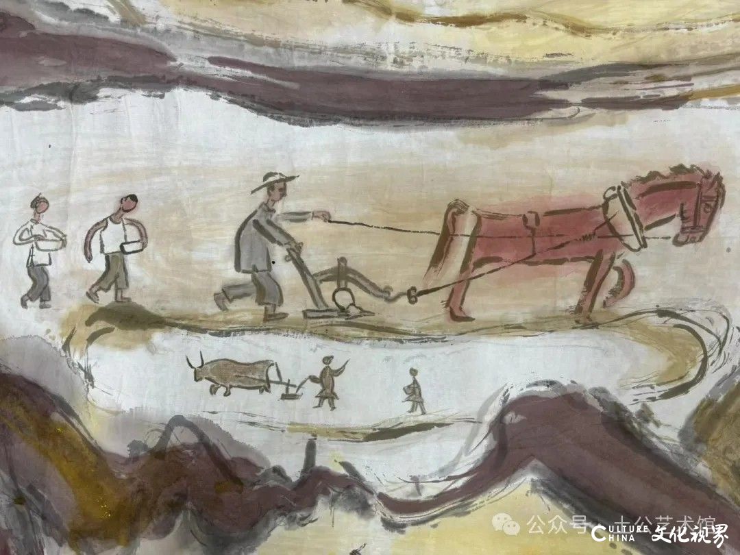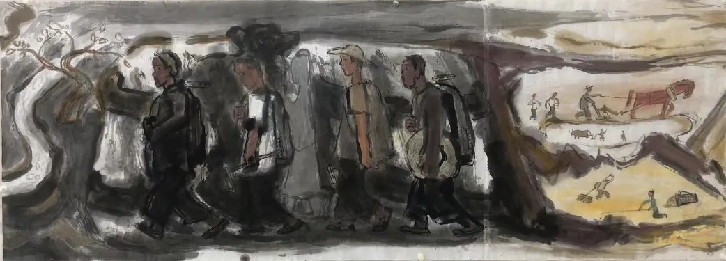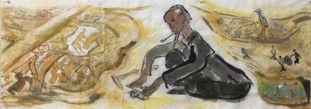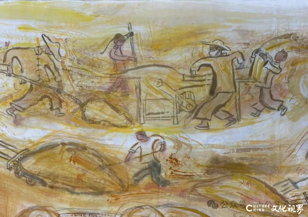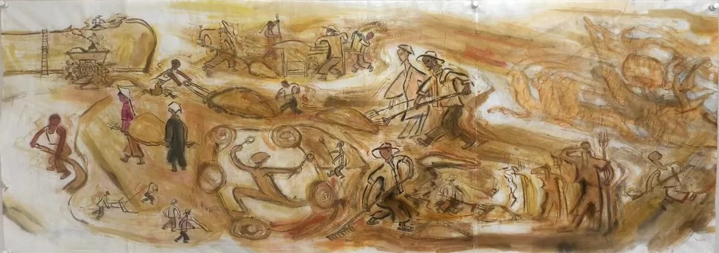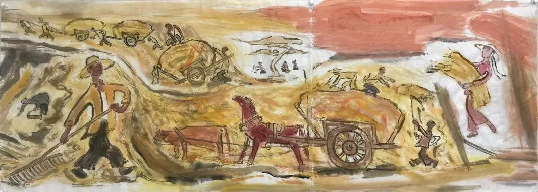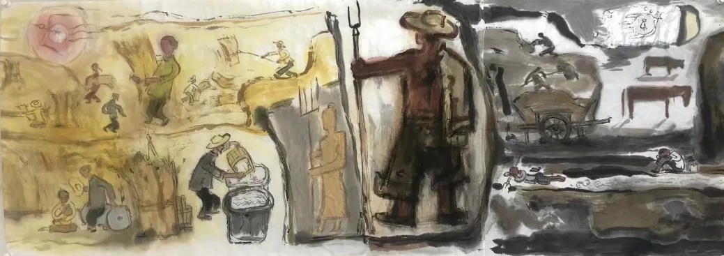 乙巳年开春,我六十九满,食七十之饭。想我弱能无大志向,仅画两笔拙画,好在一路得师提携、友帮助,忝列画画队伍,虽非懒惰,但天性默默,画的画一卷一捆的,除部分被参展示众和识爱者收藏外,多静存身边。快六十退休前,朋友们就提议办一综合个展,未实现,一晃到七十,综合个展仍是零。近年里不想个展事,集中精力画了一幅有关农业农耕的长卷画。此画二十多年前在西安就思谋着,还凭感觉无目标地勾描小图块。到北京的十多年里,画院创作任务多多,可此画事总在心中,随时获触动、撞灵感、理思路、谋形式、悟语言,随着积累逐多认识深化,目标慢慢显现,小图便不断地调整、修改,渐成模样,只是多原因未能动笔墨成画。2021年6月决意起大稿,2022年2月大稿成,动笔墨于宣纸正稿。其间幸有正居京的西安大学者诗人艺评家沈奇教授隔三差五审视指点,受益良多。10月初百余米铺陈妥。11月择大室依序置墙摆地邀国家画院同道通览指正,得高见后2023年2月整改成新样,拍图片函发西安诸师友讨教,又得深度启示,再改成眼下模样。现画长110余米、高96厘米,二米多一段计约五十段,分古代农业、春、夏、秋、冬五段落,基本依时散点叙事,拟再配等长之抽象图合奏,只是配图语言暂未确定未得绘制。好在现成之作可独立为画,为广听意见,将拙画五十段每次少则一多则三,再择其局部达或六或九幅逐天函发,盼得大家指正批评,若能再点滴进步也幸甚矣。