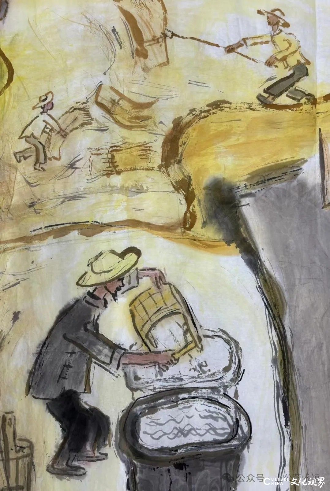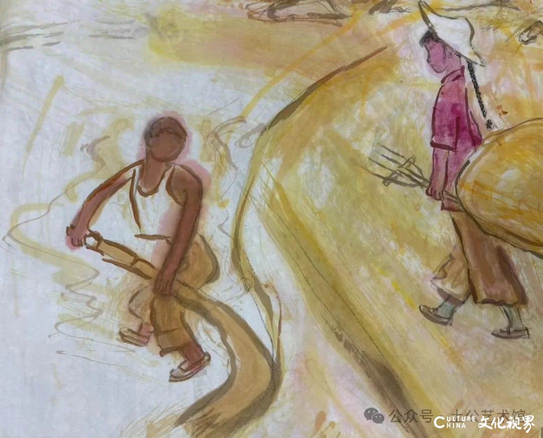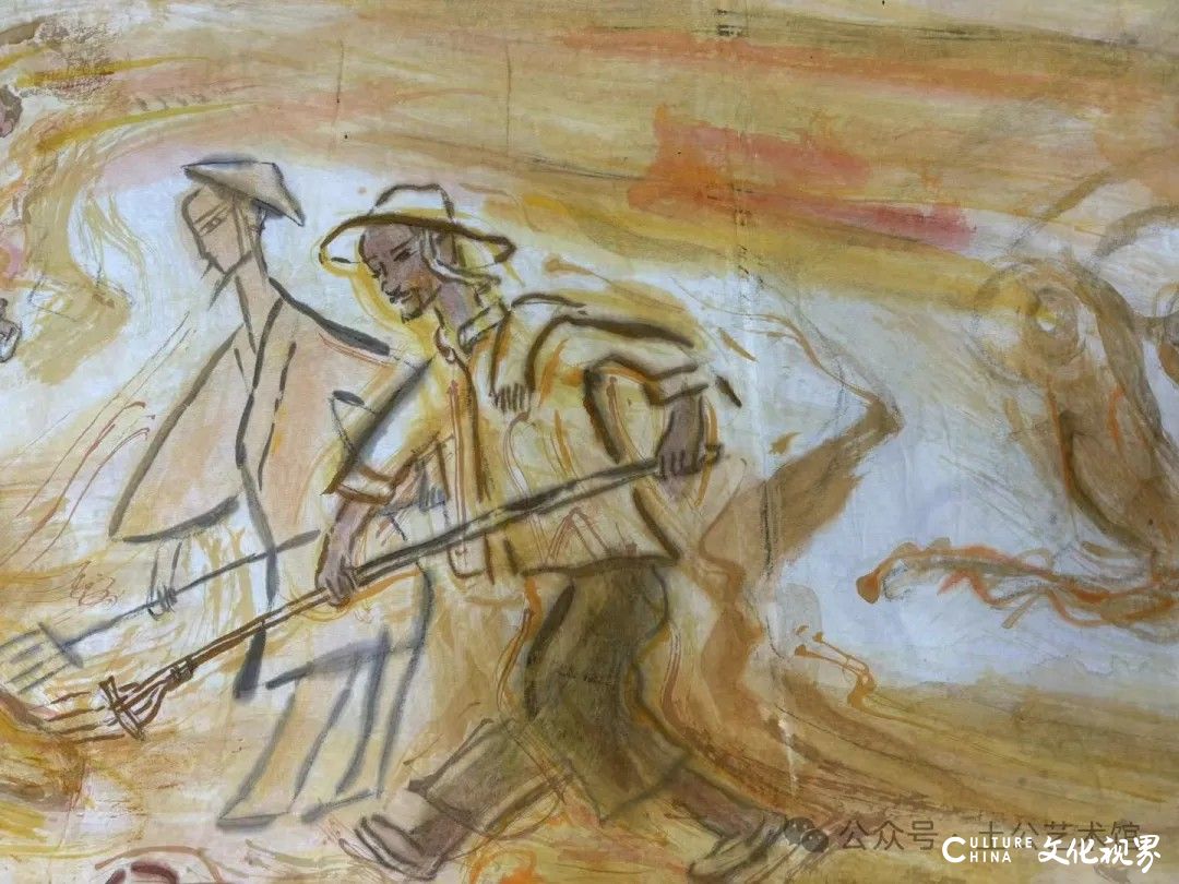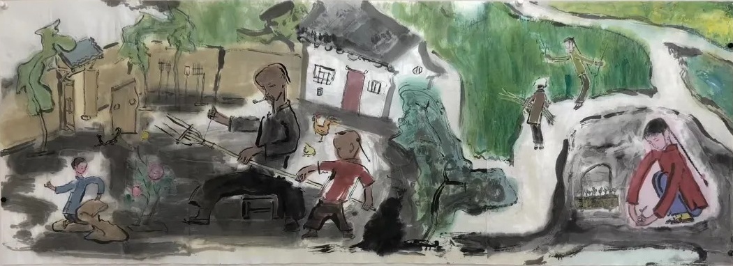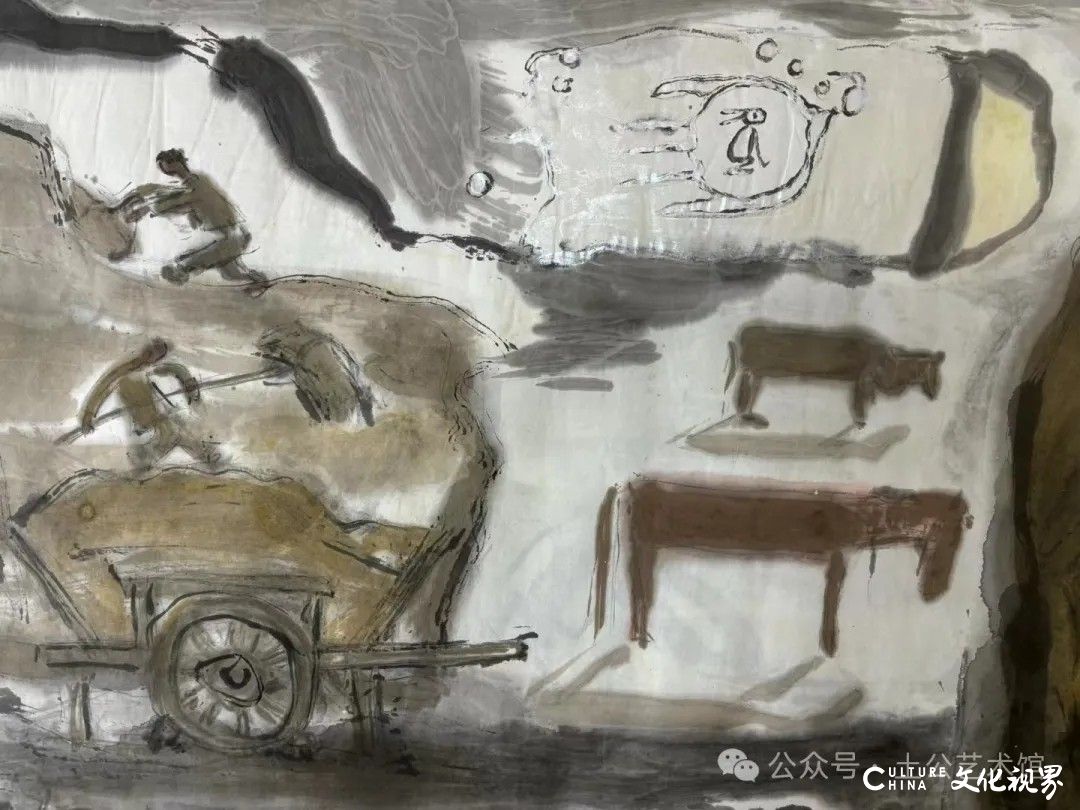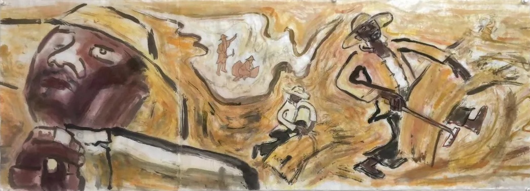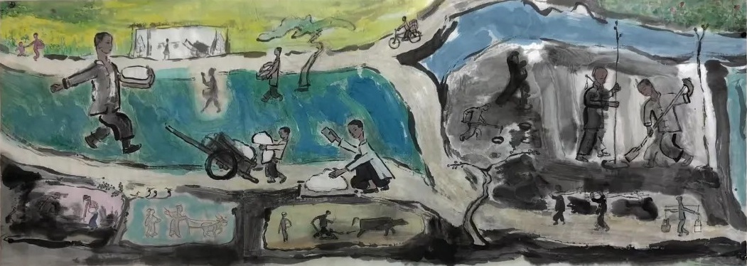 乙巳年开春,我六十九满,食七十之饭。想我弱能无大志向,仅画两笔拙画,好在一路得师提携、友帮助,忝列画画队伍,虽非懒惰,但天性默默,画的画一卷一捆的,除部分被参展示众和识爱者收藏外,多静存身边。快六十退休前,朋友们就提议办一综合个展,未实现,一晃到七十,综合个展仍是零。近年里不想个展事,集中精力画了一幅有关农业农耕的长卷画。此画二十多年前在西安就思谋着,还凭感觉无目标地勾描小图块。到北京的十多年里,画院创作任务多多,可此画事总在心中,随时获触动、撞灵感、理思路、谋形式、悟语言,随着积累逐多认识深化,目标慢慢显现,小图便不断地调整、修改,渐成模样,只是多原因未能动笔墨成画。2021年6月决意起大稿,2022年2月大稿成,动笔墨于宣纸正稿。其间幸有正居京的西安大学者诗人艺评家沈奇教授隔三差五审视指点,受益良多。10月初百余米铺陈妥。11月择大室依序置墙摆地邀国家画院同道通览指正,得高见后2023年2月整改成新样,拍图片函发西安诸师友讨教,又得深度启示,再改成眼下模样。现画长110余米、高96厘米,二米多一段计约五十段,分古代农业、春、夏、秋、冬五段落,基本依时散点叙事,拟再配等长之抽象图合奏,只是配图语言暂未确定未得绘制。好在现成之作可独立为画,为广听意见,将拙画五十段每次少则一多则三,再择其局部达或六或九幅逐天函发,盼得大家指正批评,若能再点滴进步也幸甚矣。