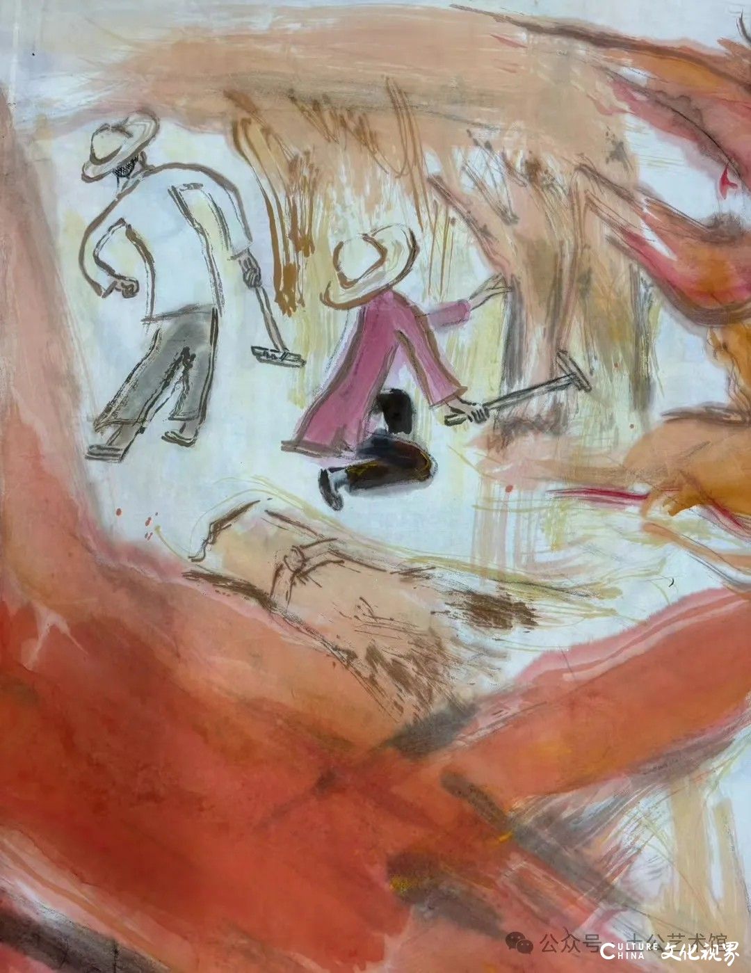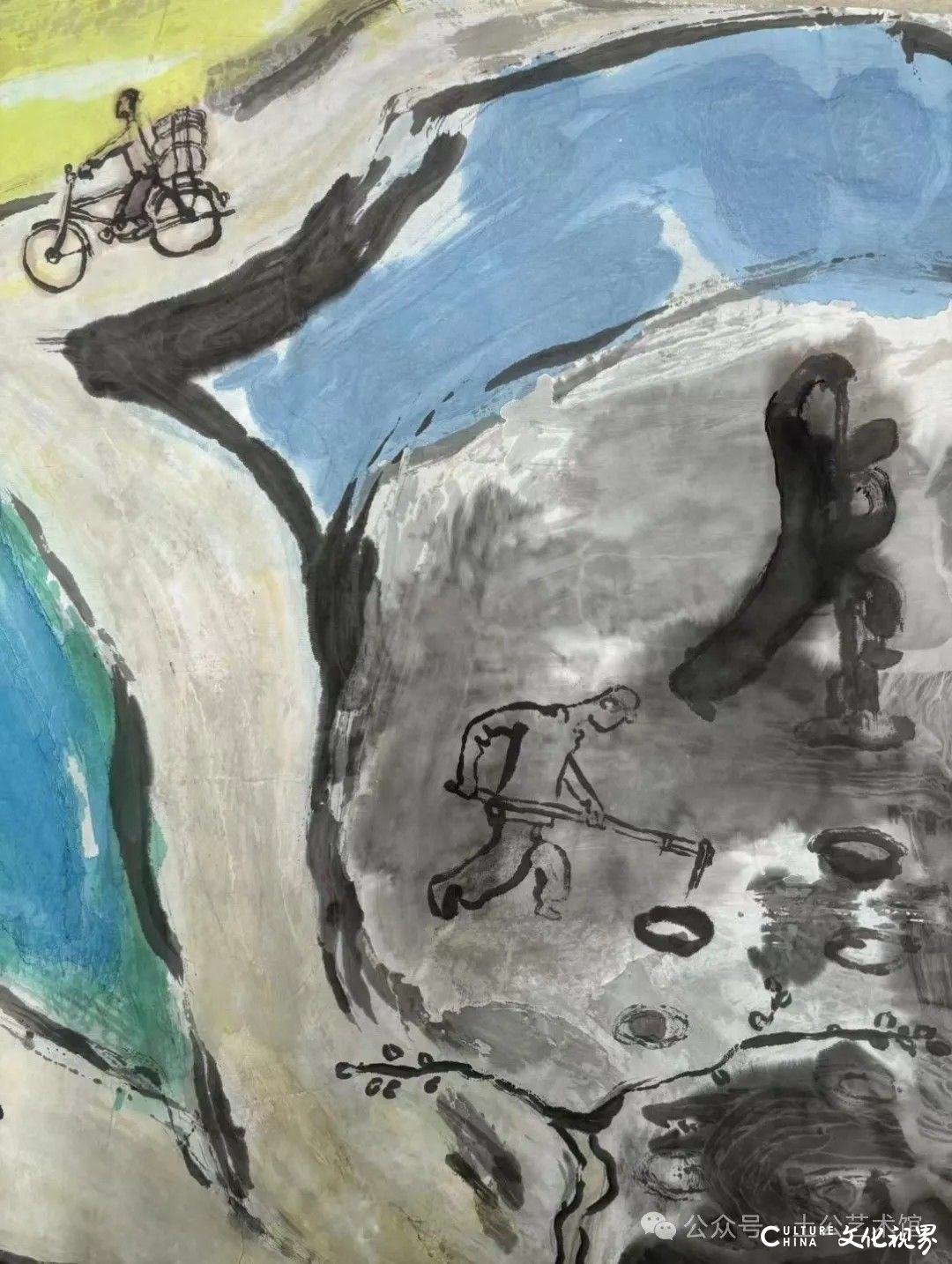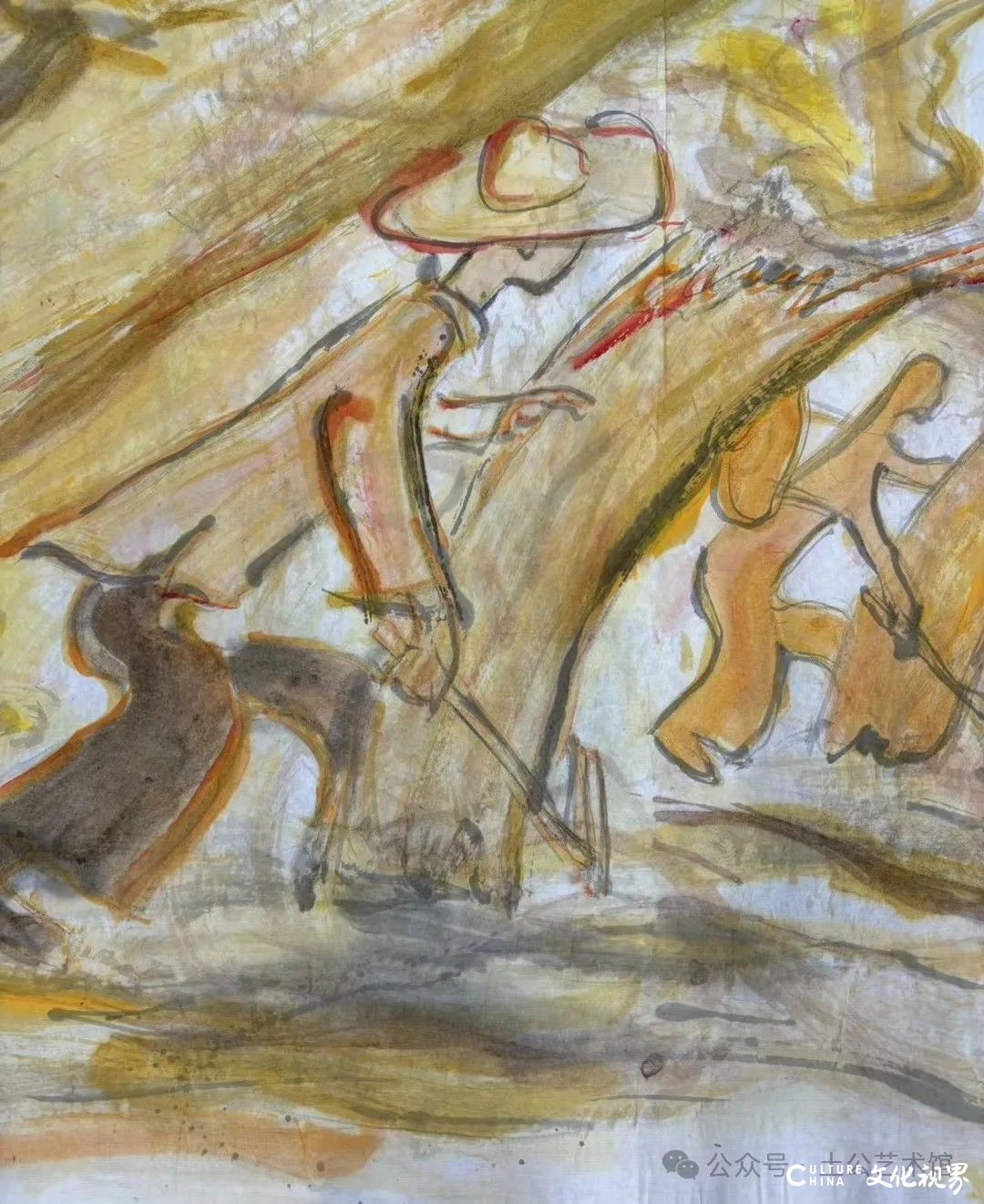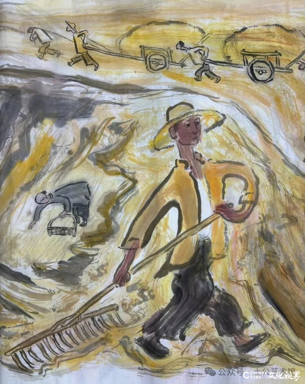 乙巳年开春,我六十九满,食七十之饭。想我弱能无大志向,仅画两笔拙画,好在一路得师提携、友帮助,忝列画画队伍,虽非懒惰,但天性默默,画的画一卷一捆的,除部分被参展示众和识爱者收藏外,多静存身边。快六十退休前,朋友们就提议办一综合个展,未实现,一晃到七十,综合个展仍是零。近年里不想个展事,集中精力画了一幅有关农业农耕的长卷画。此画二十多年前在西安就思谋着,还凭感觉无目标地勾描小图块。到北京的十多年里,画院创作任务多多,可此画事总在心中,随时获触动、撞灵感、理思路、谋形式、悟语言,随着积累逐多认识深化,目标慢慢显现,小图便不断地调整、修改,渐成模样,只是多原因未能动笔墨成画。2021年6月决意起大稿,2022年2月大稿成,动笔墨于宣纸正稿。其间幸有正居京的西安大学者诗人艺评家沈奇教授隔三差五审视指点,受益良多。10月初百余米铺陈妥。11月择大室依序置墙摆地邀国家画院同道通览指正,得高见后2023年2月整改成新样,拍图片函发西安诸师友讨教,又得深度启示,再改成眼下模样。现画长110余米、高96厘米,二米多一段计约五十段,分古代农业、春、夏、秋、冬五段落,基本依时散点叙事,拟再配等长之抽象图合奏,只是配图语言暂未确定未得绘制。好在现成之作可独立为画,为广听意见,将拙画五十段每次少则一多则三,再择其局部达或六或九幅逐天函发,盼得大家指正批评,若能再点滴进步也幸甚矣。