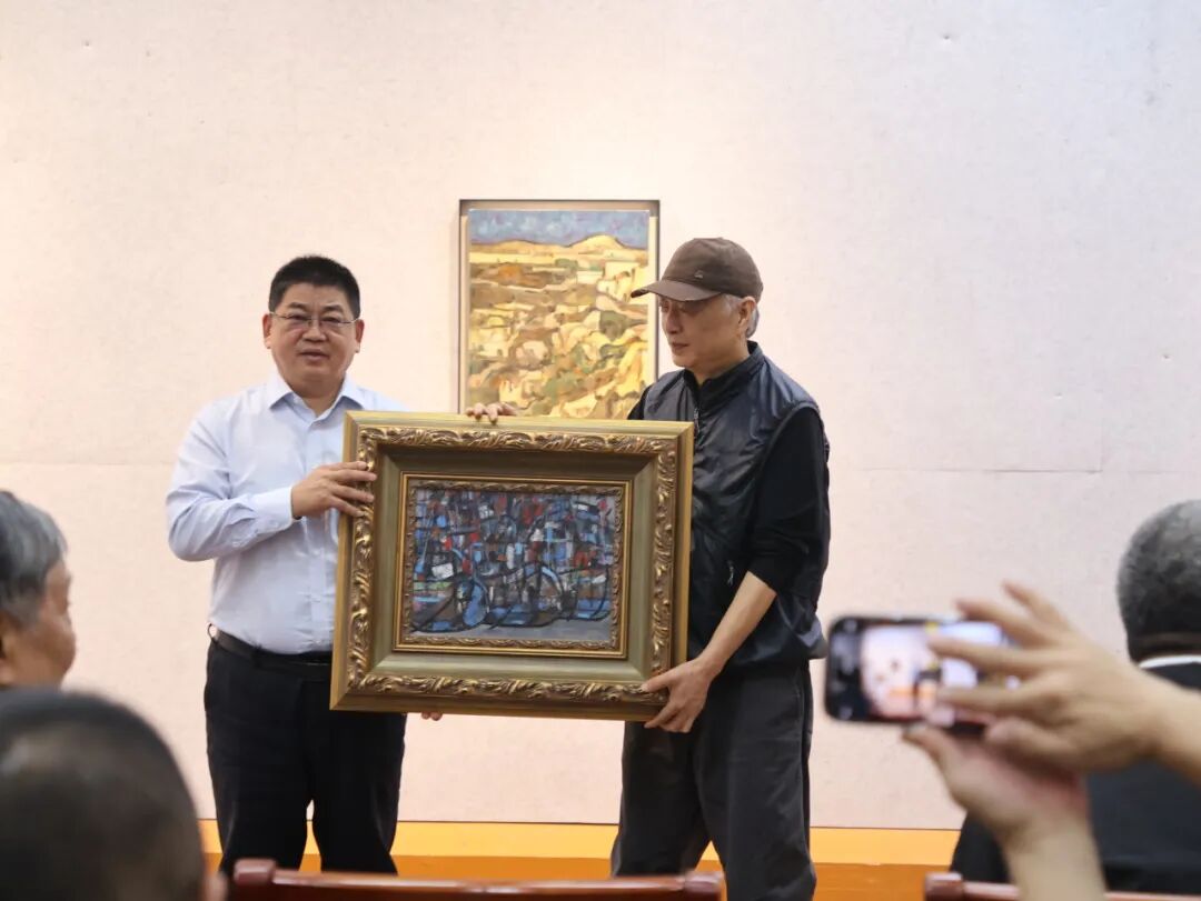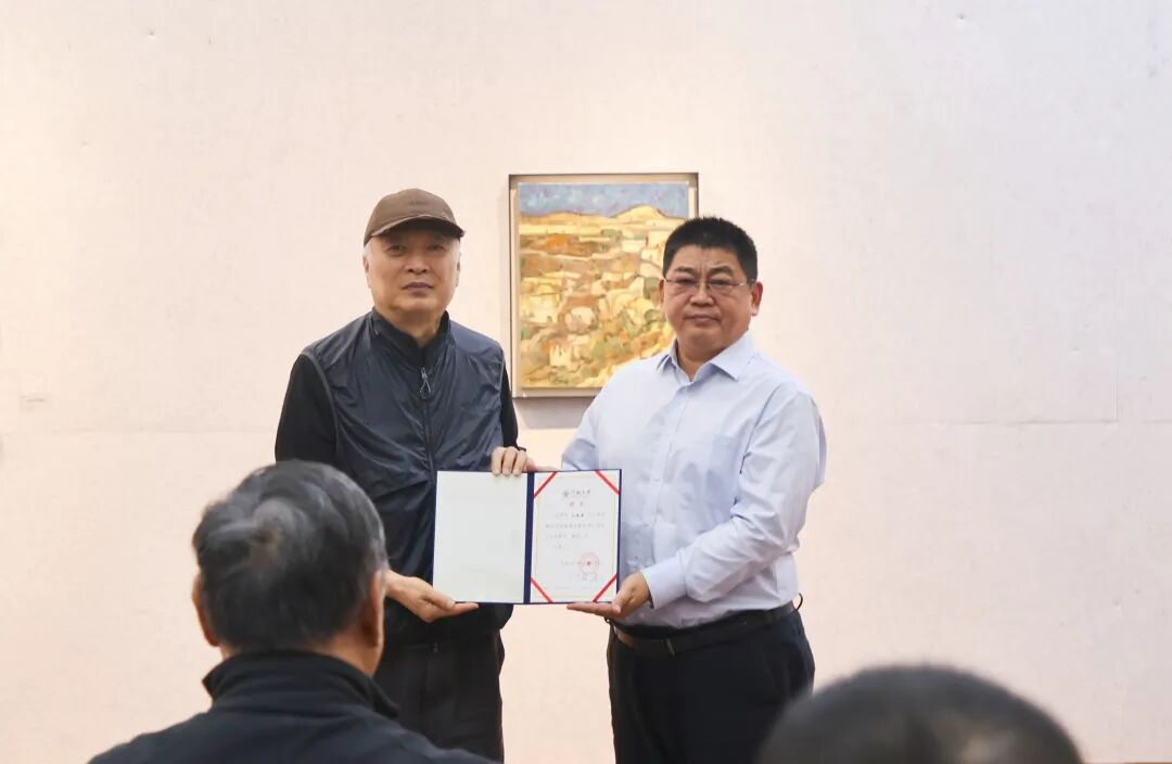 随后,开幕式上举行了两项重要仪式。首先,杨江涛为化建国颁发了“河南大学硕士研究生指导教师续聘证书”。这不仅是一份艺术传承的契约,更是用实践行动延续美育火种的真挚见证;接着,化建国为支持母校艺术教育事业,慷慨捐赠珍贵的艺术作品,杨江涛上台接收捐赠并颁发收藏证书。现场热烈的掌声见证了这温暖的时刻,彰显了校友对母校的深厚情谊与无私奉献。
