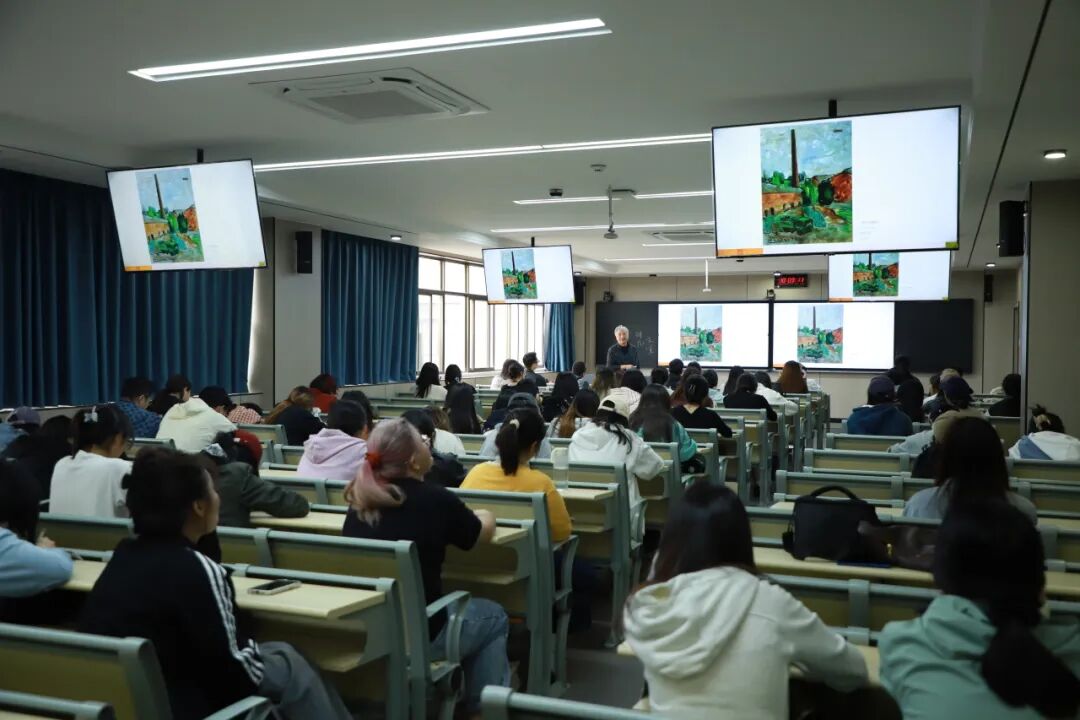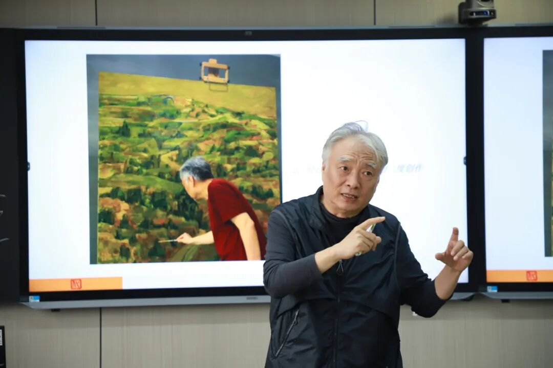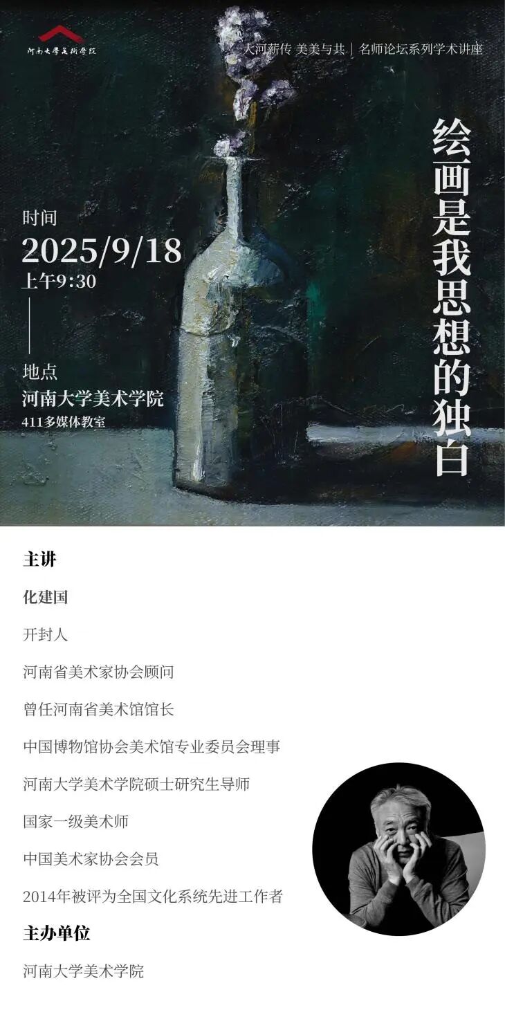 此前9月18日,化建国应邀在河南大学美术学院四楼多媒体教室举办了题为“绘画是我思想的独白”的专题讲座。讲座中,他通过展示多幅小幅油画作品,详解了创作背景、灵感来源与艺术特点。他鼓励师生通过自我设限获得创造自由、放弃技巧获得表达自由、否定成规获得思想自由,同时强调艺术相通,不同门类可相互借鉴融合。此次讲座与展览一脉相承,为师生提供了从理论到实践的完整学习路径,为河南大学美术学院的艺术教育与学术交流注入新活力。