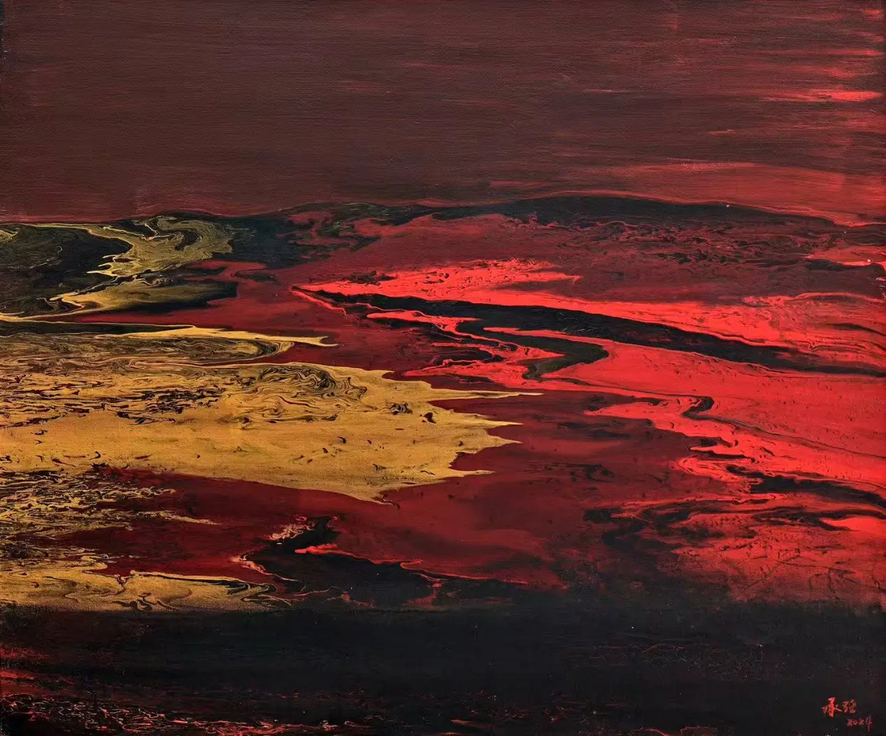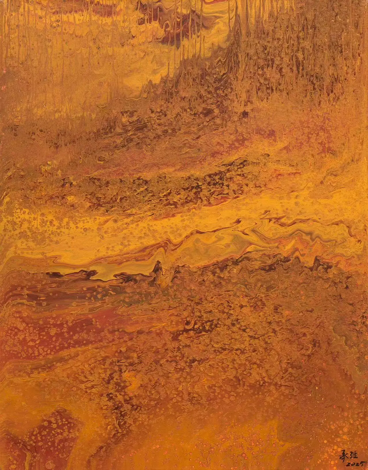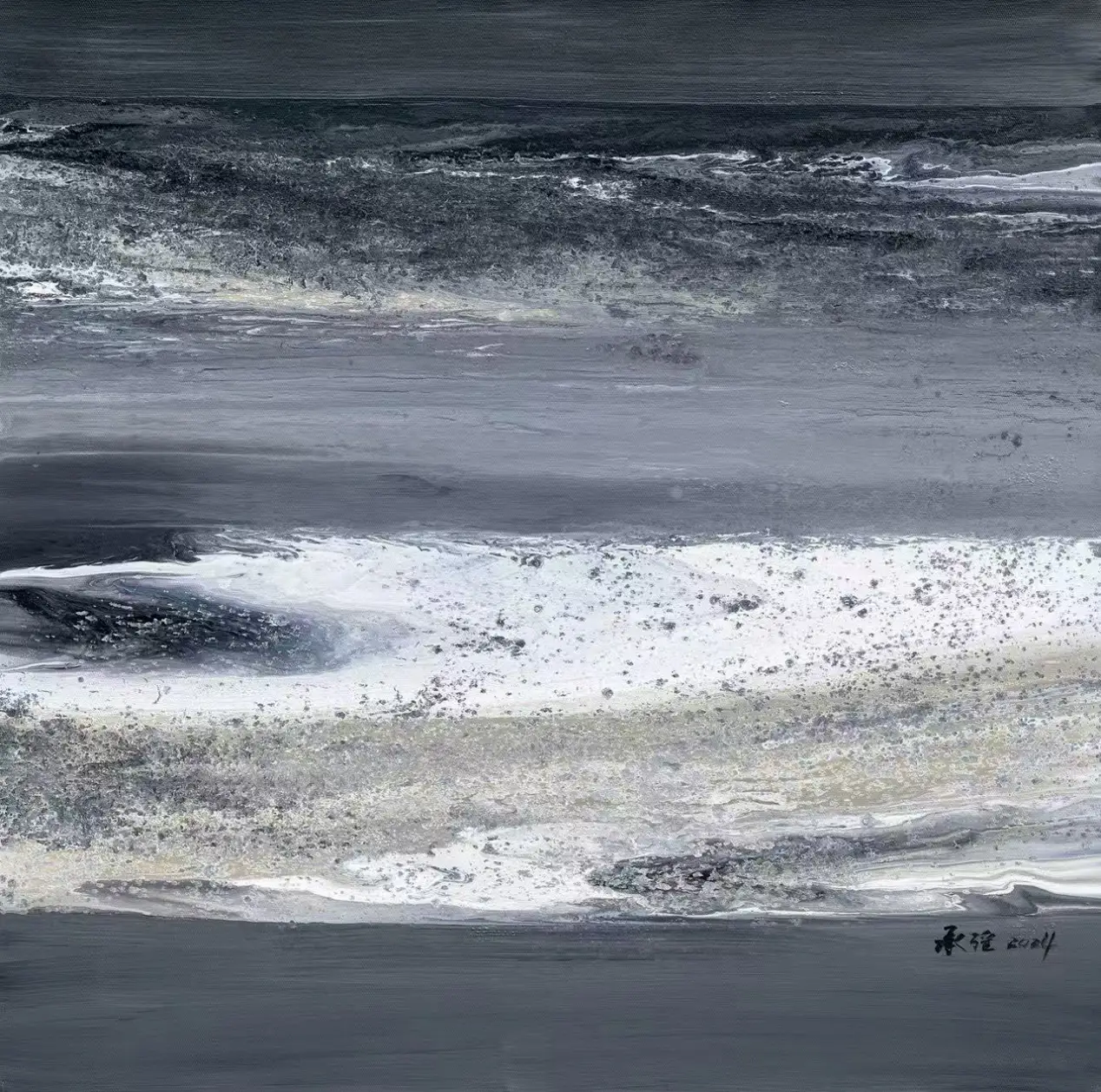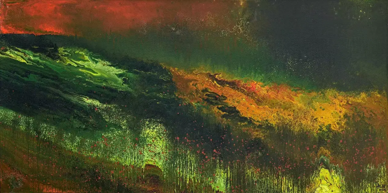 在承强的抽象中,有着具象的来处。他行万里路,不仅仅是对景写生,而是把面对大自然时心中升腾而起的激情与被激发的活力,化为笔下的油彩泼洒,随性姿肆。他善于思考,也善于总结,扬长避短,选择了抽象油彩的方式。但他也把沿途的风景与心情记录在笔端,让他的抽象表现当中似乎羚羊挂角,有迹可寻。《峡江云》《三江源》《梅里印象》《太行高秋》《洞庭连天九疑高》……在这些抽象的画面中,似有沙漠,有荒原,有瑞雪,有波涛这些可以辩识的物象,但也有远古秘境,梦中大虚,荒寒字宙,无垠太空,色彩的冲击力是承强画面给予人最强烈的感受,但同时,中国人特有的意境与意韵,无处不在。在他的作品中,没有人烟,却处处可以感受到画面背后的可感可察之“心”,是“空山不见人,但闻人语响”,是“人与花一日俱寂”之境,可以说,承强的艺术风格是一种深深植根于自然与心灵感悟的艺术探索。他在东方意韵与西方抽象主义之间找到了和谐的融合点,展现了独特的时代性和国际性。通过他的作品,我们可以感受到一个艺术家对于美、对于自然,对于人性哲理的深刻思考和独特见解。