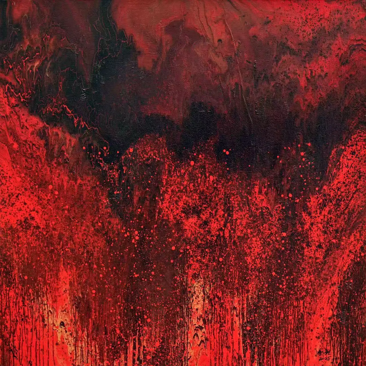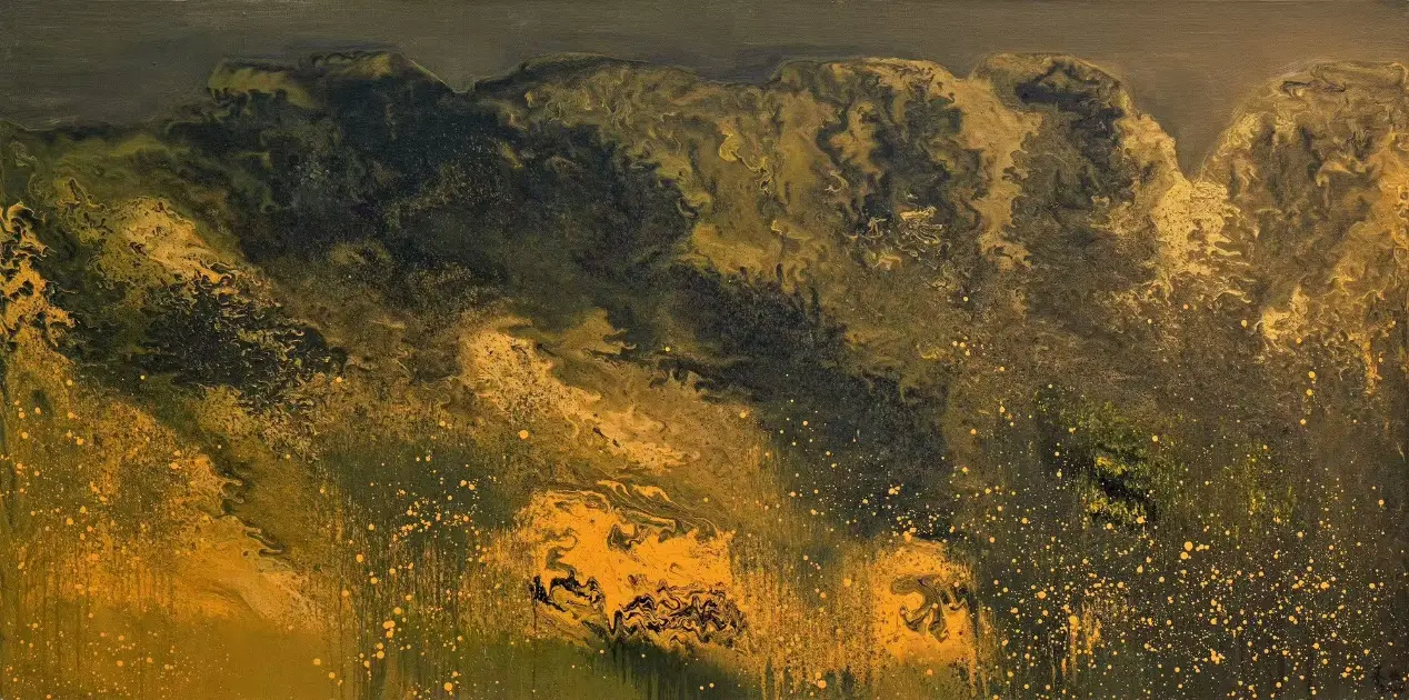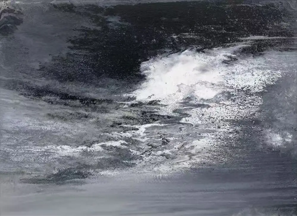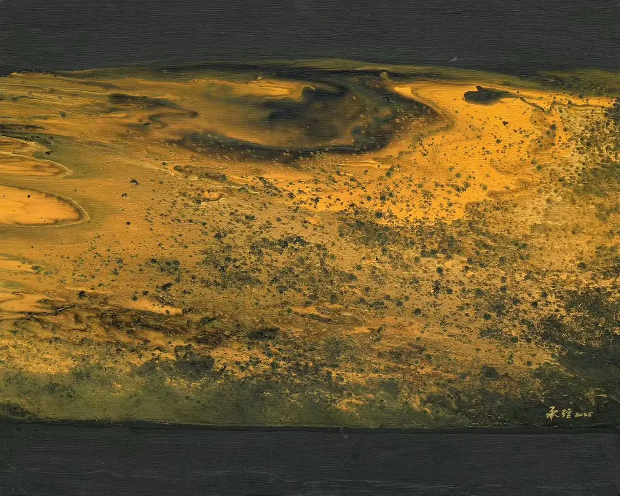在承强的抽象中,有着具象的来处。他行万里路,不仅仅是对景写生,而是把面对大自然时心中升腾而起的激情与被激发的活力,化为笔下的油彩泼洒,随性姿肆。他善于思考,也善于总结,扬长避短,选择了抽象油彩的方式。但他也把沿途的风景与心情记录在笔端,让他的抽象表现当中似乎羚羊挂角,有迹可寻。《峡江云》《三江源》《梅里印象》《太行高秋》《洞庭连天九疑高》……在这些抽象的画面中,似有沙漠,有荒原,有瑞雪,有波涛这些可以辩识的物象,但也有远古秘境,梦中大虚,荒寒字宙,无垠太空,色彩的冲击力是承强画面给予人最强烈的感受,但同时,中国人特有的意境与意韵,无处不在。在他的作品中,没有人烟,却处处可以感受到画面背后的可感可察之“心”,是“空山不见人,但闻人语响”,是“人与花一日俱寂”之境,可以说,承强的艺术风格是一种深深植根于自然与心灵感悟的艺术探索。他在东方意韵与西方抽象主义之间找到了和谐的融合点,展现了独特的时代性和国际性。通过他的作品,我们可以感受到一个艺术家对于美、对于自然,对于人性哲理的深刻思考和独特见解。