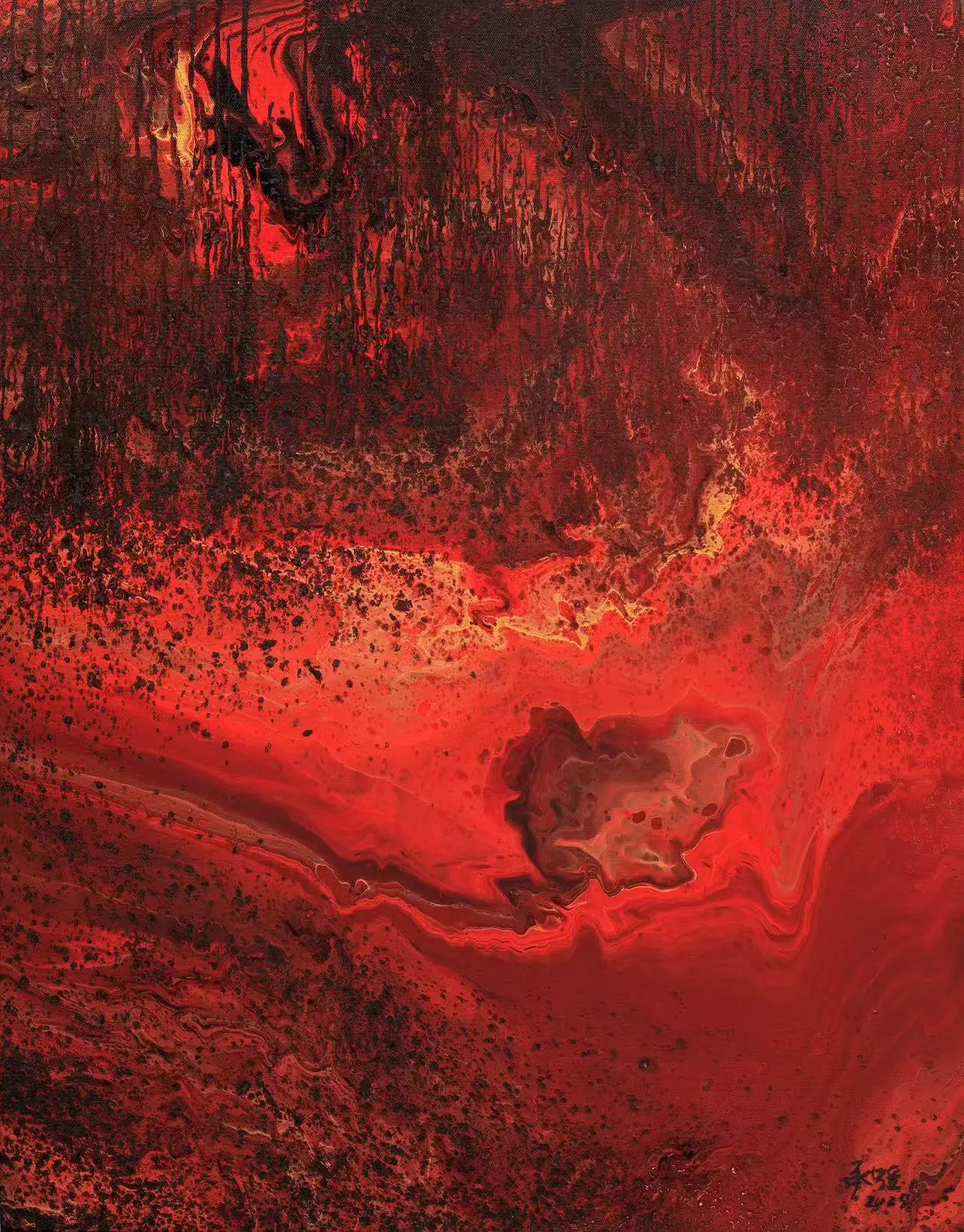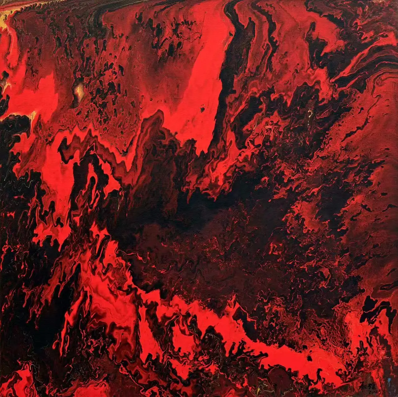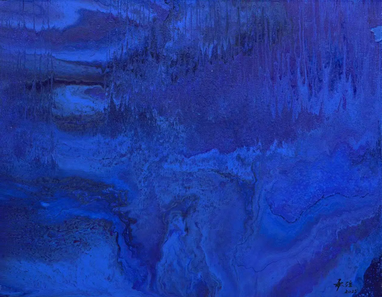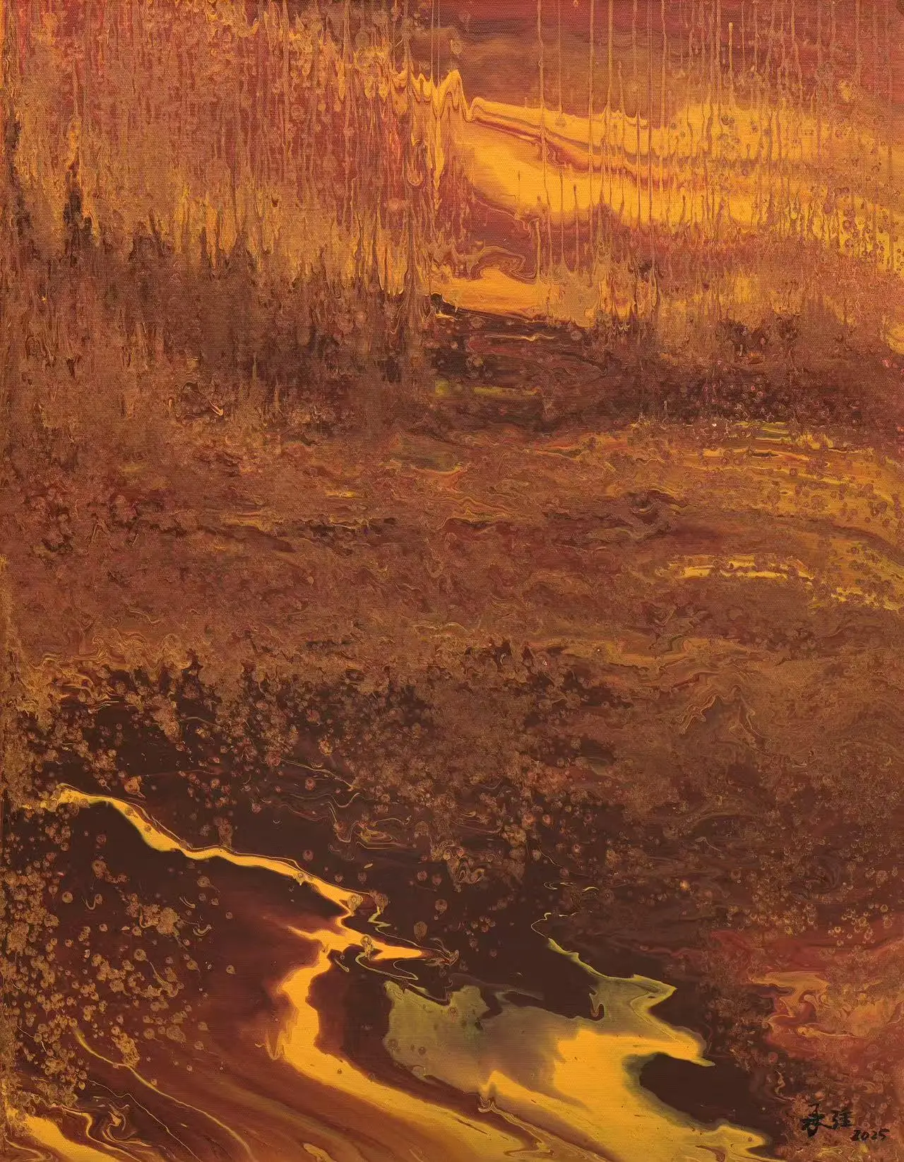 在承强的抽象中,有着具象的来处。他行万里路,不仅仅是对景写生,而是把面对大自然时心中升腾而起的激情与被激发的活力,化为笔下的油彩泼洒,随性姿肆。他善于思考,也善于总结,扬长避短,选择了抽象油彩的方式。但他也把沿途的风景与心情记录在笔端,让他的抽象表现当中似乎羚羊挂角,有迹可寻。《峡江云》《三江源》《梅里印象》《太行高秋》《洞庭连天九疑高》……在这些抽象的画面中,似有沙漠,有荒原,有瑞雪,有波涛这些可以辩识的物象,但也有远古秘境,梦中大虚,荒寒字宙,无垠太空,色彩的冲击力是承强画面给予人最强烈的感受,但同时,中国人特有的意境与意韵,无处不在。在他的作品中,没有人烟,却处处可以感受到画面背后的可感可察之“心”,是“空山不见人,但闻人语响”,是“人与花一日俱寂”之境,可以说,承强的艺术风格是一种深深植根于自然与心灵感悟的艺术探索。他在东方意韵与西方抽象主义之间找到了和谐的融合点,展现了独特的时代性和国际性。通过他的作品,我们可以感受到一个艺术家对于美、对于自然,对于人性哲理的深刻思考和独特见解。
