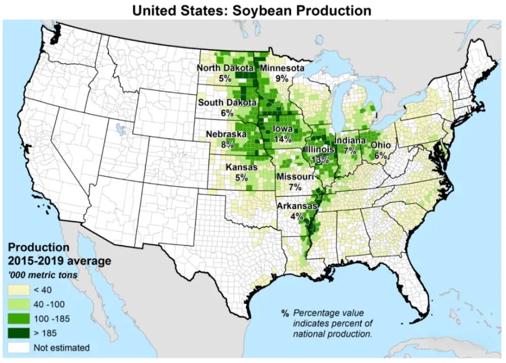 美国大豆主产区(2015-2019年平均产量)不仅如此,国际四大粮食巨头中美国占了三家,他们在大豆的国际贸易中,沿袭了小麦、玉米、棉花、糖等农产品的贸易模式和定价机制,整个上下游都被以“一口价”的方式垄断价格。