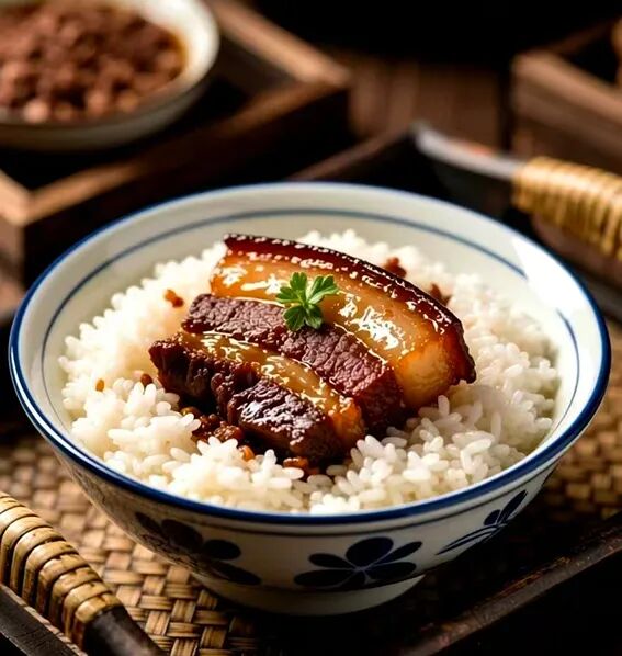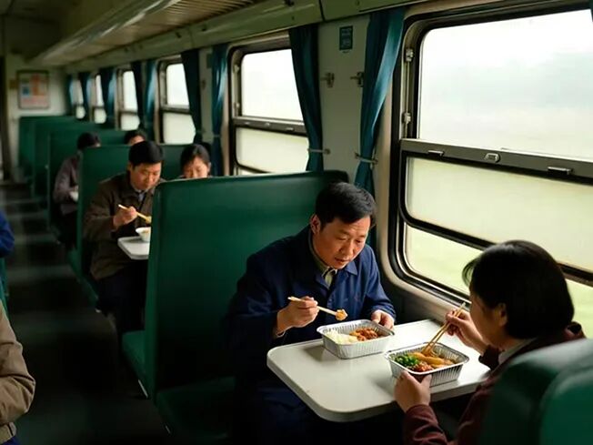 当时盛饭的是重复使用的铝制饭盒和勺子。饭菜中,米饭是主打,装得满满的,菜似乎是点缀,什么西红柿炒鸡蛋、炒土豆丝之类,敷在米饭上面,菜量很少。我记忆最深的一次盒饭便是米饭上放着一大块长方形的厚肉块,很肥,带皮,米饭上浇着比酱油色浅些的肉汤。而那块肉,口感很硬,支支棱棱,应该是欠些火候。现在回想起来那肉应该很油腻,但在彼时,少见的肉脂特有的口感及香气非常解馋。米饭上的肉汤,与干巴巴、松散成一粒粒甚至有些夹生的米饭产生出“化学反应”,更是“出神入化”,使有些噎人的米饭可爱了许多,也令我回味良久。很多年以后,我才知道火车上那个盒饭里,便是如今在济南闻名遐迩的“黄金搭配”——大米干饭把子肉。