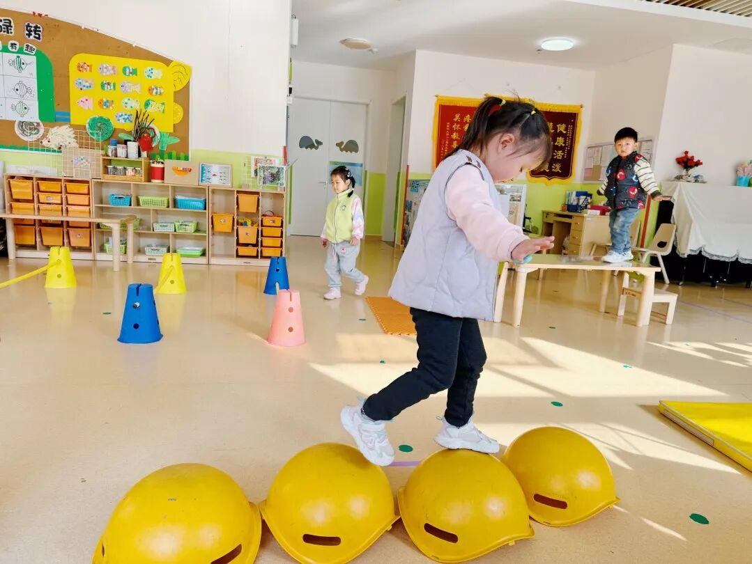 即使天气不佳,运动的热情也从未停歇。幼儿园巧妙利用室内空间,将走廊、教室和多功能厅转化为充满挑战的运动乐园。通过设置钻爬区、平衡道、投掷角等趣味项目,让每一寸空间都支持幼儿发展。不仅锻炼了幼儿的身体协调性与平衡能力,更在游戏中强化规则意识和空间判断力,确保在任何天气下都能保持运动活力,持续成长。