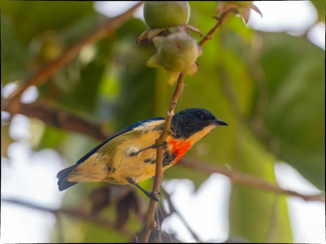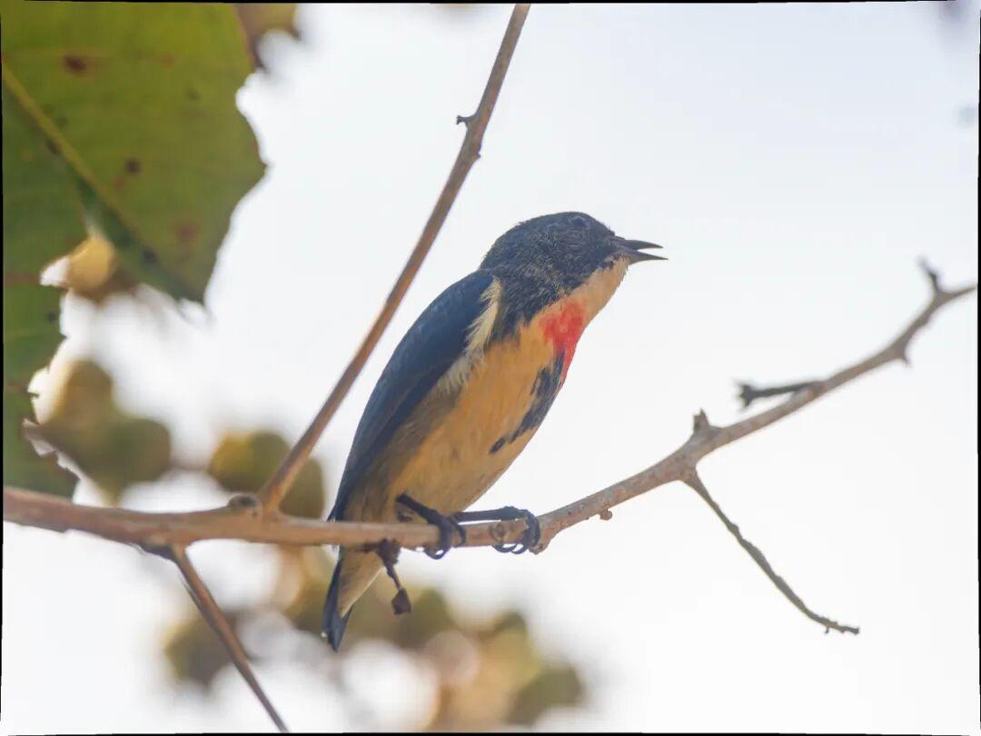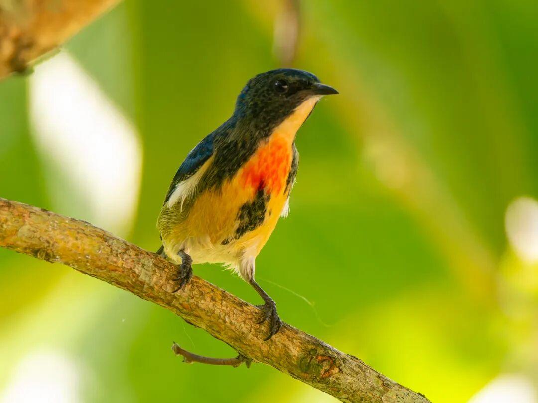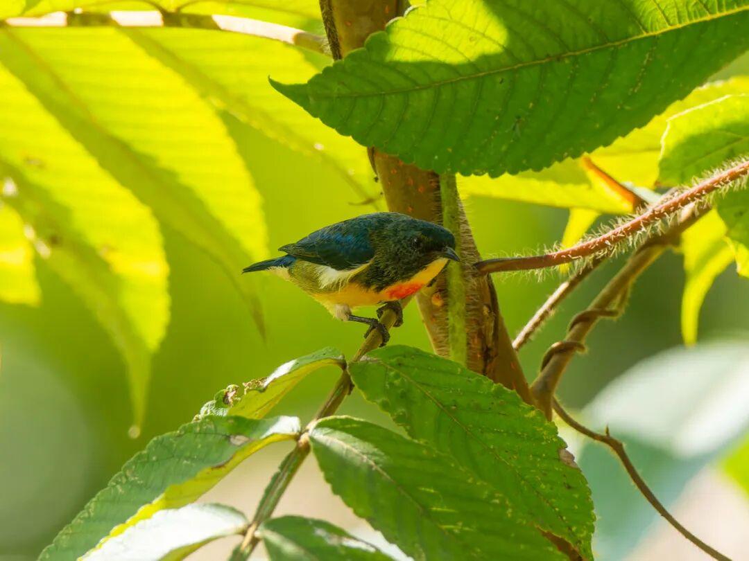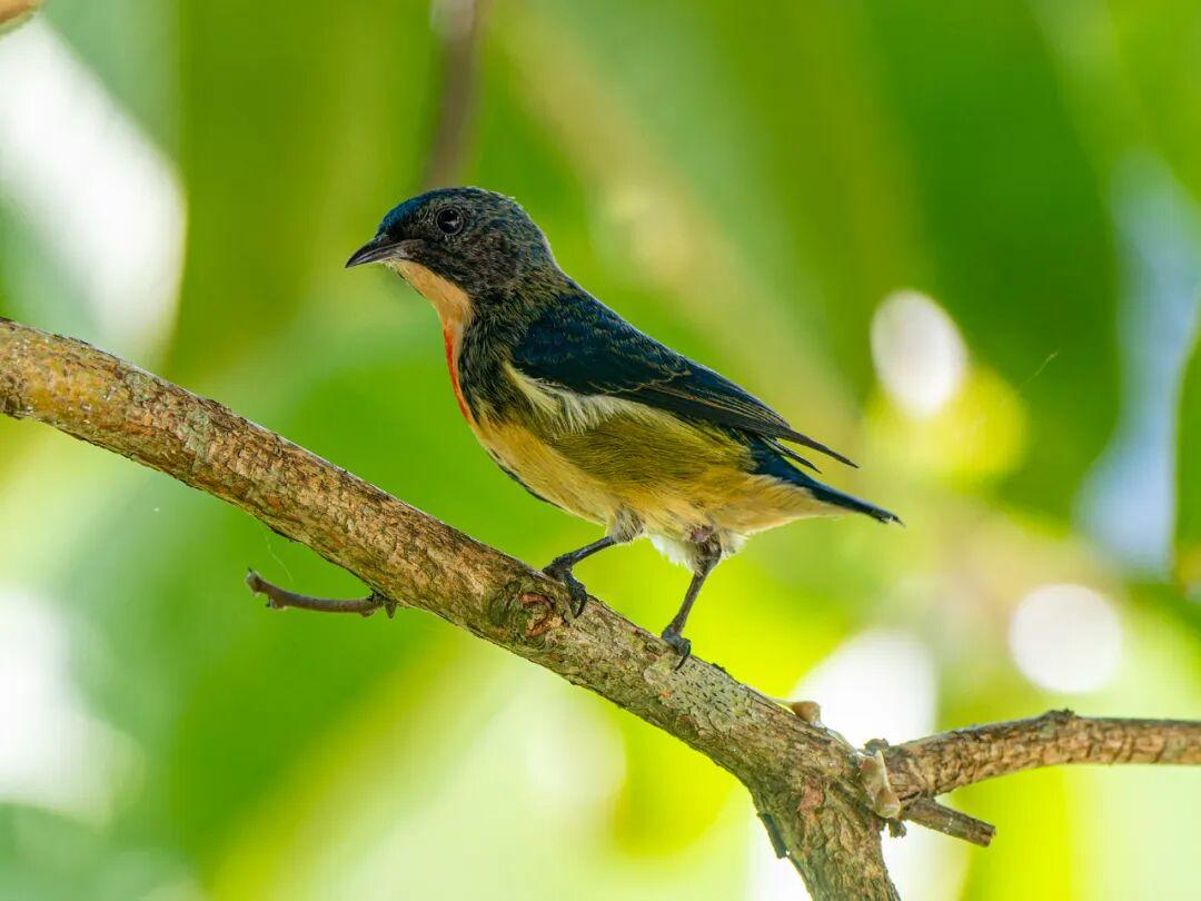 广西拍过他,海南拍过他,云南又遇到他,但是这次真的好近好近。红胸啄花鸟(学名:Dicaeum ignipectus):体重5-10克,体长60-92毫米。体形纤小。雄鸟上体呈辉亮的金属绿色;下体棕黄,胸部具一朱红色块斑,极易与其他啄花鸟区别。雌鸟上体呈橄榄绿,下体棕黄色。虹膜褐色,嘴褐黑色或角灰色,跗蹠暗褐色。幼鸟上嘴褐黑,下嘴红色;跗蹠呈铅灰色。