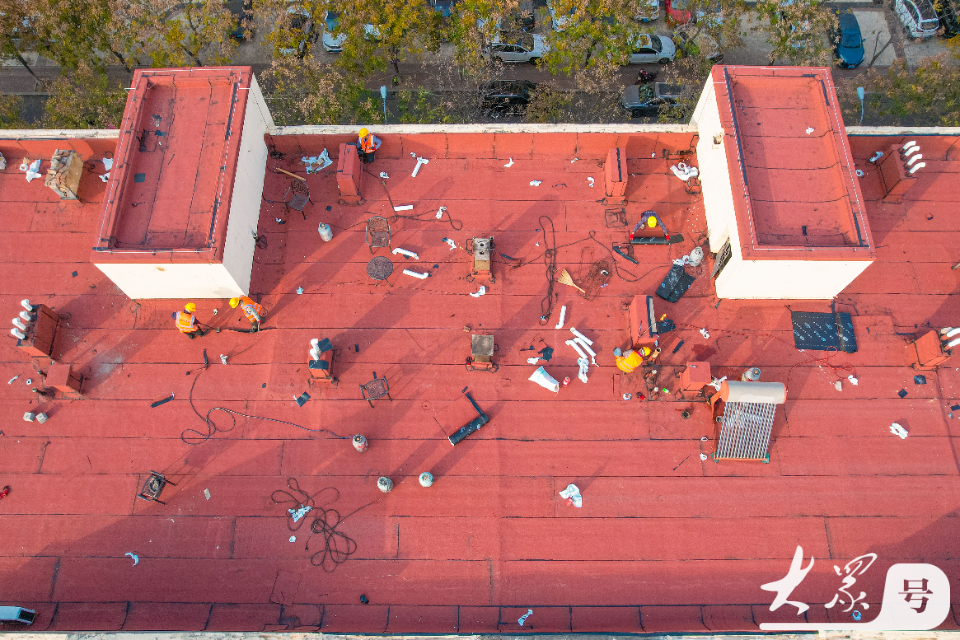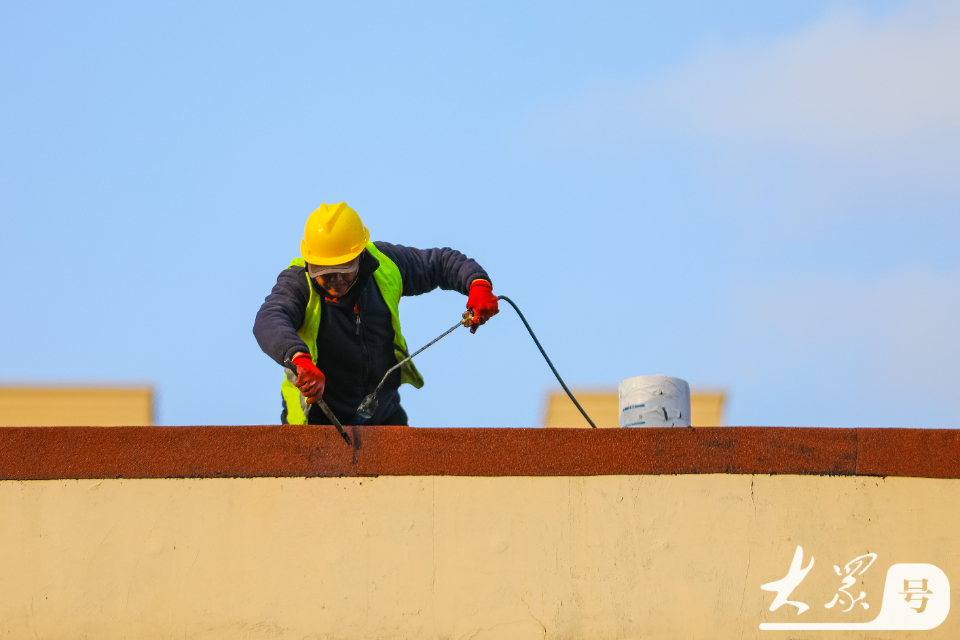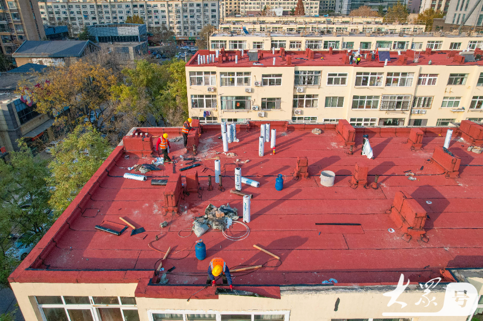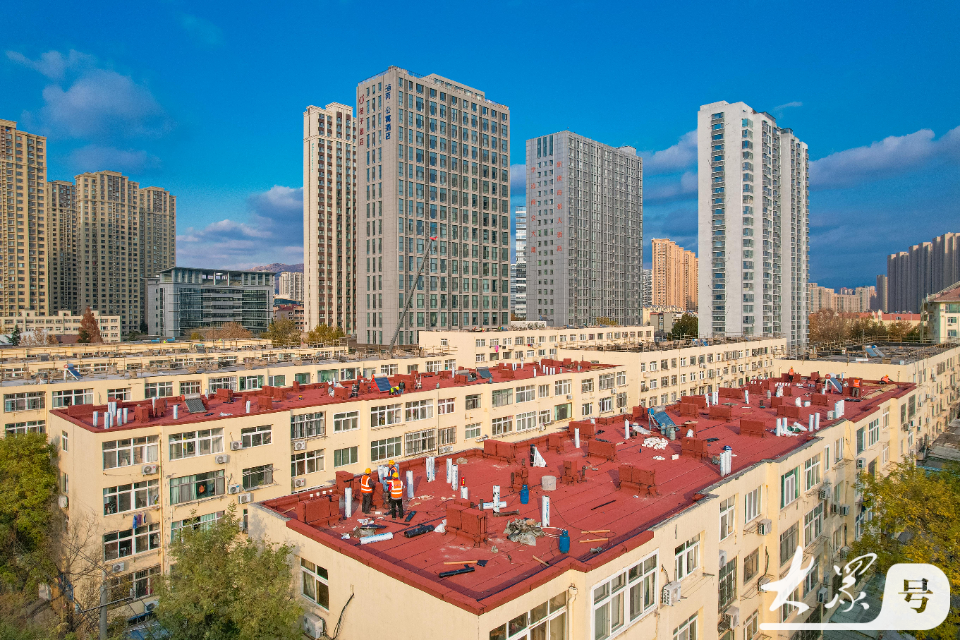 12月2日,在青岛市李沧区李村街道滨河路社区,施工人员对老旧小区楼顶进行防水作业。