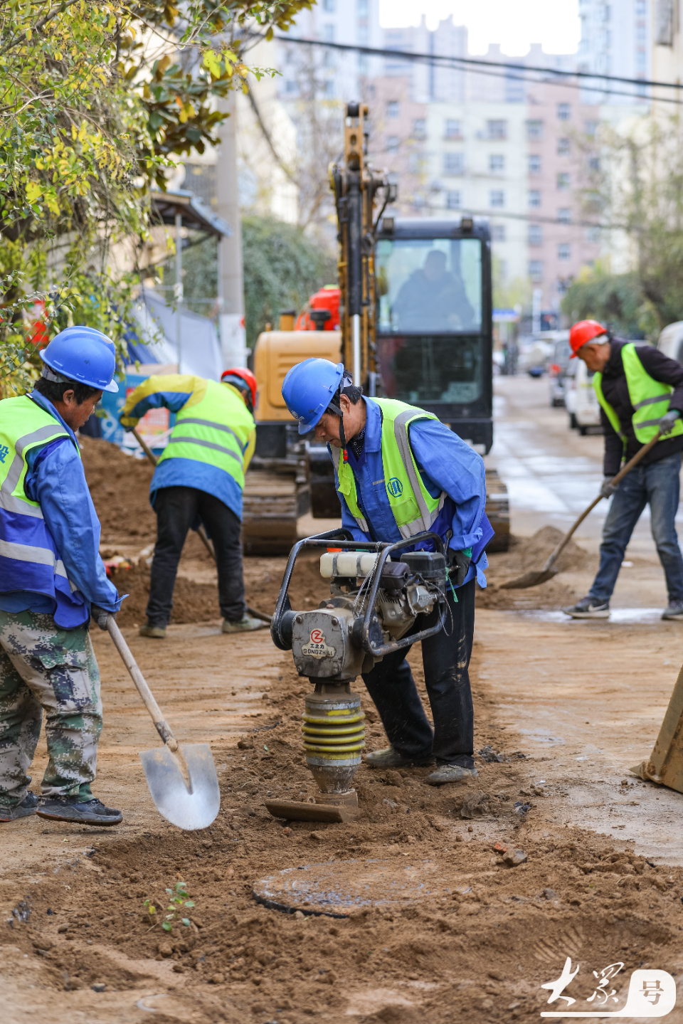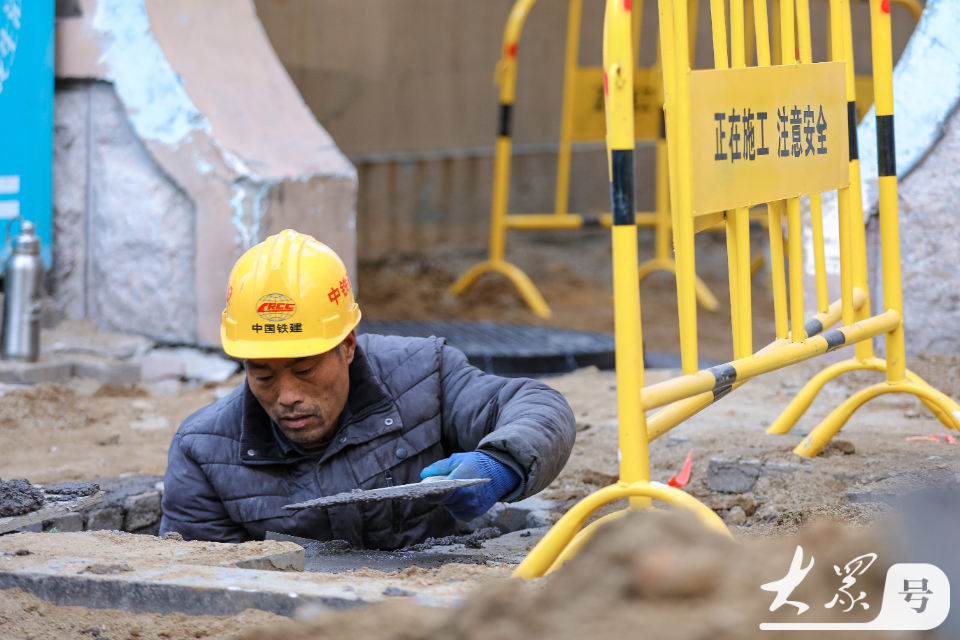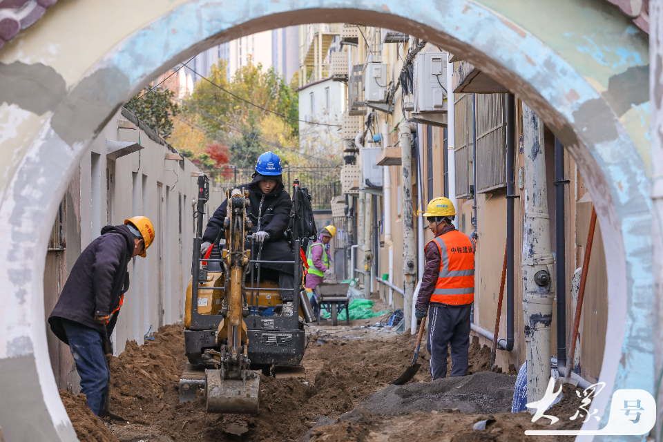 12月2日,在青岛市李沧区李村街道滨河路社区,施工人员对老旧小区地下管网进行改造。