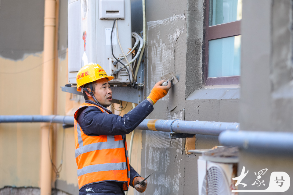 12月2日,在青岛市李沧区李村街道滨河路社区,施工人员对老旧小区外墙进行改造。