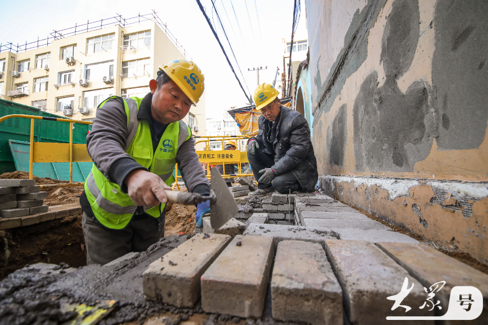 12月2日,在青岛市李沧区李村街道滨河路社区,施工人员对老旧小区进行改造。