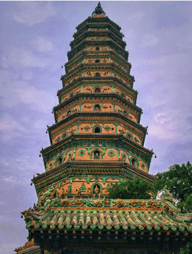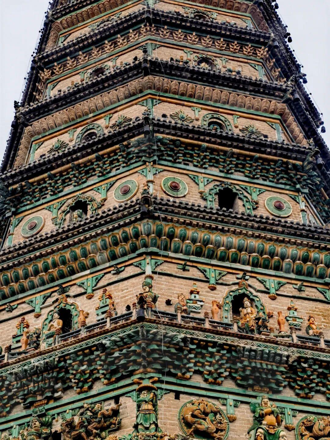 最令人叹为观止的是塔身琉璃装饰的密度与精细程度:金刚力士、菩萨罗汉、珍禽异兽、莲花宝相,无不栩栩如生。