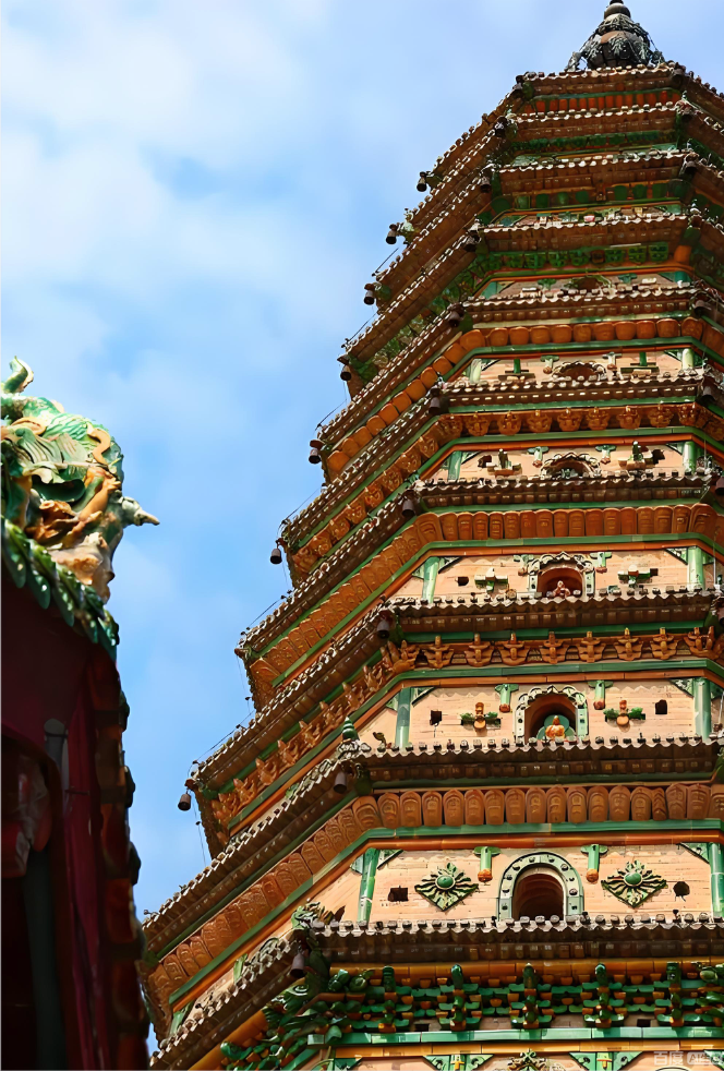 导游指着塔身说:“飞虹塔的造型堪称明代建筑艺术的巅峰之作。八角锥体的塔身全部以青砖砌筑,外部却镶嵌着数以万计的琉璃构件。这些琉璃烧制的仿木构件——斗拱、椽飞、栏板、垂莲柱——在阳光下折射出孔雀蓝、翡翠绿、琥珀黄、玛瑙红等瑰丽色彩。塔身共十三层,高47.31米,每层檐角都悬挂铜铃,风过时清音远播。”