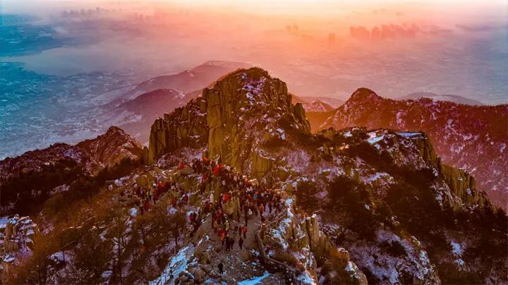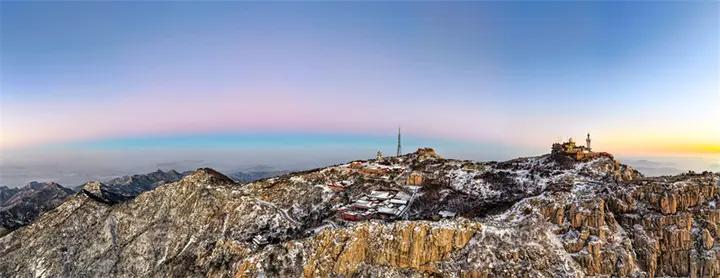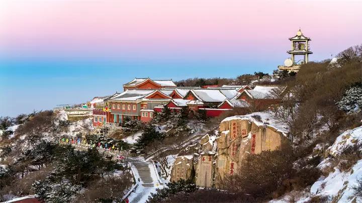 摩崖石刻被白雪勾勒出清晰轮廓,苍劲字迹在素白底色下愈显厚重。十八盘石阶如银丝带蜿蜒向上,连接雪峰。阳光穿透云层洒下,雪面泛着晶莹光泽,尽展泰山冬日的独特神韵。