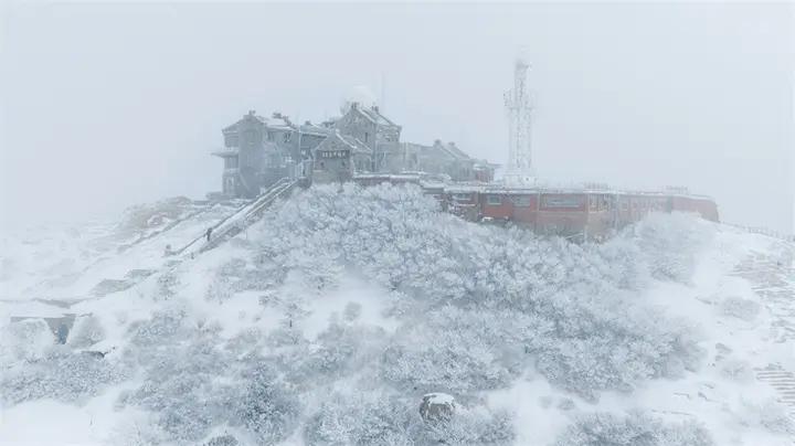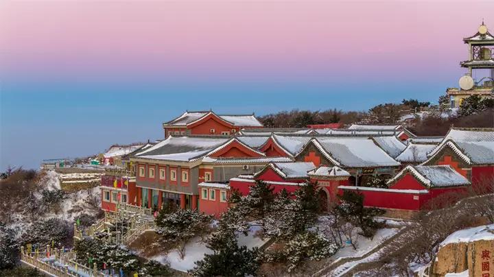 白雪覆盖千峰万壑,峰峦在云雾中若隐若现,宛如水墨长卷徐徐展开。山间古松玉树琼枝,松针托着蓬松积雪随风轻晃;红墙黛瓦的古建筑群被白雪包裹,覆雪的殿宇楼阁飞檐翘角,宛若天宫琼楼玉宇落于人间,朱红宫墙点缀其间,更添几分雅致与庄严。