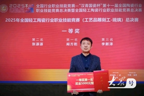 12月17日,2025年全国行业职业技能竞赛——“汉青国瓷杯”第十一届全国陶瓷行业职业技能竞赛总决赛暨2025年全国轻工陶瓷行业职业技能竞赛总决赛在淄博汉青国瓷艺术中心隆重开幕。竞赛中,作为非遗传承人与山东省工艺美术大师,博山陶瓷琉璃艺术中心艺术总监阚方乾以精湛绝伦的琉璃雕刻技艺和锐意创新的艺术表达,再度斩获工艺品雕刻(琉璃)项目一等奖,就此达成连续两年荣获全国职业技能大赛一等奖的佳绩。