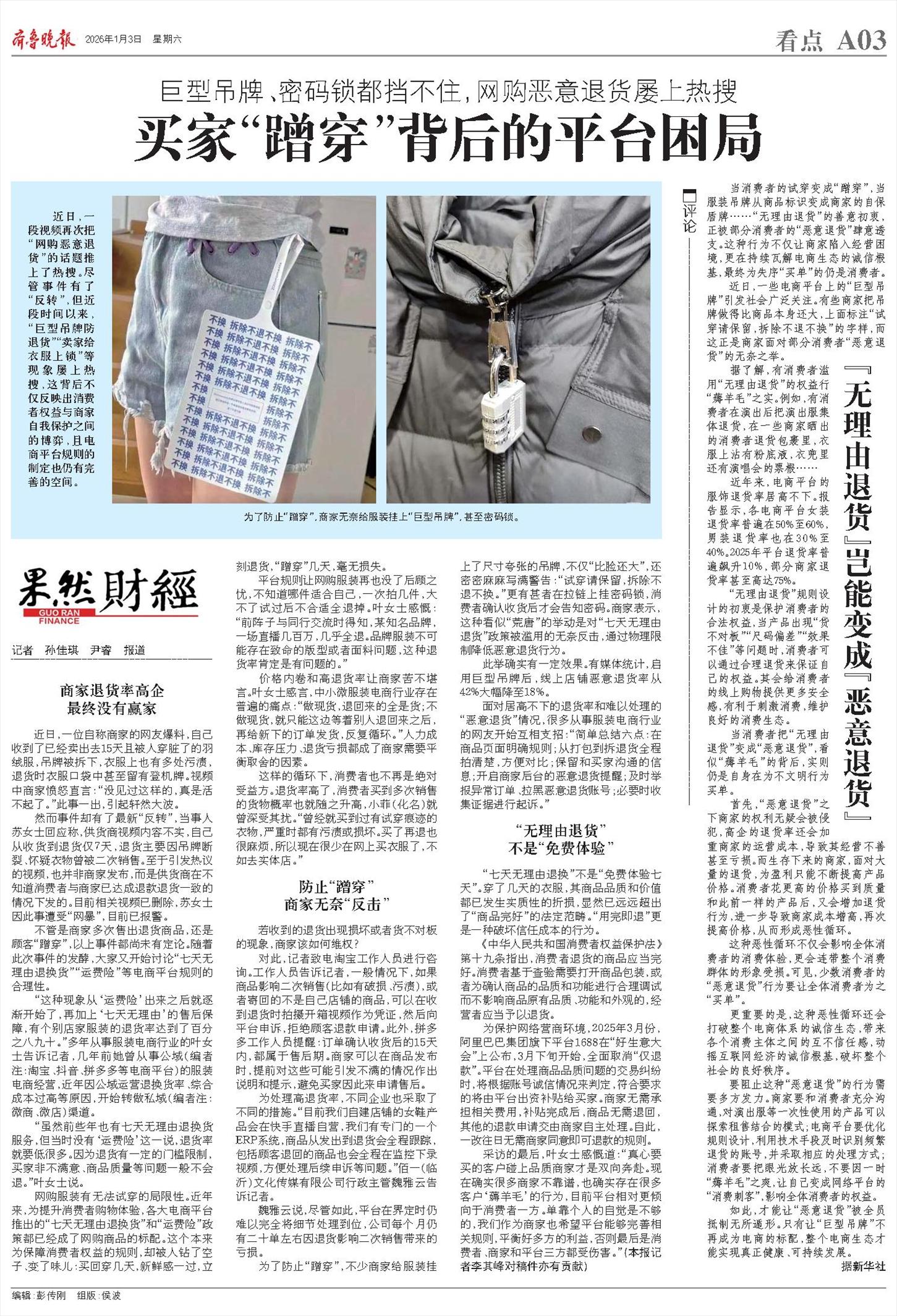 此举确实有一定效果。有媒体统计,启用巨型吊牌后,线上店铺恶意退货率从42%大幅降至18%。