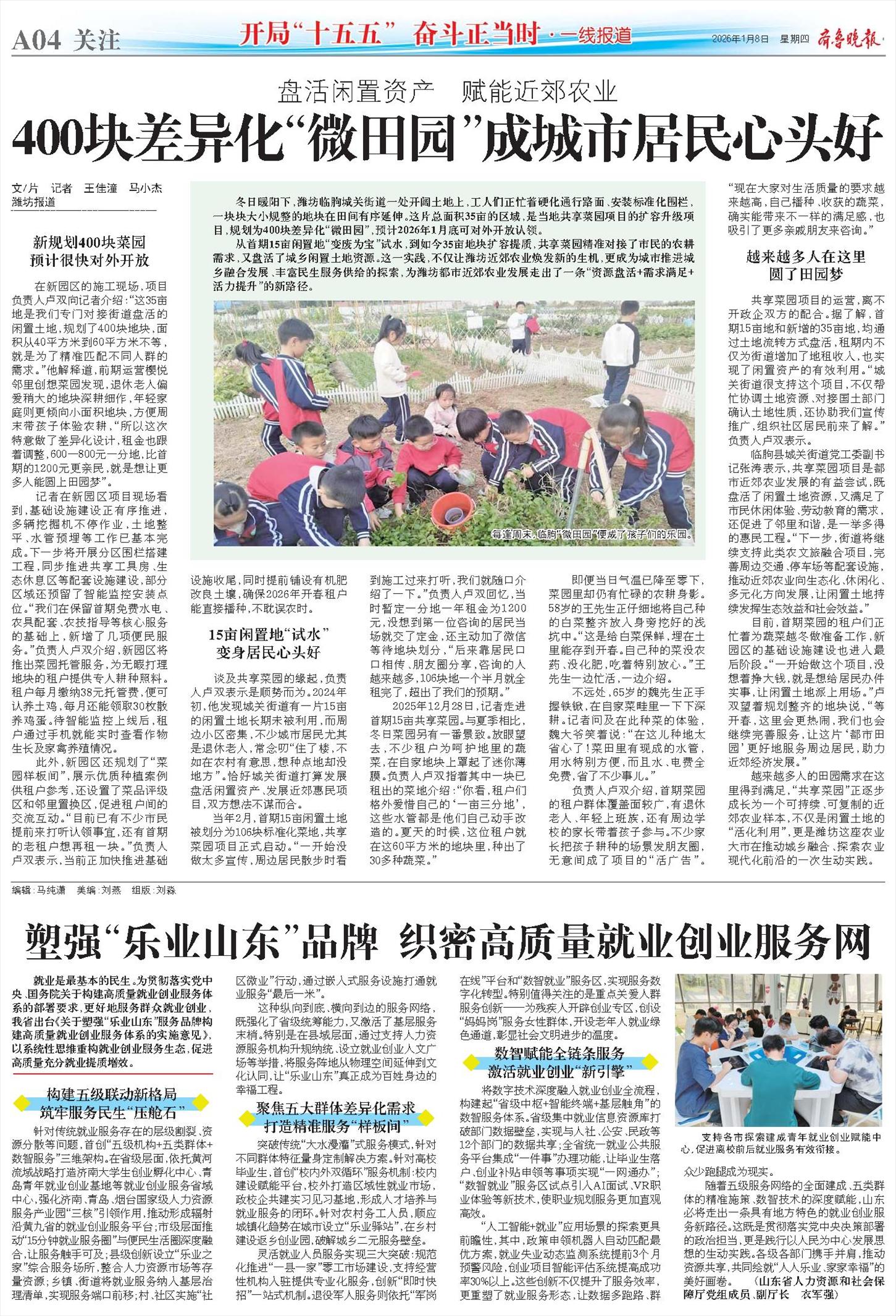 从首期15亩闲置地“变废为宝”试水,到如今35亩地块扩容提质,共享菜园精准对接了市民的农耕需求,又盘活了城乡闲置土地资源。这一实践,不仅让潍坊近郊农业焕发新的生机,更成为城市推进城乡融合发展、丰富民生服务供给的探索,为潍坊都市近郊农业发展走出了一条“资源盘活+需求满足+活力提升”的新路径。