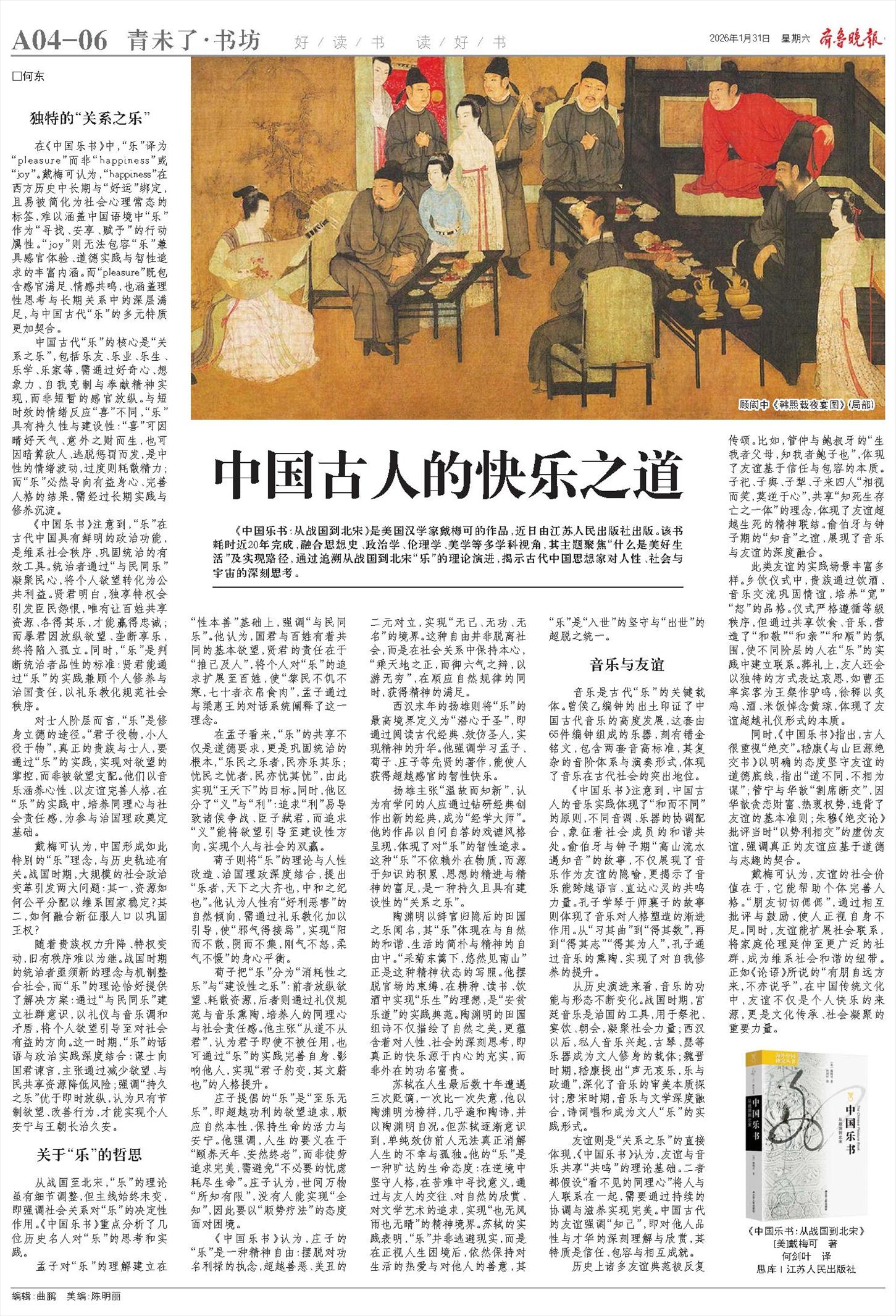 在《中国乐书》中,“乐”译为“pleasure”而非“happiness”或“joy”。戴梅可认为,“happiness”在西方历史中长期与“好运”绑定,且易被简化为社会心理常态的标签,难以涵盖中国语境中“乐”作为“寻找、安享、赋予”的行动属性。“joy”则无法包容“乐”兼具感官体验、道德实践与智性追求的丰富内涵。而“pleasure”既包含感官满足、情感共鸣,也涵盖理性思考与长期关系中的深层满足,与中国古代“乐”的多元特质更加契合。