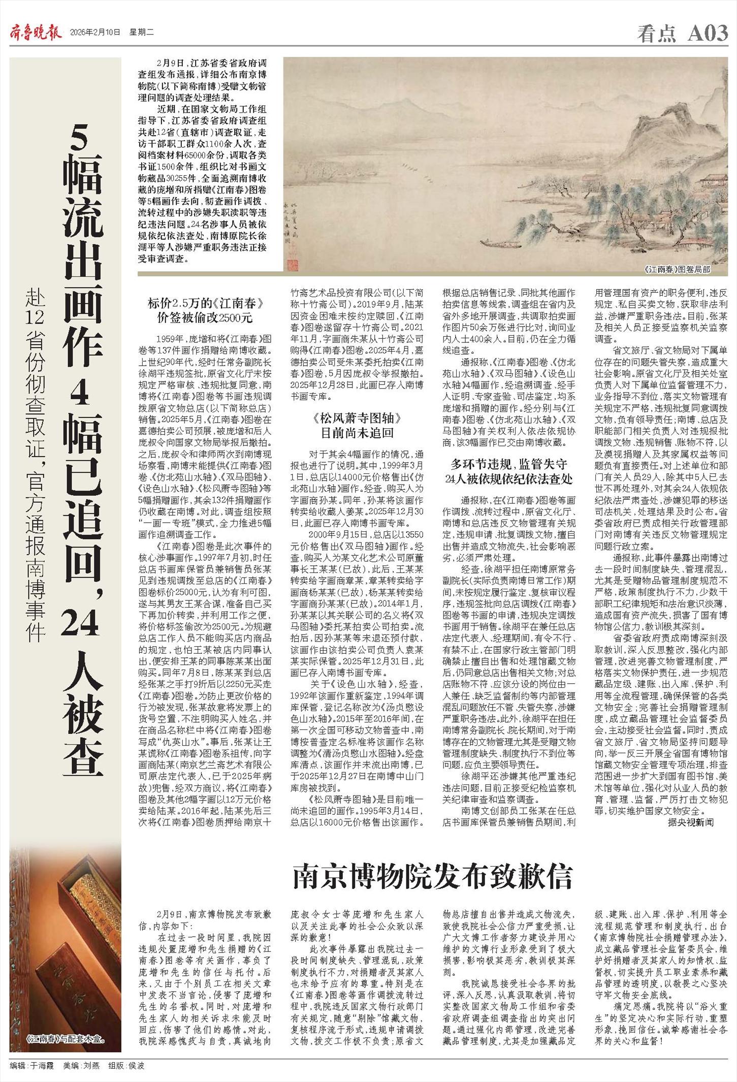 近期,在国家文物局工作组指导下,江苏省委省政府调查组共赴12省(直辖市)调查取证,走访干部职工群众1100余人次,查阅档案材料65000余份,调取各类书证1500余件,组织比对书画文物藏品30255件,全面追溯南博收藏的庞增和所捐赠《江南春》图卷等5幅画作去向,彻查画作调拨、流转过程中的涉嫌失职渎职等违纪违法问题。24名涉事人员被依规依纪依法查处,南博原院长徐湖平等人涉嫌严重职务违法正接受审查调查。