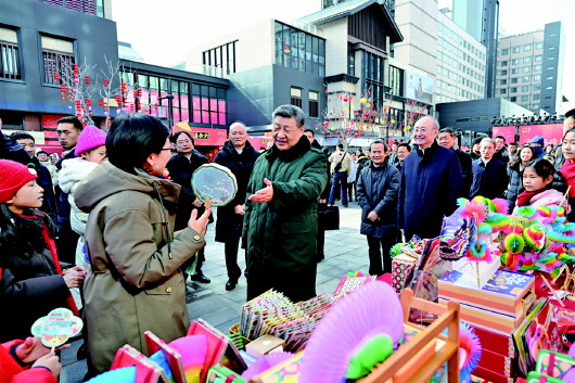 正值农历小年,隆福大厦前,新春市集吸引了大量市民和游客。习近平饶有兴致察看各式年货摊位,同现场群众亲切交流。他愉快地向大家讲起年少时多次到隆福寺的情景,还购买了几份特色食品和文创产品。