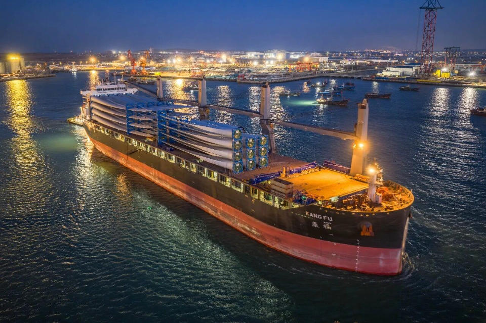 业务开展期间,烟台港与风电制造企业建立良好互动合作,结合多方需求,设计“一港直装、整机发运”模式,通过陆运方式将风筒、叶片、电机等新能源装备运至烟台港集港装船出海,提供免费堆场,降低综合物流成本。凭借烟台港件杂货“直达”航线及专业化码头,实现出口货物在港口24小时无间歇装船,进一步压缩船舶在港时间,助力“中国制造”加速出海。