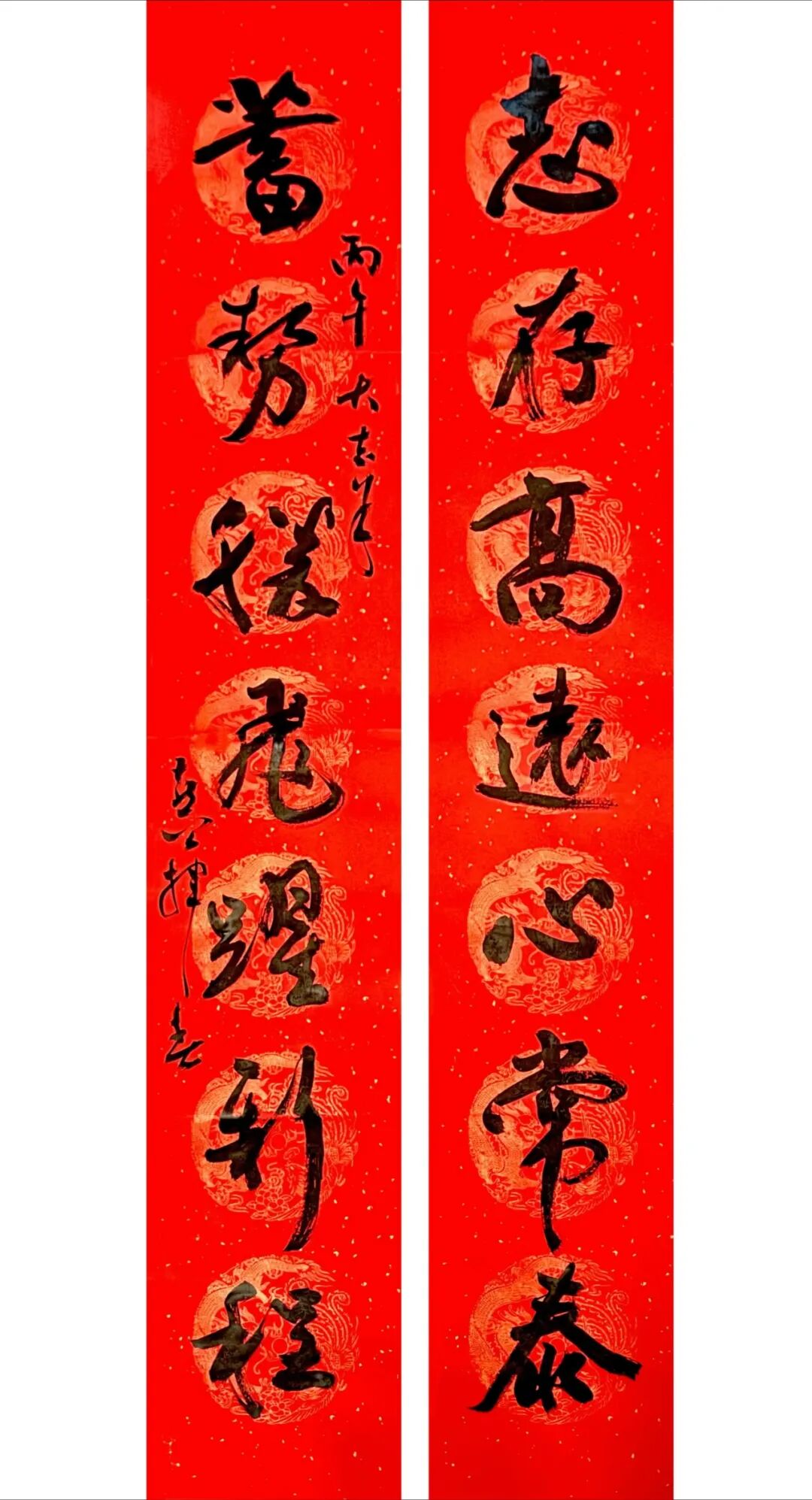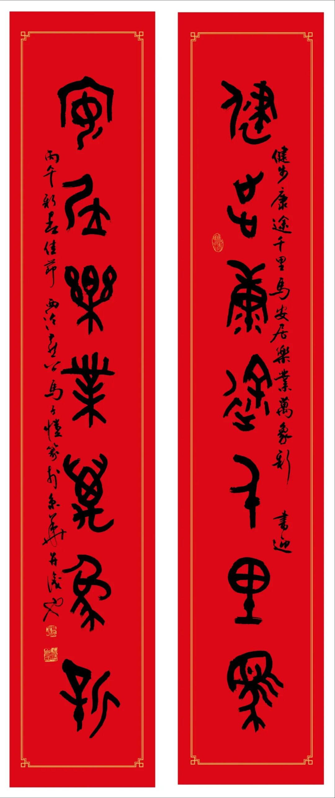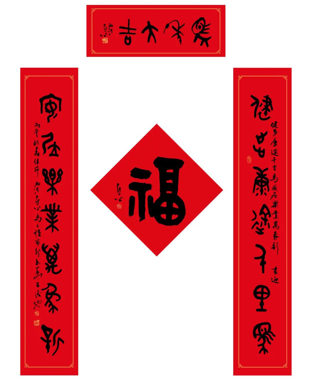 岁次丙午,序属新春。万象更始,九州同庆。西泠名家马子恺先生,承三代吉金遗韵,秉古篆薪传之挥毫泼墨,撰书春联福字,以襄盛节。