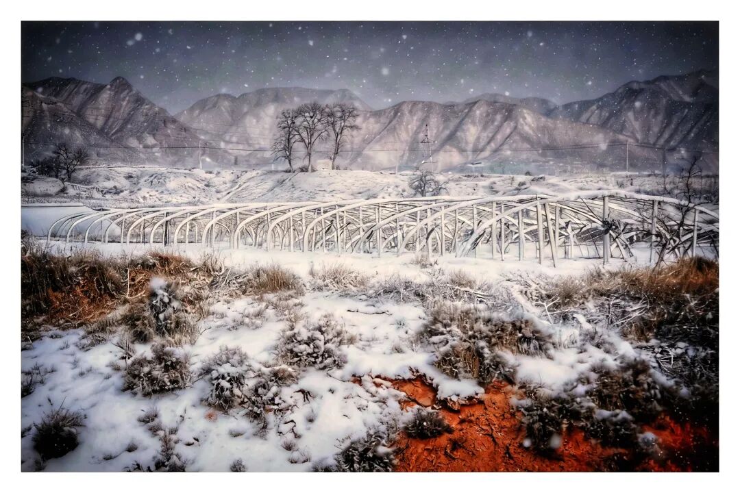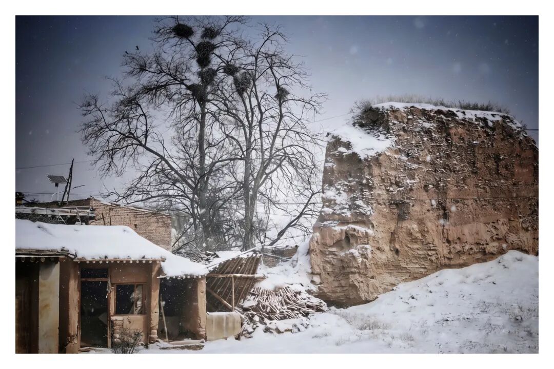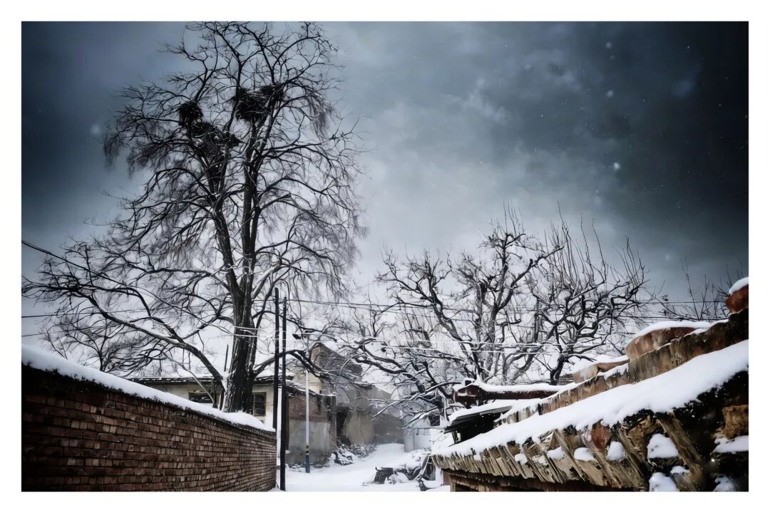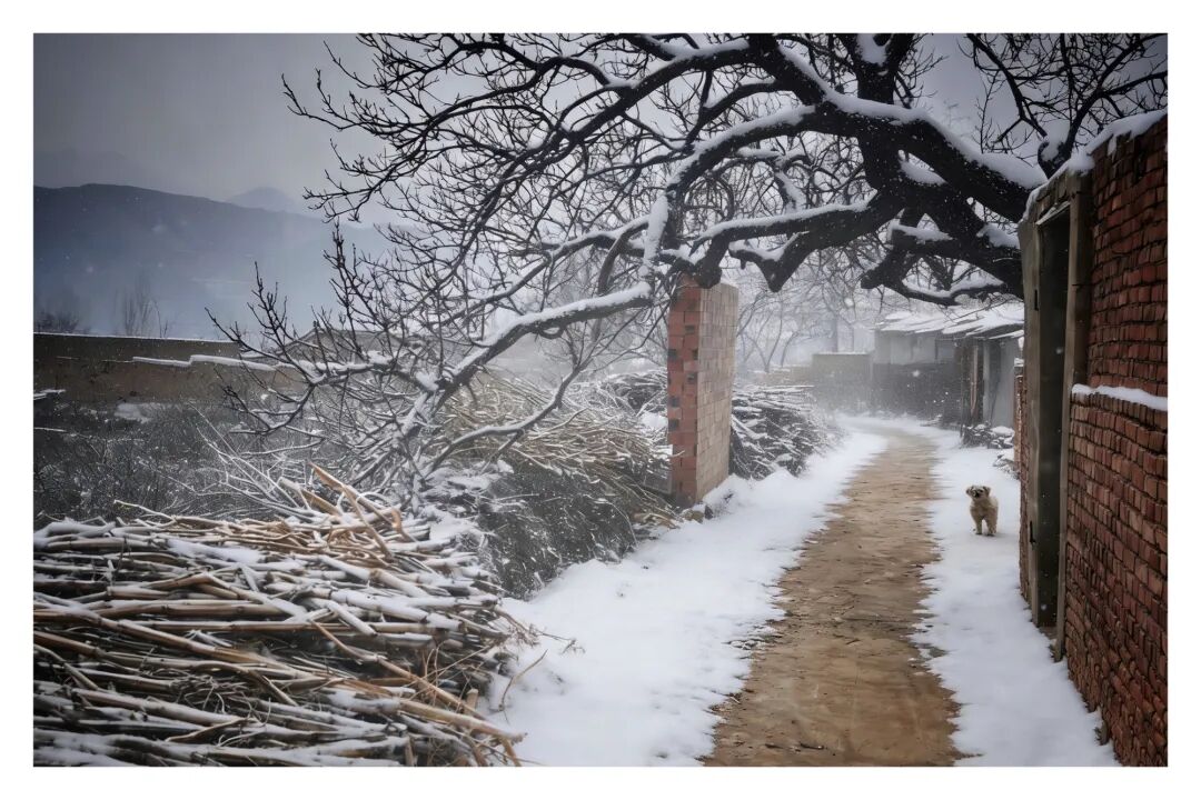 雪落无声,却将农舍的烟火气、田垄的褶皱、老树虬结的骨相,都洗得干干净净。