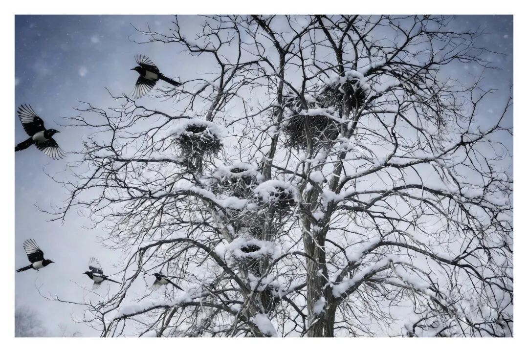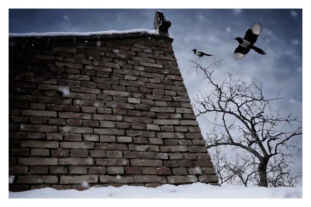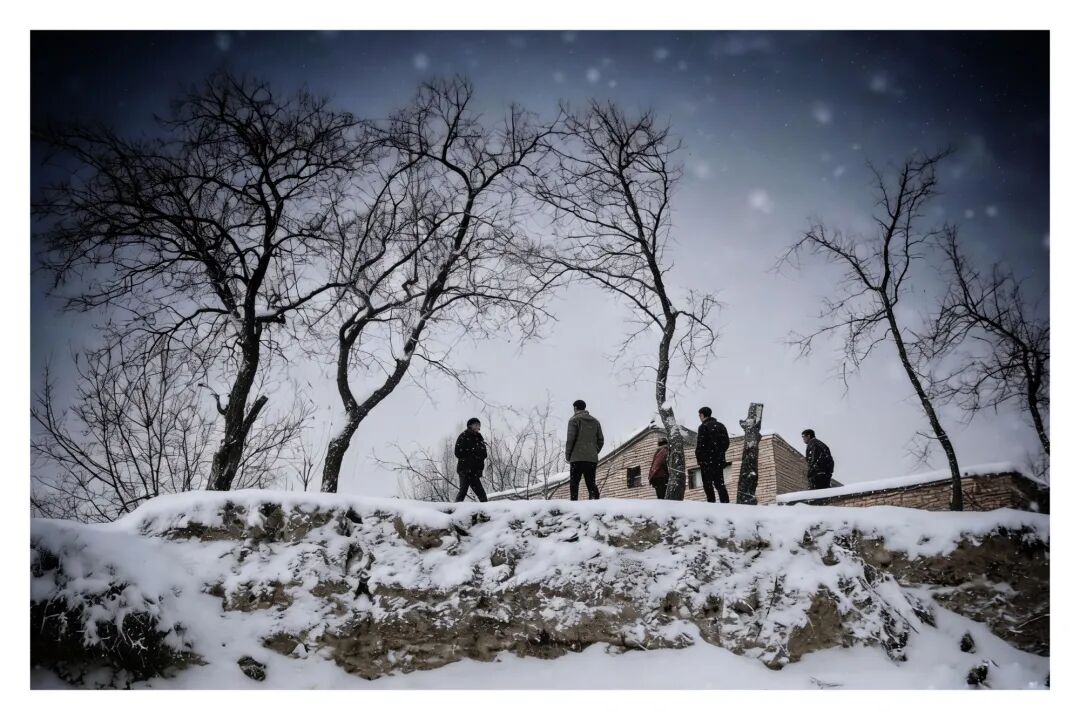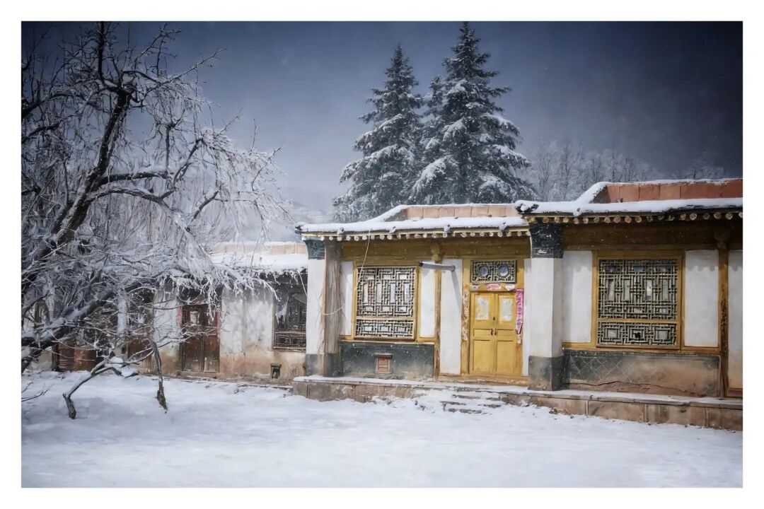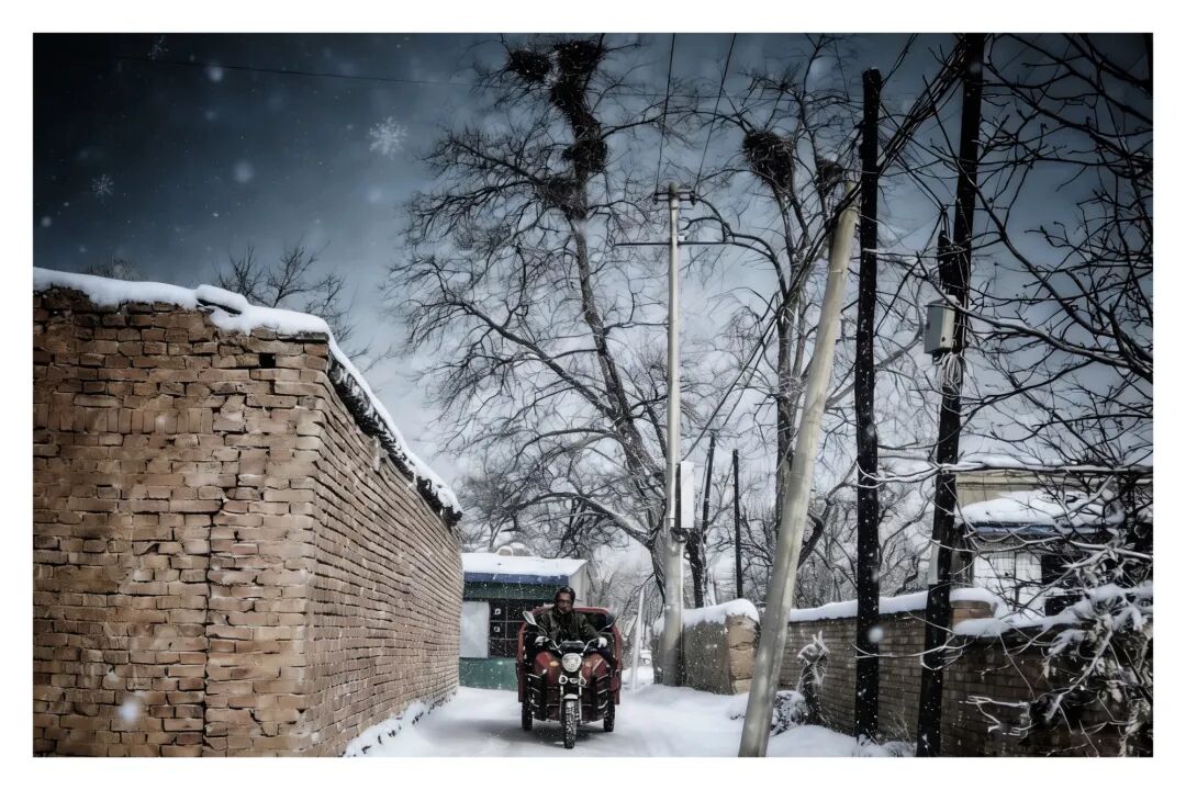 雪落无声,却将农舍的烟火气、田垄的褶皱、老树虬结的骨相,都洗得干干净净。