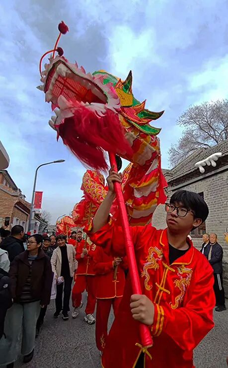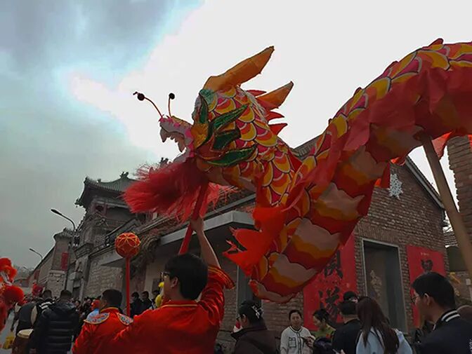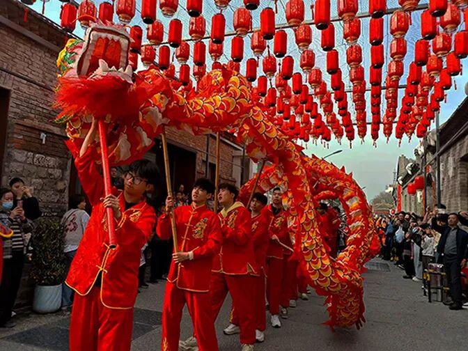 那条巨型彩龙显然不再孤单,“活灵活现”的舞龙队伍也出现在老街上。铿锵有力的锣鼓声中,一个个身着一身红装的舞龙者,配合默契,尽情舞动,一条红色的游龙闪着金鳞的光芒,穿行于主街,时而腾空,时而盘旋,时而俯冲,为节日的老街点燃了激情与活力。