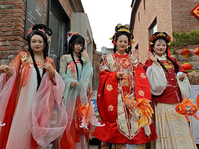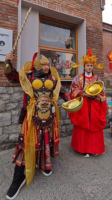 初五俗称“破五”,为传统的迎财神之日。装扮喜庆的“文武财神”来到熙熙攘攘的游人中间,向游客送福,给游客助兴,与游客合影。