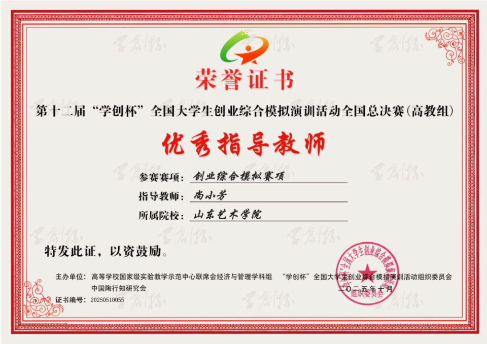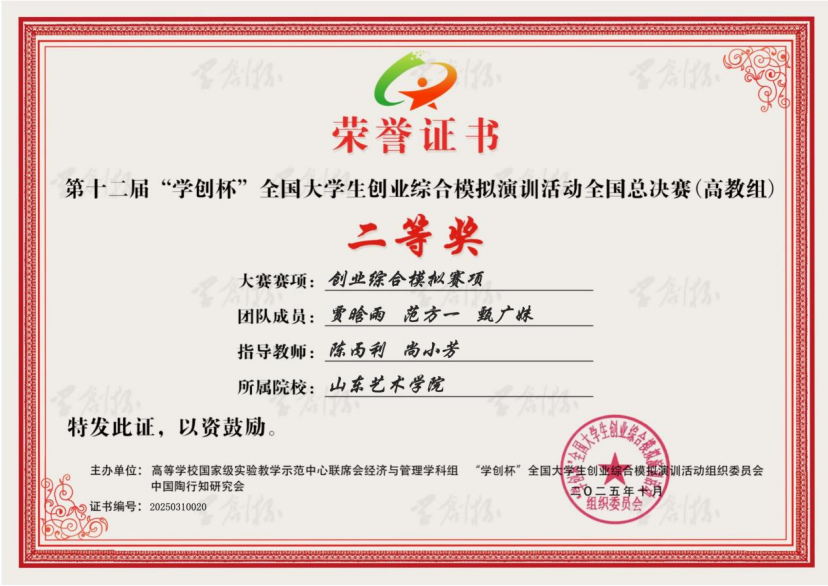自大赛启动以来,学校积极组织赛事选拔,并推荐优秀团队参加山东省选拔赛。经过层层筛选,艺术管理学院团队凭借出色的表现,以省赛第一名的成绩进入全国半决赛。备赛期间,团队深入解析赛事规则,系统搜集行业资源,多轮线上模拟竞赛打磨项目方案、优化运营策略,最终斩获全国大学生创业综合模拟演训活动全国总决赛(高教组)二等奖。
