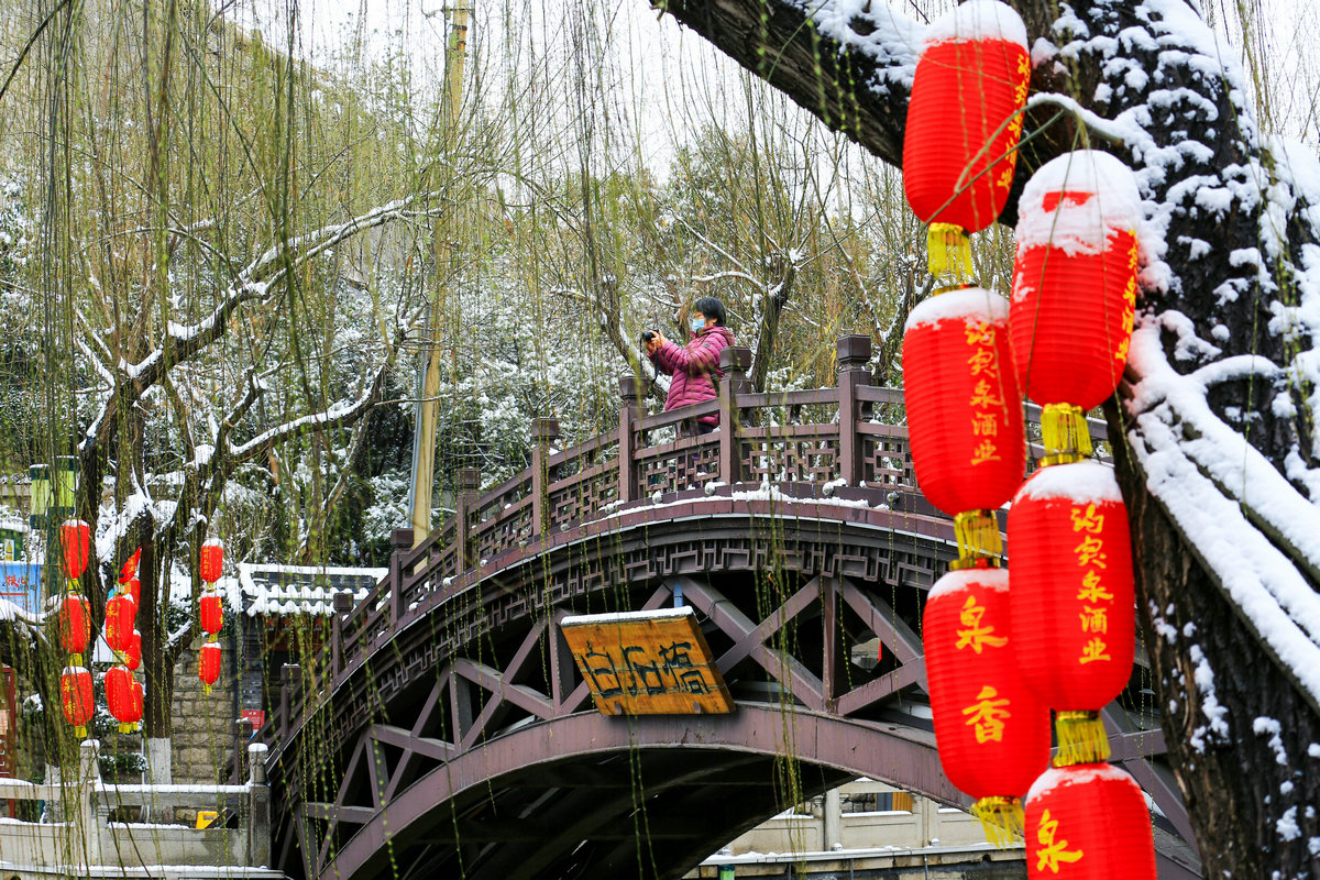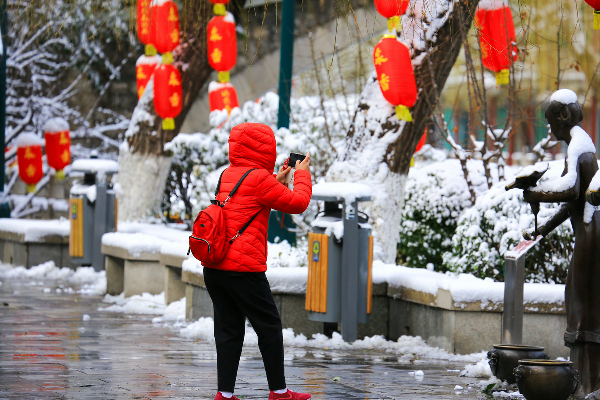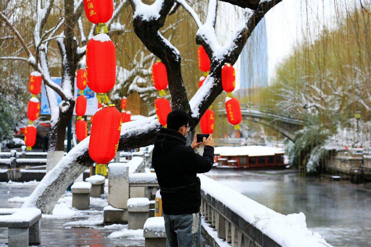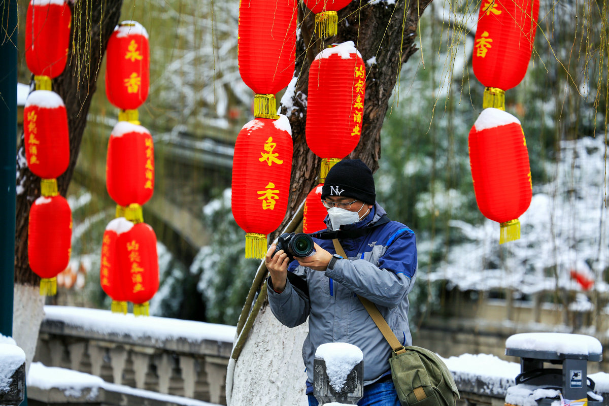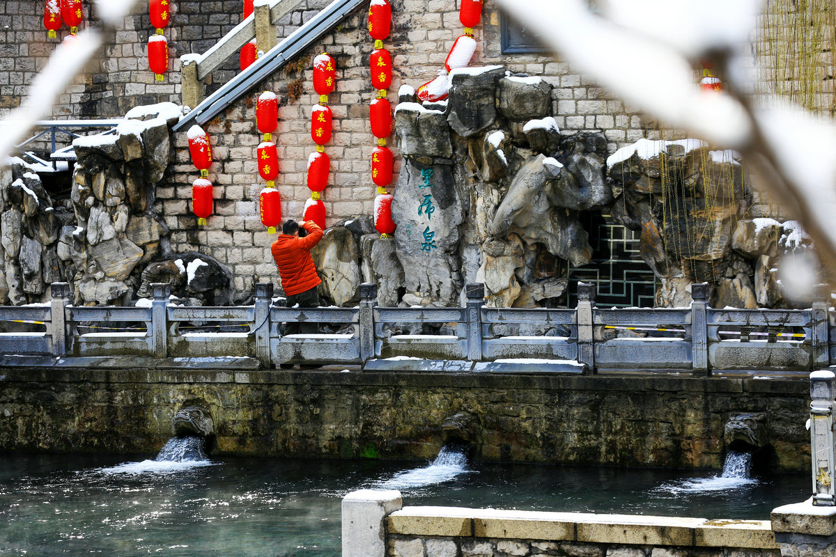 黑虎泉畔,几个游客举着相机,镜头对准石虎吐水的瞬间,雪粒在取景框里成了虚化的星点;青石板上,有年轻人仰头看雪落泉池,发梢沾的雪与飞溅的水花融成水珠,顺脸颊滑落。雪幕愈厚,泉池的倒影愈发模糊,唯石虎口中奔涌的水声如雷贯耳,撕开沉寂。