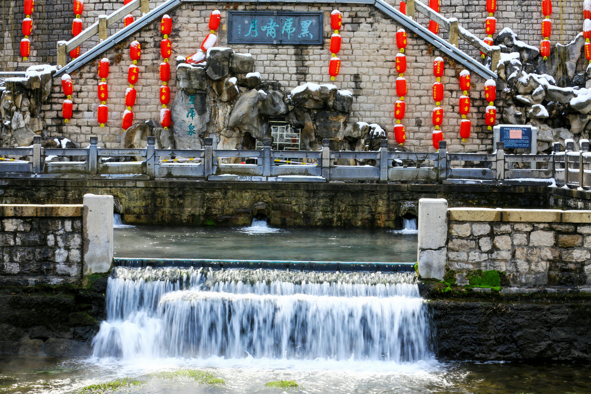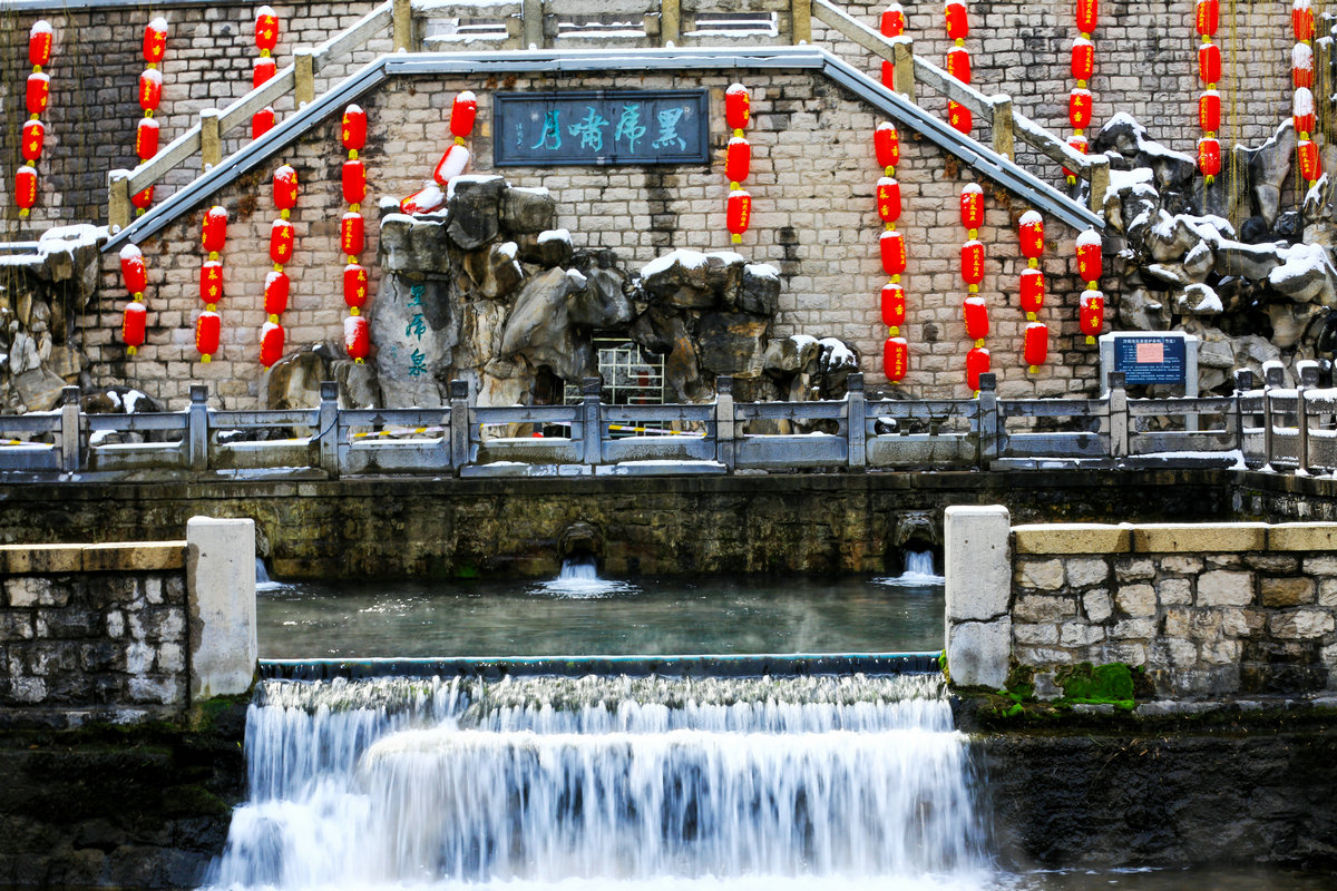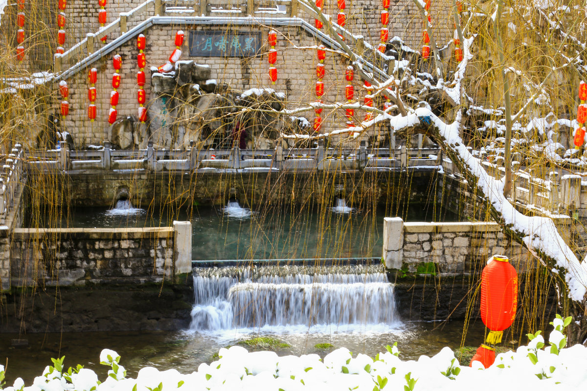 黑虎泉的三尊石虎兽首昂首吐玉,雪沫与泉水撞成白雾,又被风卷着扑向岸边灯笼。红绸灯罩已覆了层湿雪,暖黄的光晕却倔强地渗出来,将飘落的雪粒染成流动的金粉。