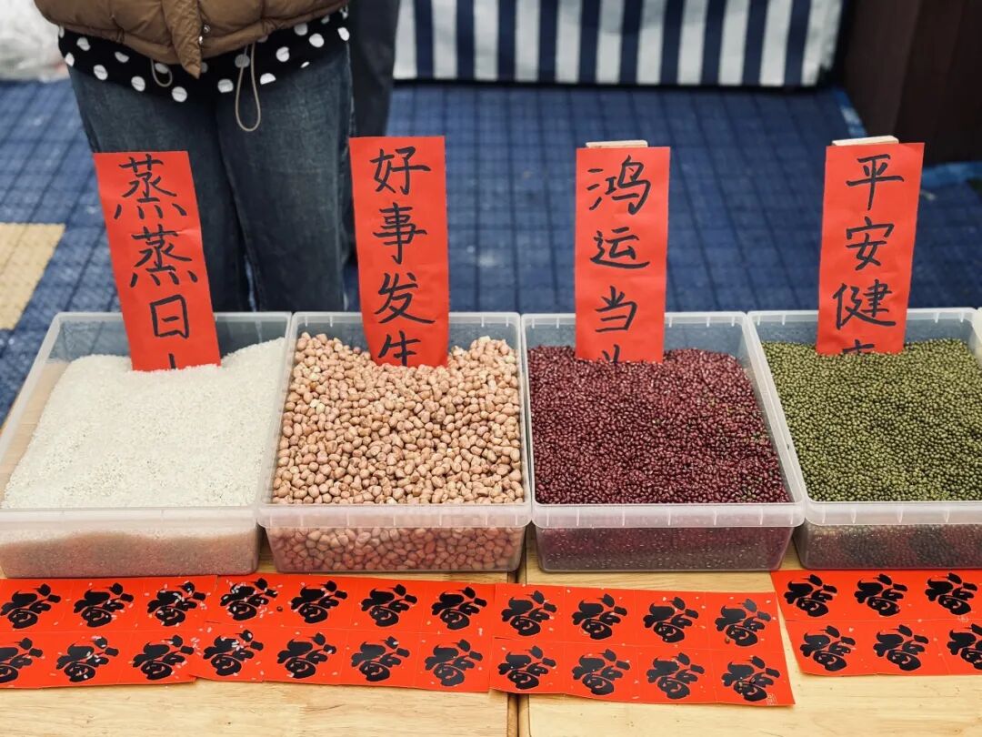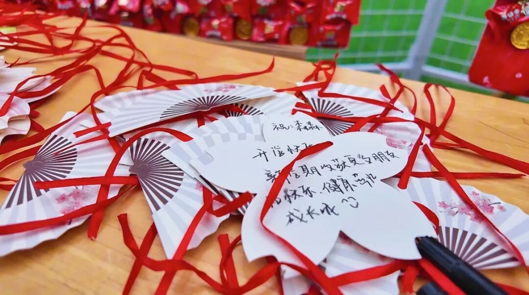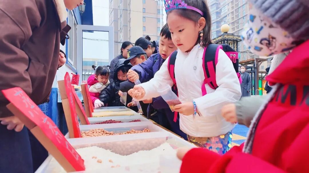 清晨的校园喜气洋洋,舞狮队与小马队灵动亮相,热情迎接每一位幼儿归来。孩子们在主题背景板前定格笑脸,带着期待与喜悦步入校园。在老师的引导下,孩子们亲手将花生米、红豆、绿豆等五谷杂粮装入福袋,贴上福字贴,把“紫气东来”“鸿运当头”“平安健康”的美好祝愿藏进小小福袋。大家还拿起画笔,写下学会新儿歌、与同伴分享玩具、快快长高的心愿,将愿望贴悬挂于展架,让梦想在春日里生根发芽。