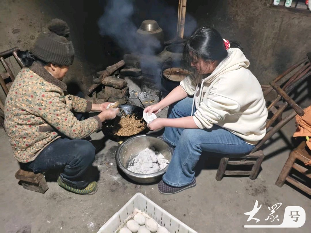图为服务队队员与当地村民一同揉制传统糕点。洪沥 供图