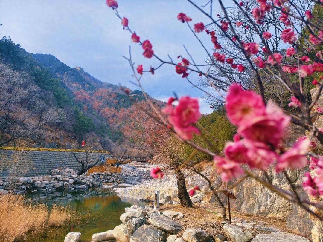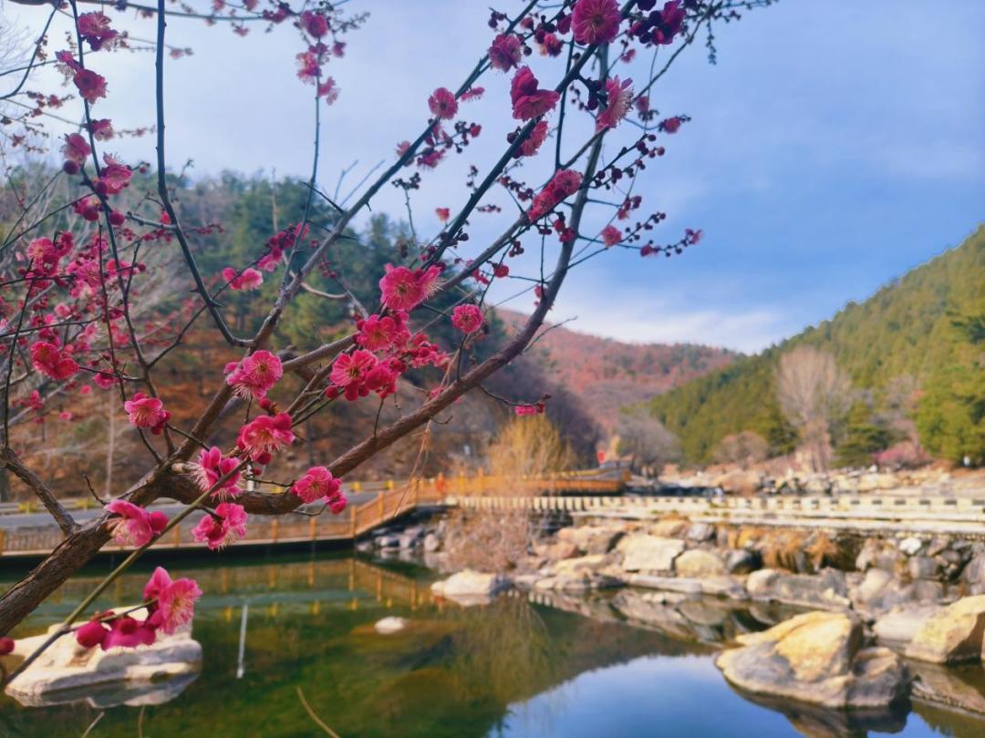 当第一缕春风掠过泰山西麓,彩石溪的梅花便迫不及待地绽放在枝头。粉艳的花朵缀满虬枝,与苍劲的山石、澄澈的溪水相映成趣。漫步溪畔,暗香浮动,花瓣随风轻落,飘在水面,随波逐流,像极了古画里的诗意场景。