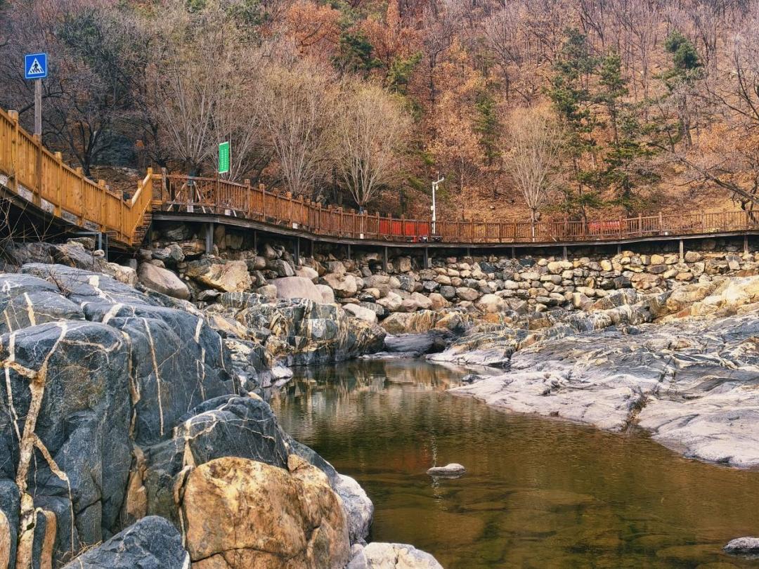 春日的彩石溪,是最适合慢游的地方。沿着木质栈道缓缓而行,脚下是叮咚溪水,眼前是漫山繁花,鼻尖是草木清香。可以驻足拍一张梅花与溪水的同框照,也可以蹲下身,看小鱼在石缝间穿梭,或是触摸带着青苔的山石,感受时光在泰山留下的痕迹。