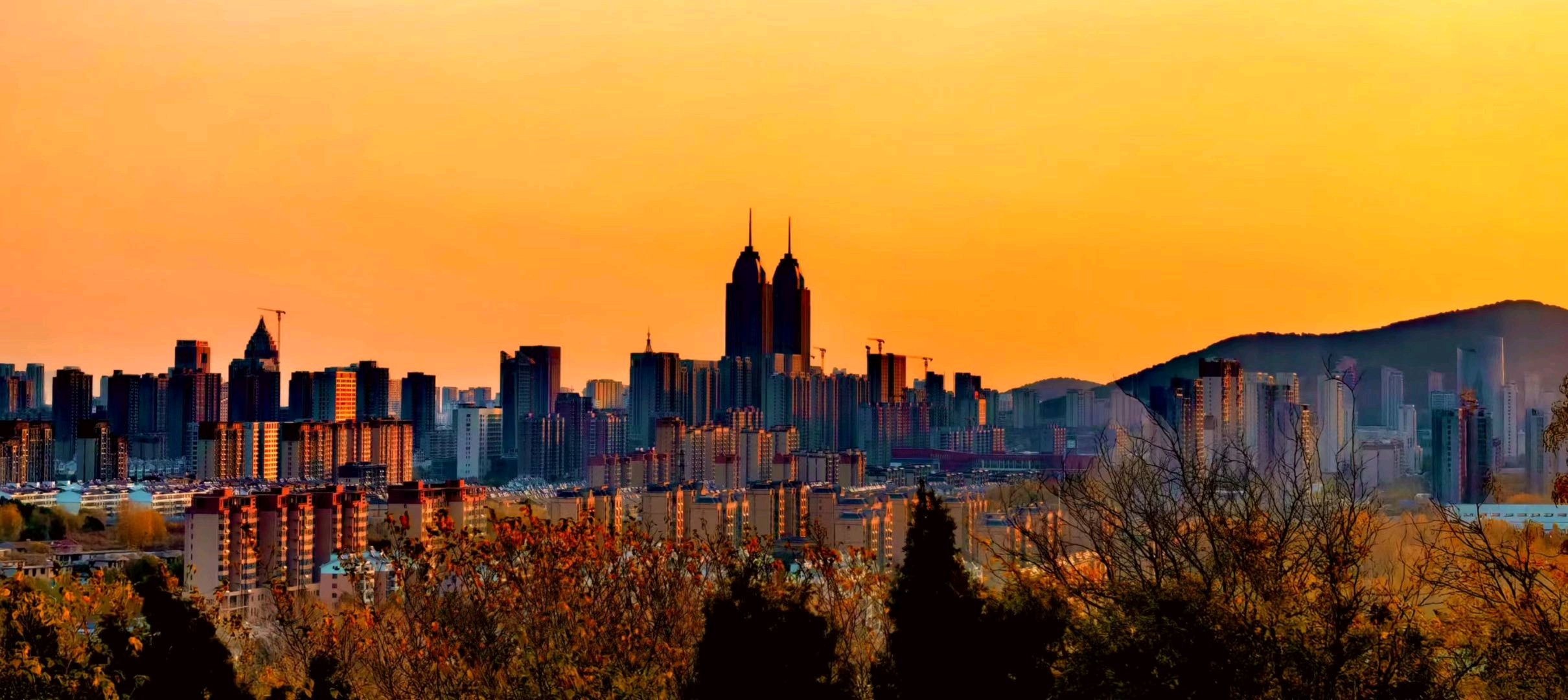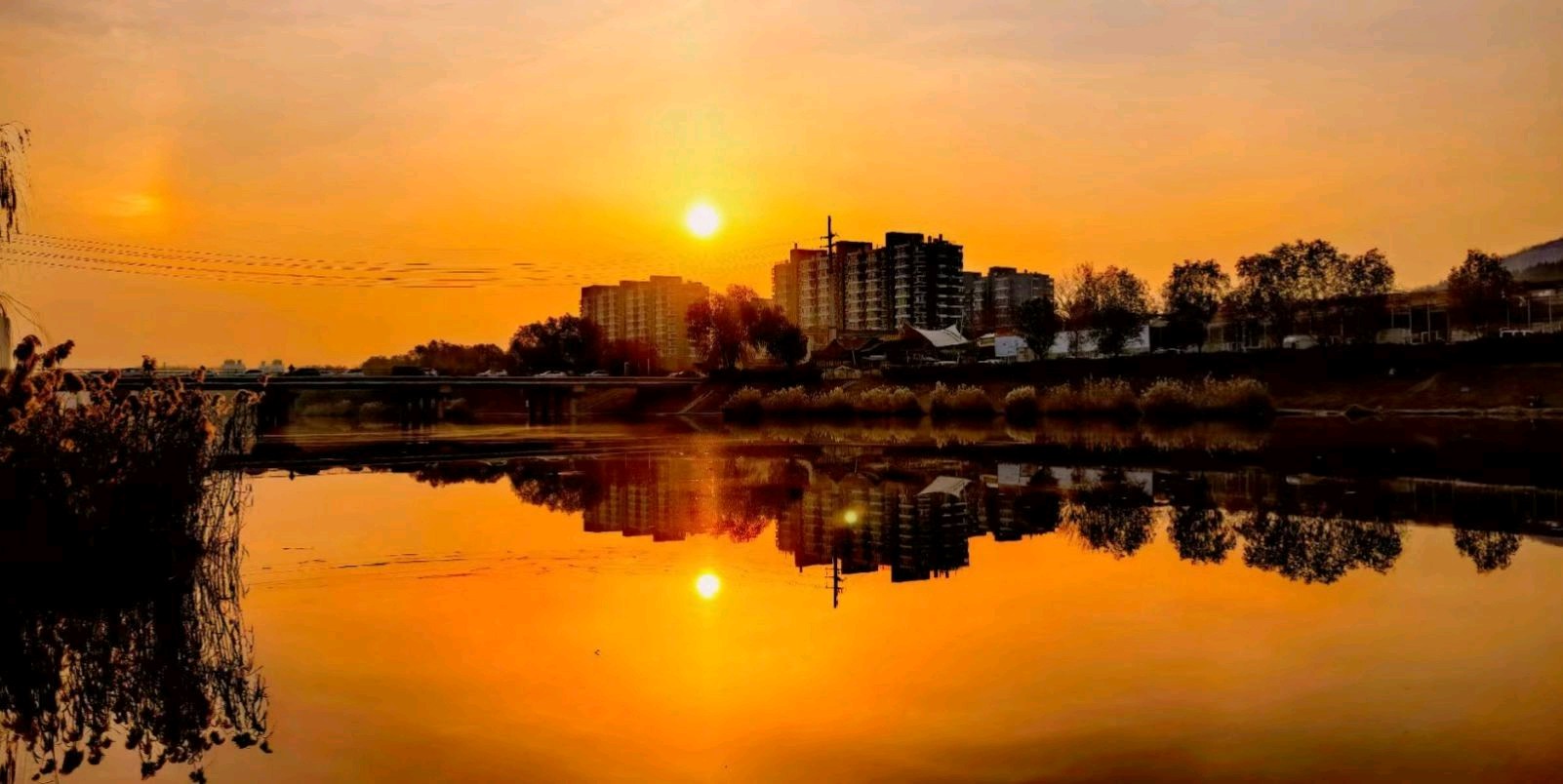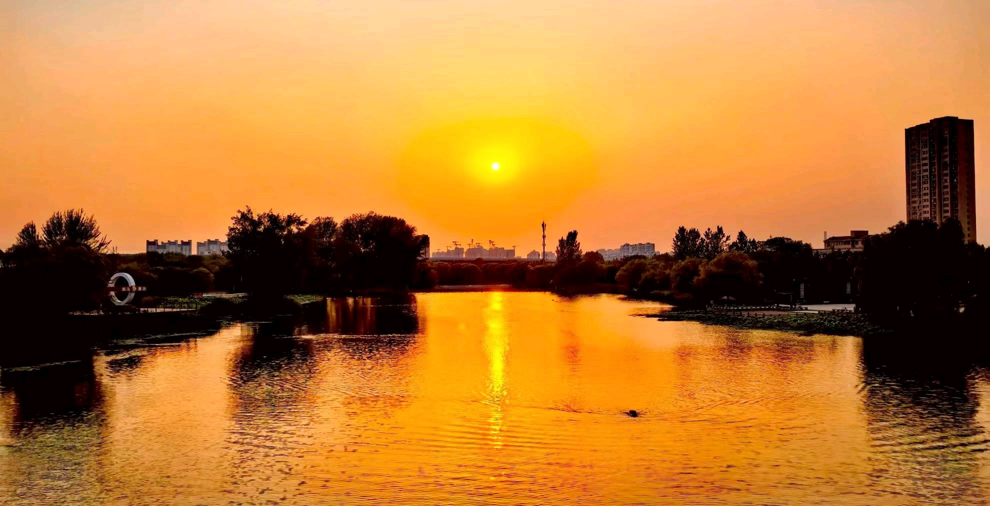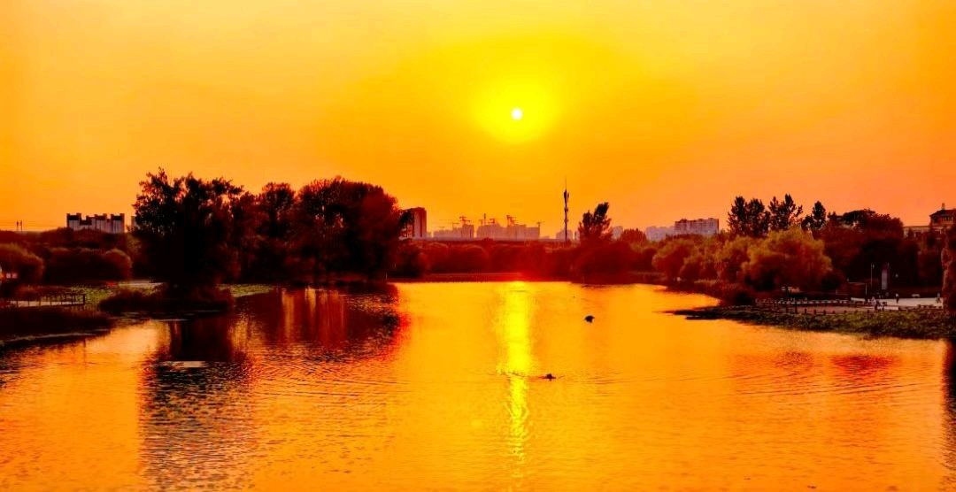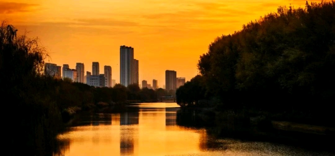 橙色的落日余晖洒在宁静的河面上,高楼林立的都市与金黄色的天空交相辉映,美得如同一幅画卷。