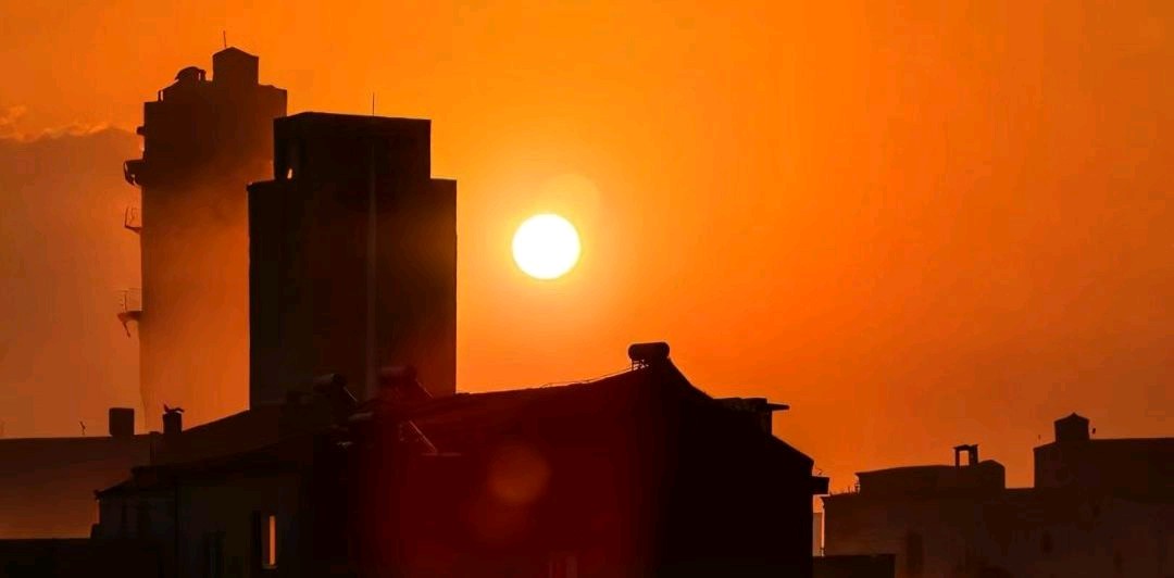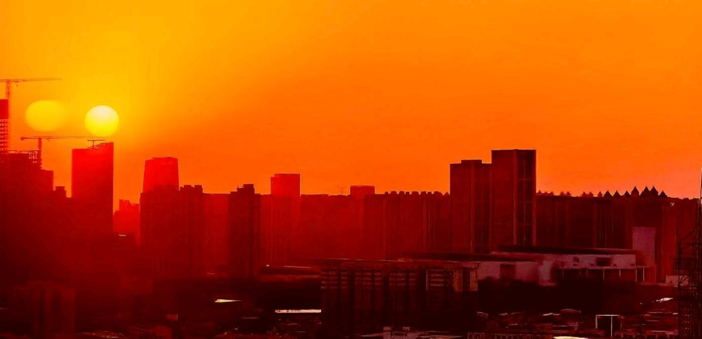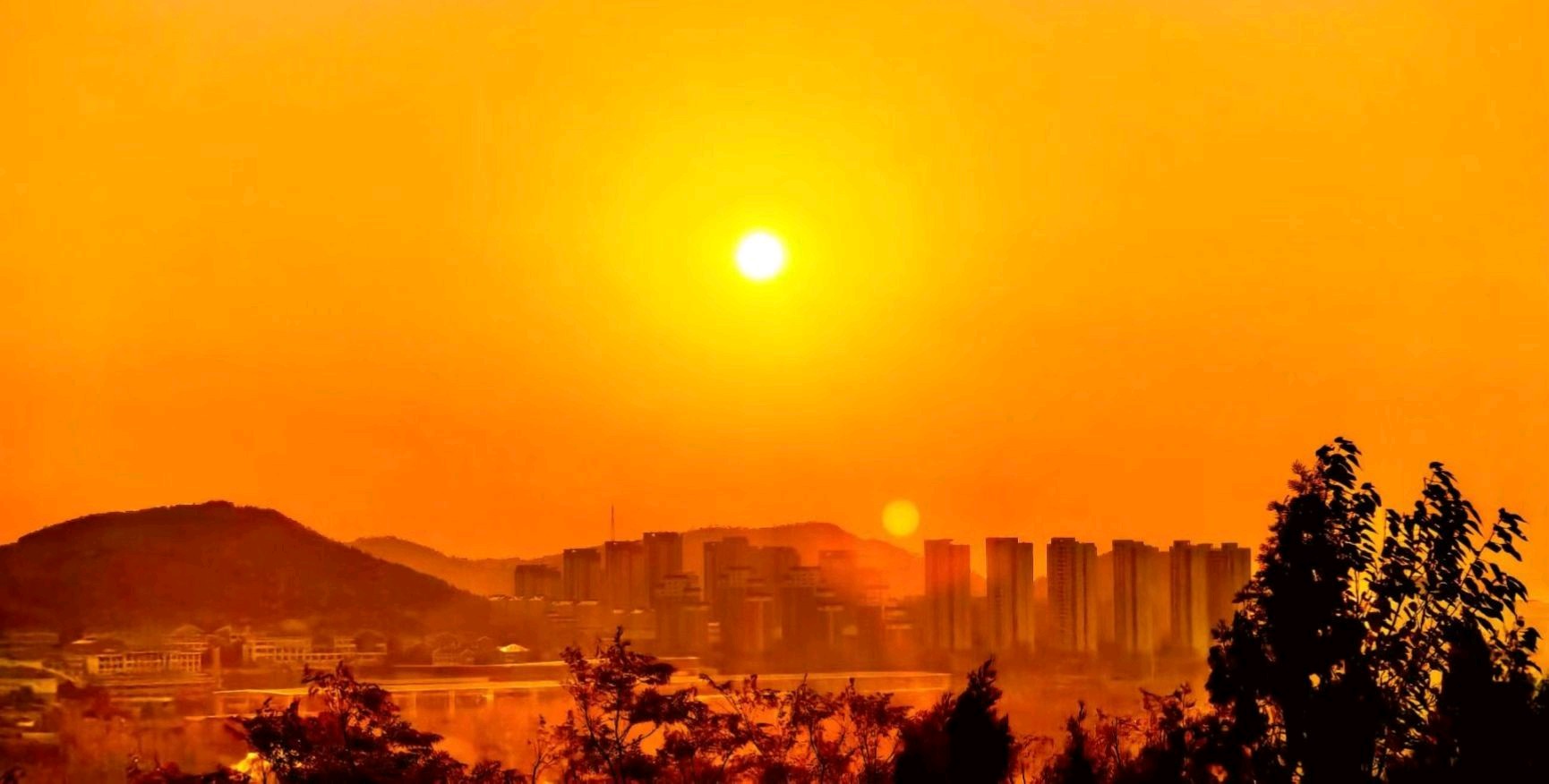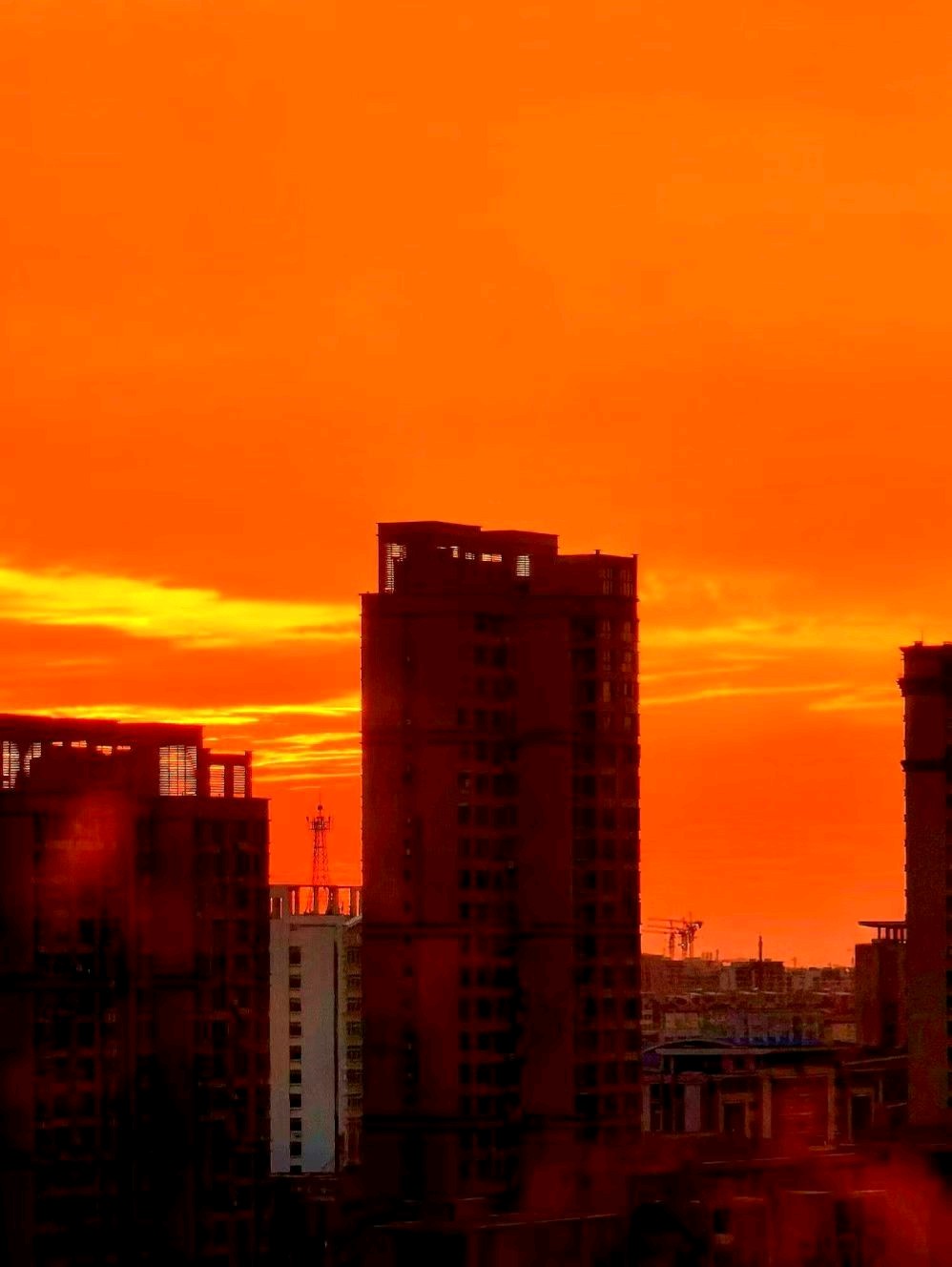 橙色的落日余晖洒在宁静的河面上,高楼林立的都市与金黄色的天空交相辉映,美得如同一幅画卷。