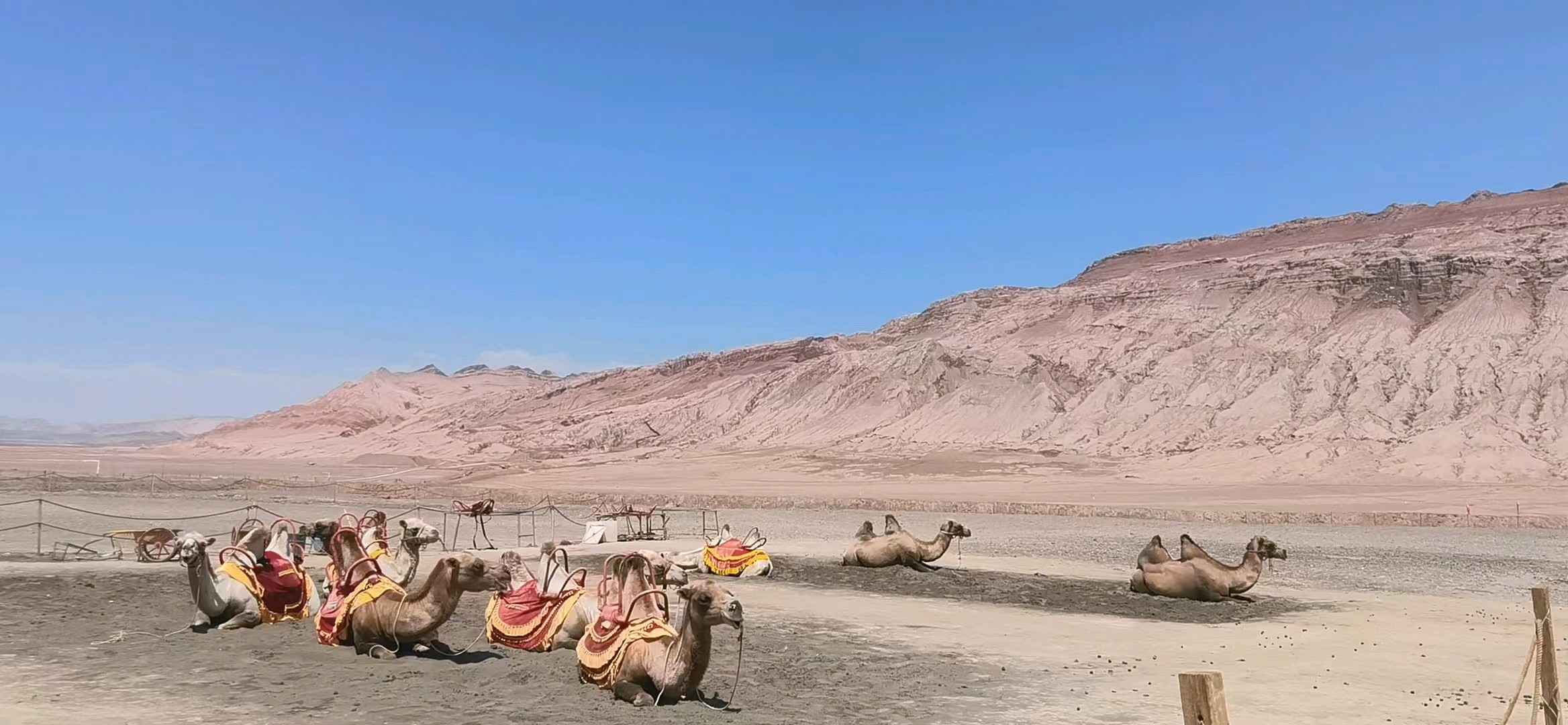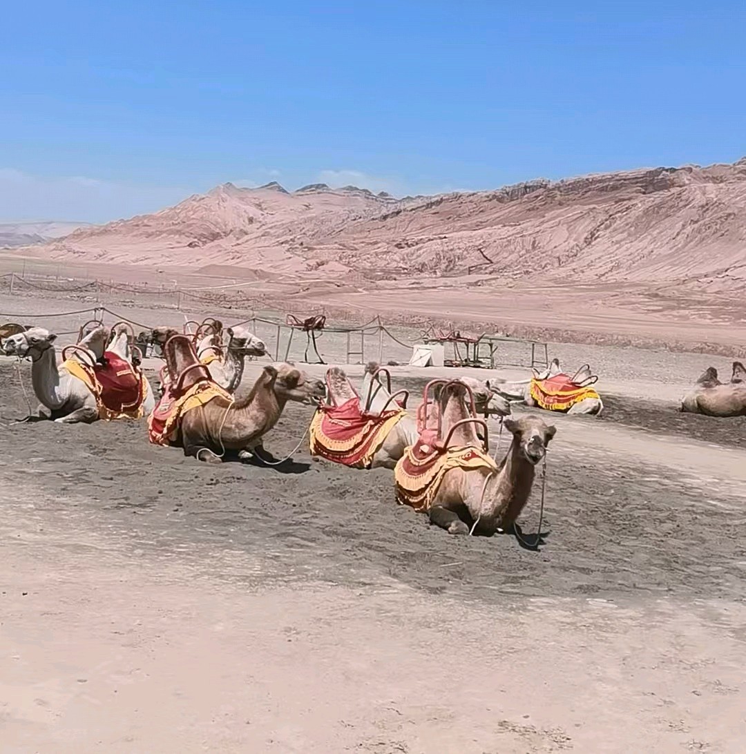 今天是大暑的第二天,我们到了火焰山打卡地,地表温度高达55度。在沙漠中寻找宁静,骆驼们找到了这片净土。 躺在沙地上,享受着阳光的温暖。 远处是连绵的山脉,近处是悠闲的骆驼。 生活是如此美好,让我们一起感受大自然的魅力。