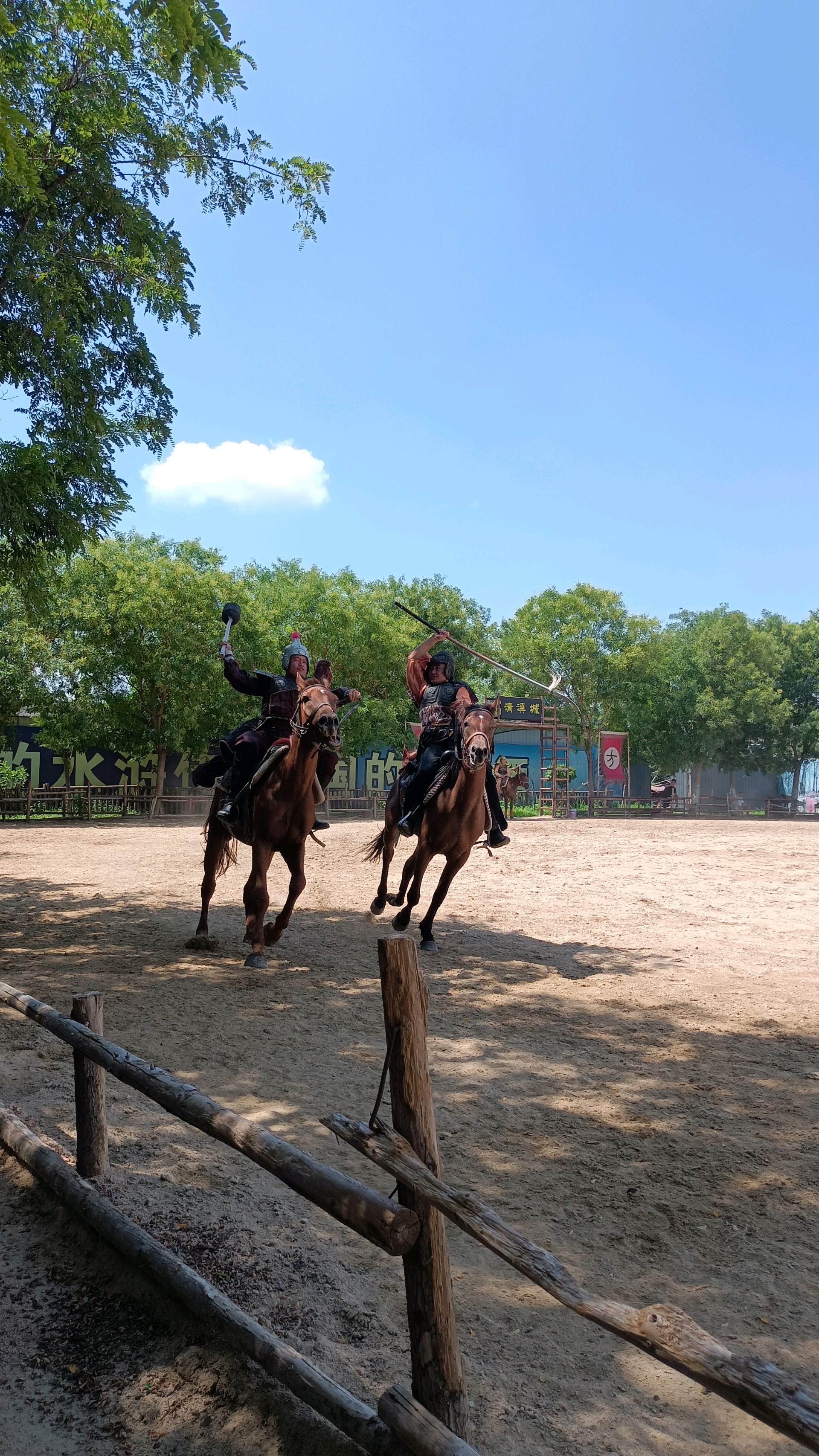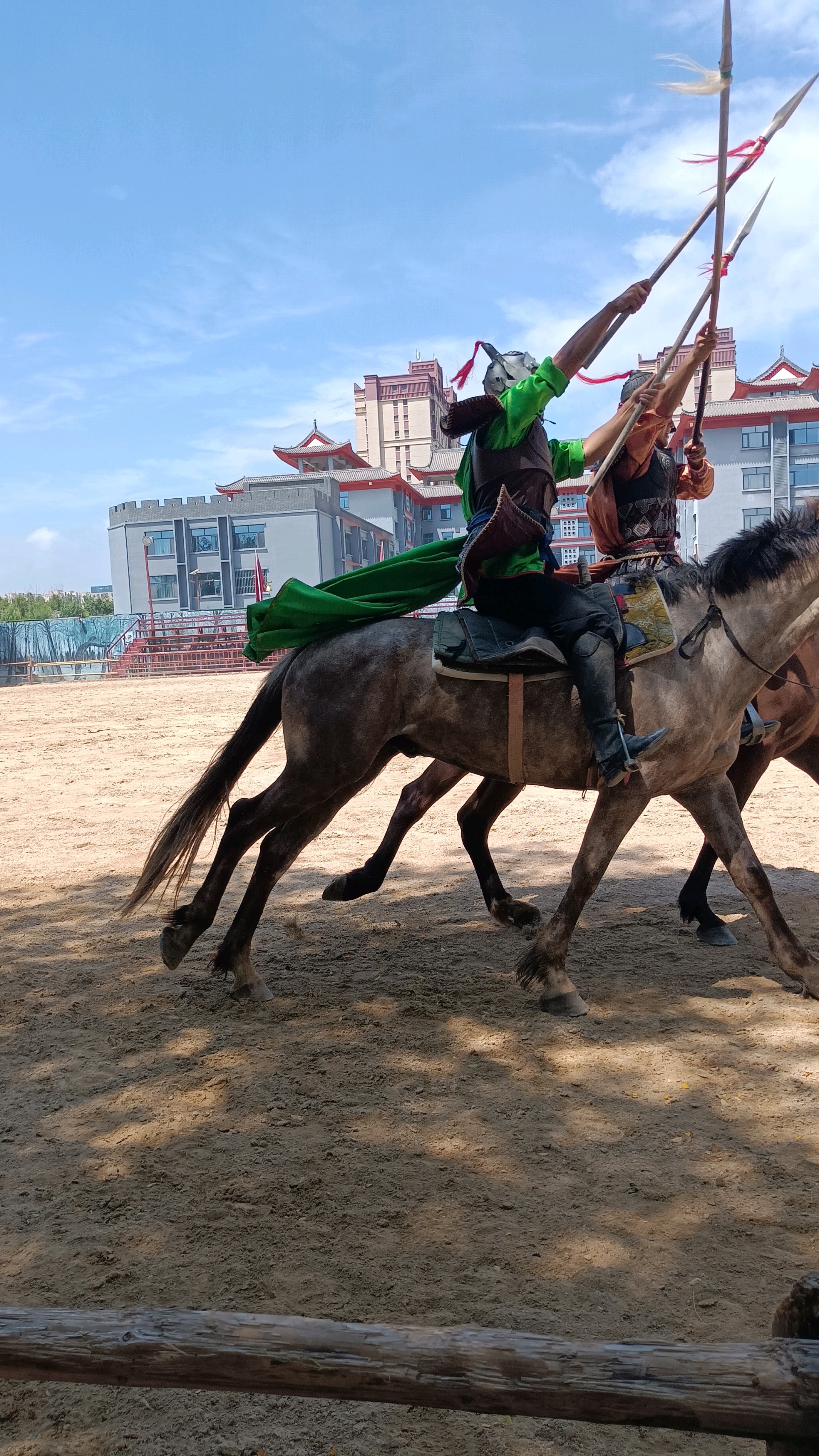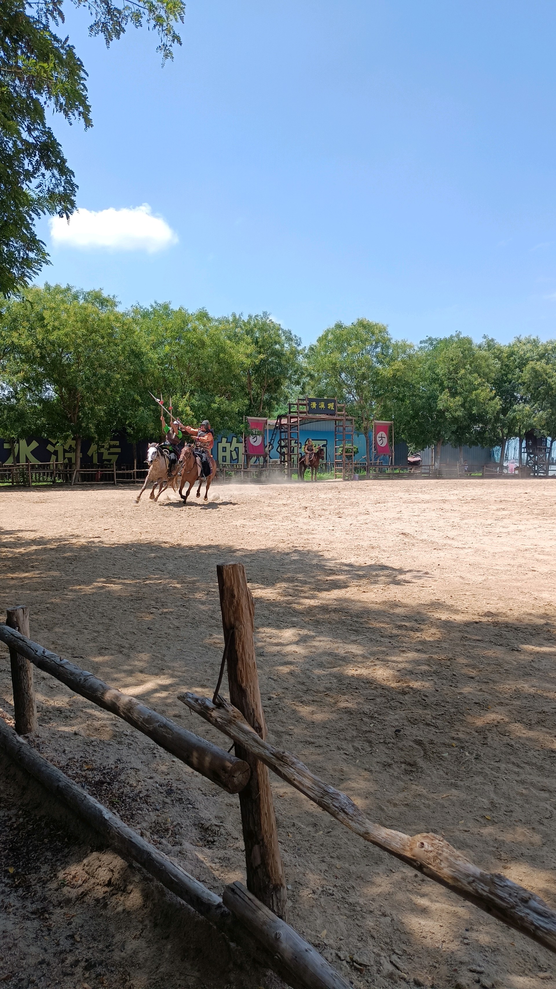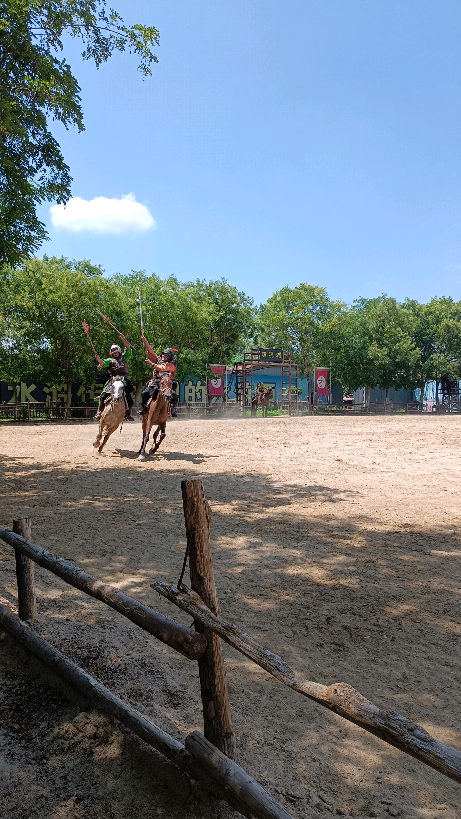 在郓城的水浒好汉城看宋江擒方腊表演,沙场上一匹匹战马驰骋而至,宋江兵和方腊兵打成一团。一番激战以宋江擒方腊获胜,场面宏大,演出精彩,给参观者一个完美的视觉盛宴。