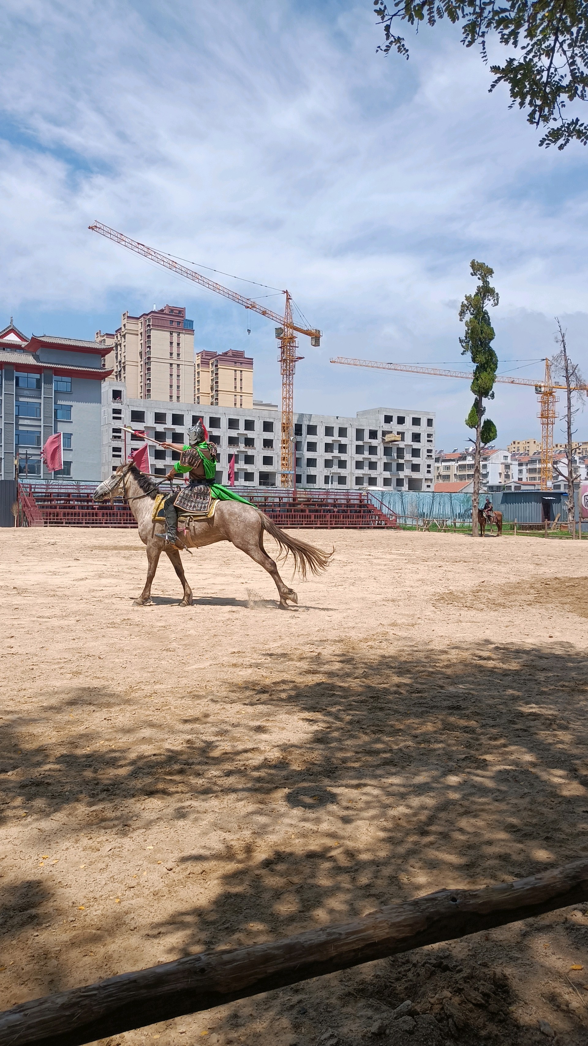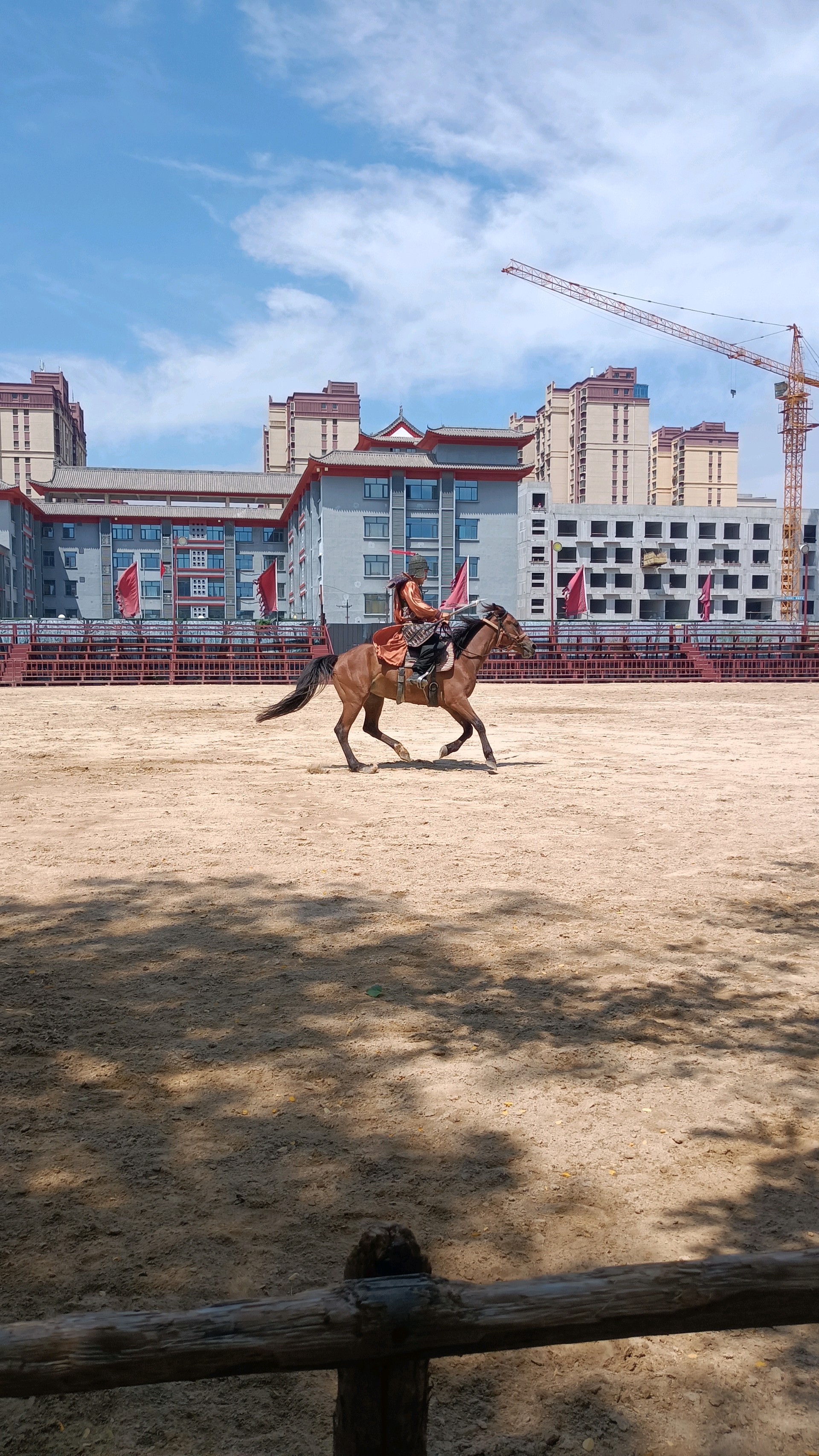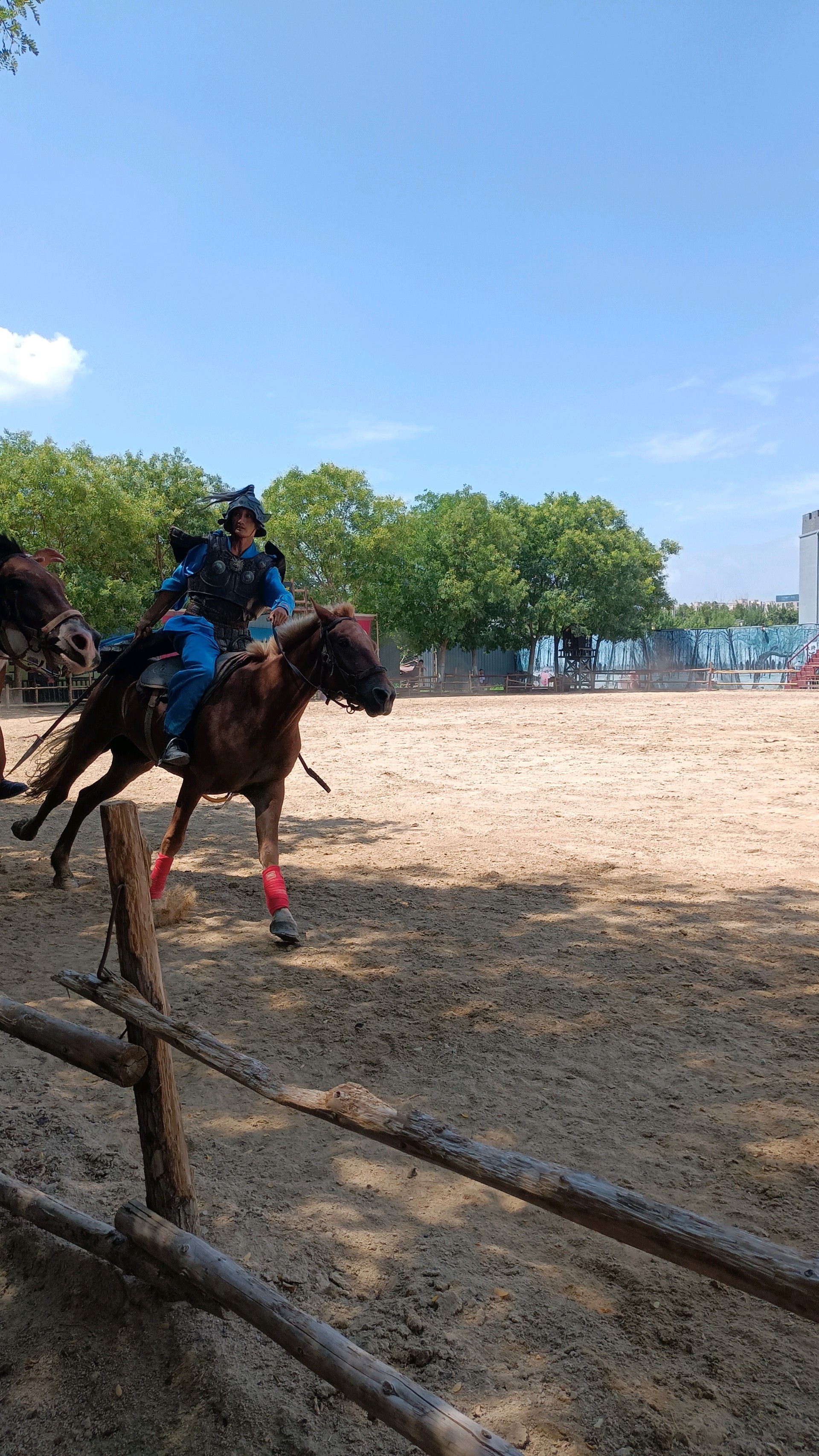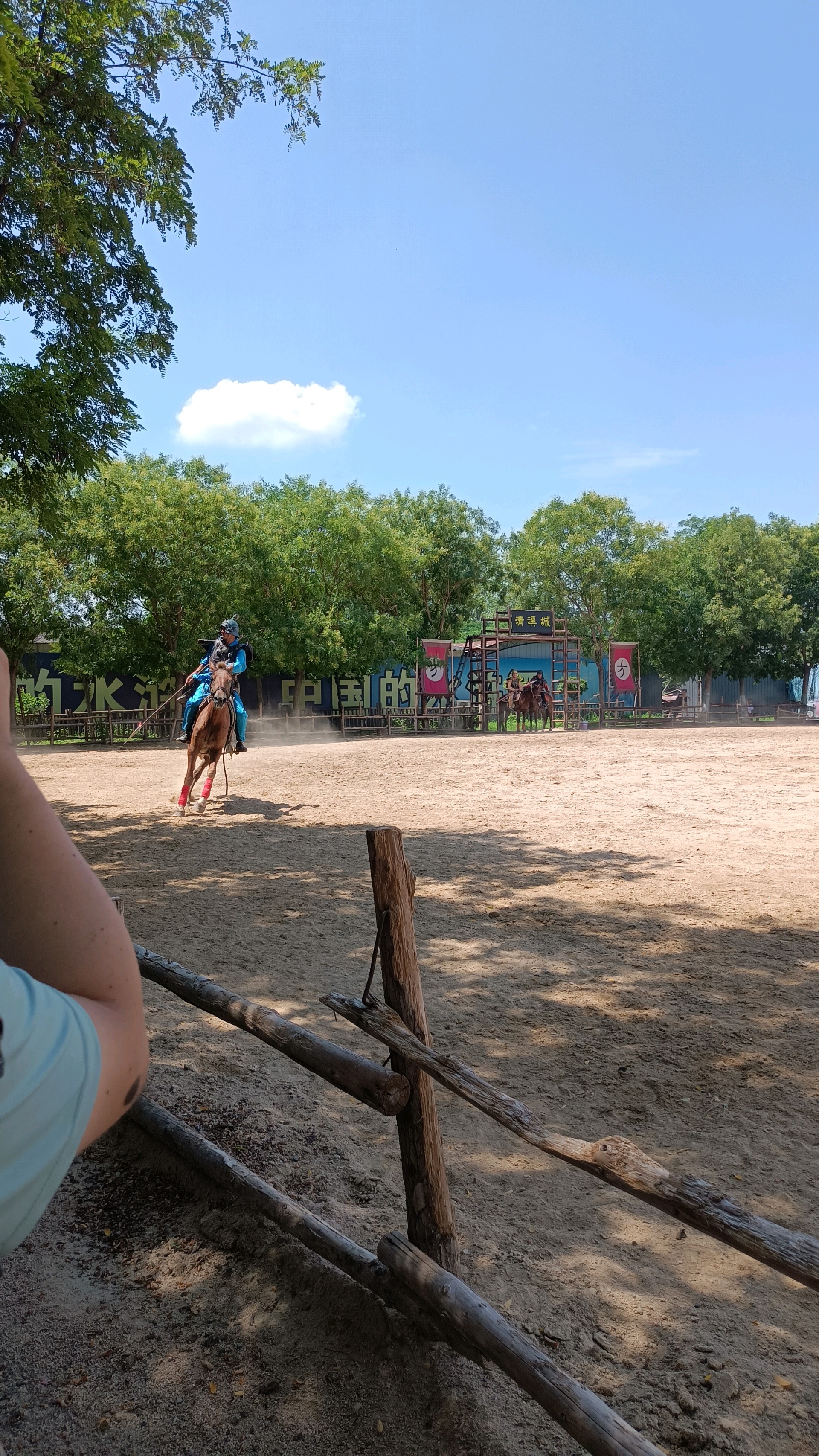 在郓城的水浒好汉城看宋江擒方腊表演,沙场上一匹匹战马驰骋而至,宋江兵和方腊兵打成一团。一番激战以宋江擒方腊获胜,场面宏大,演出精彩,给参观者一个完美的视觉盛宴。