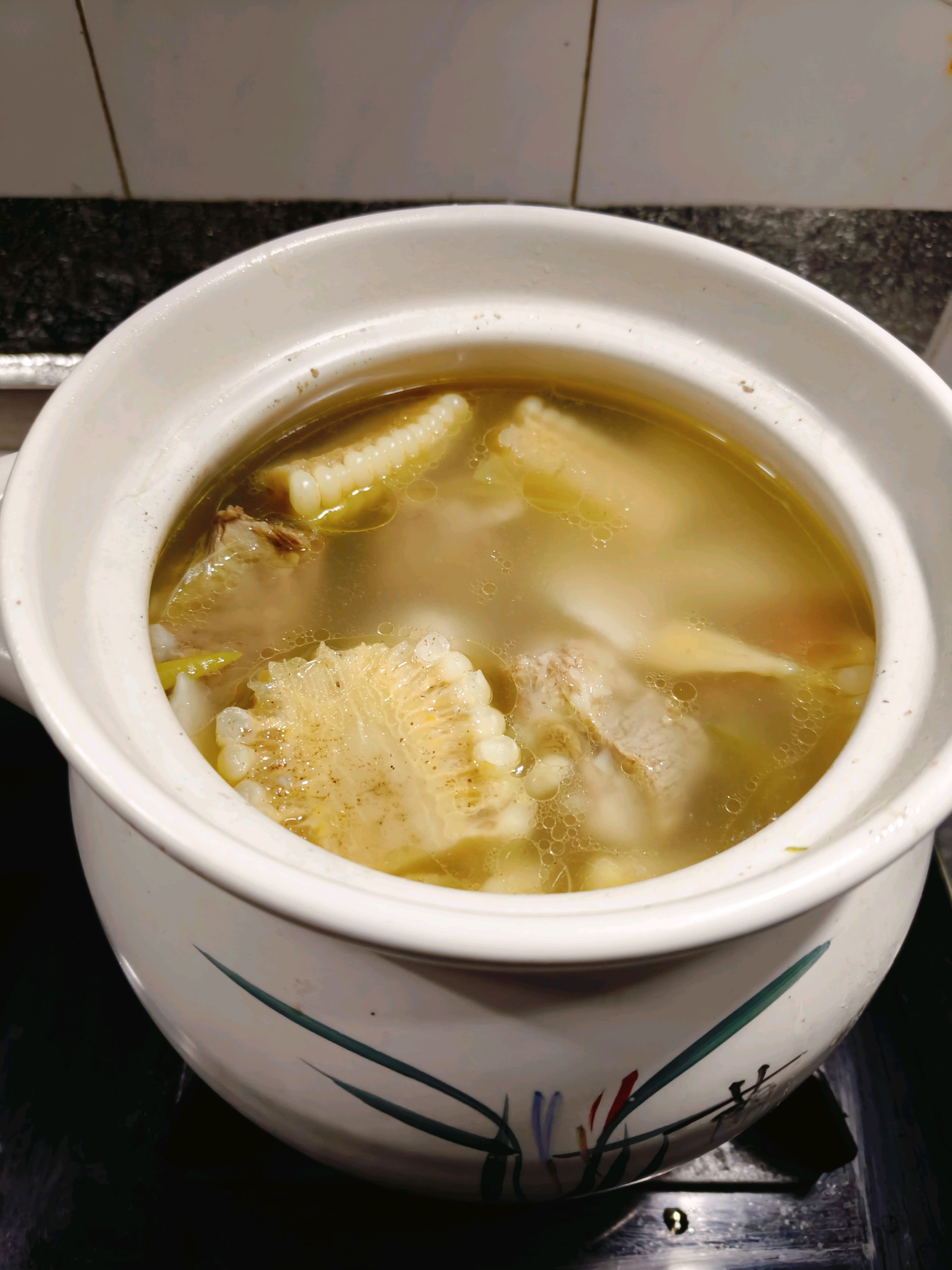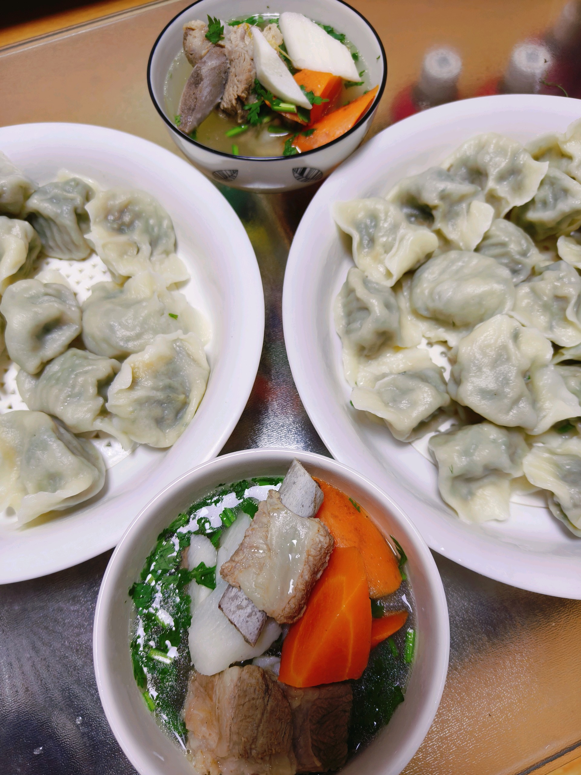 今天的晚餐,排骨炖山药,胡萝卜,玉米,藿香苗水饺,味道都特好吃。