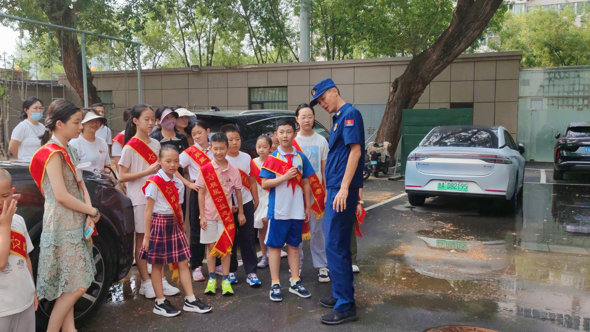 聆听消防员讲解安全知识,努力做一名合格的小消防员宣传员,加油
